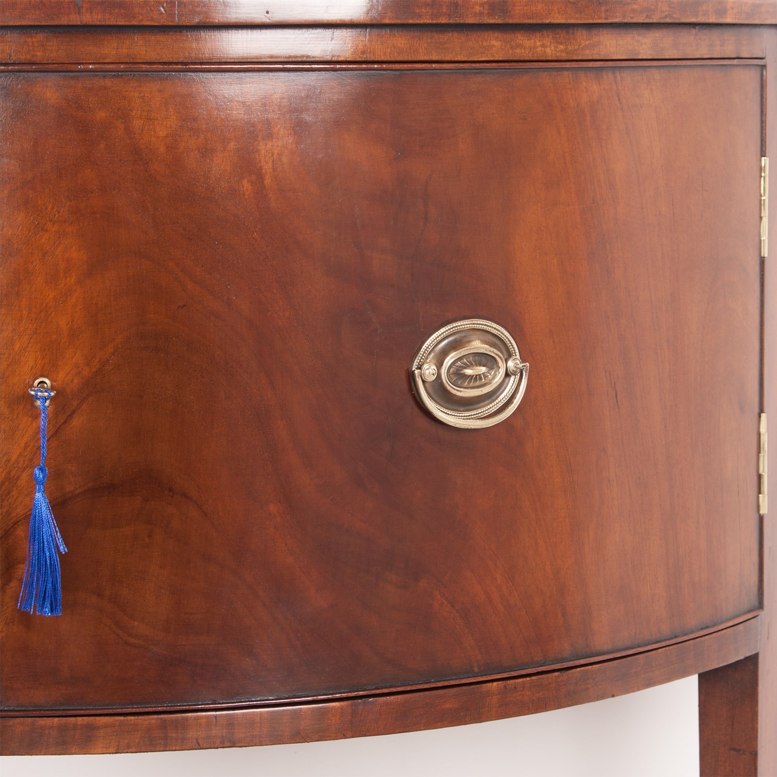 The Figured Mahogany to the front works so well with the polished brass fittings. The top offers a generous amount of display area. Standing on tapered legs that terminate in a spade toe, with the generously shaped apron adding further design interest. The free running drawer is oak lined and nicely dovetailed.