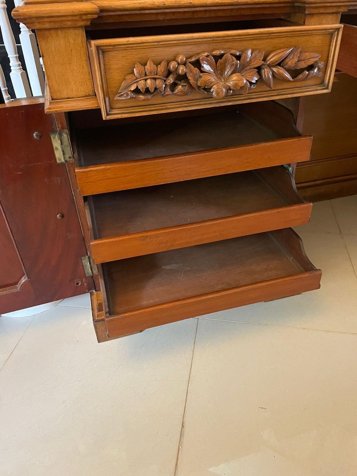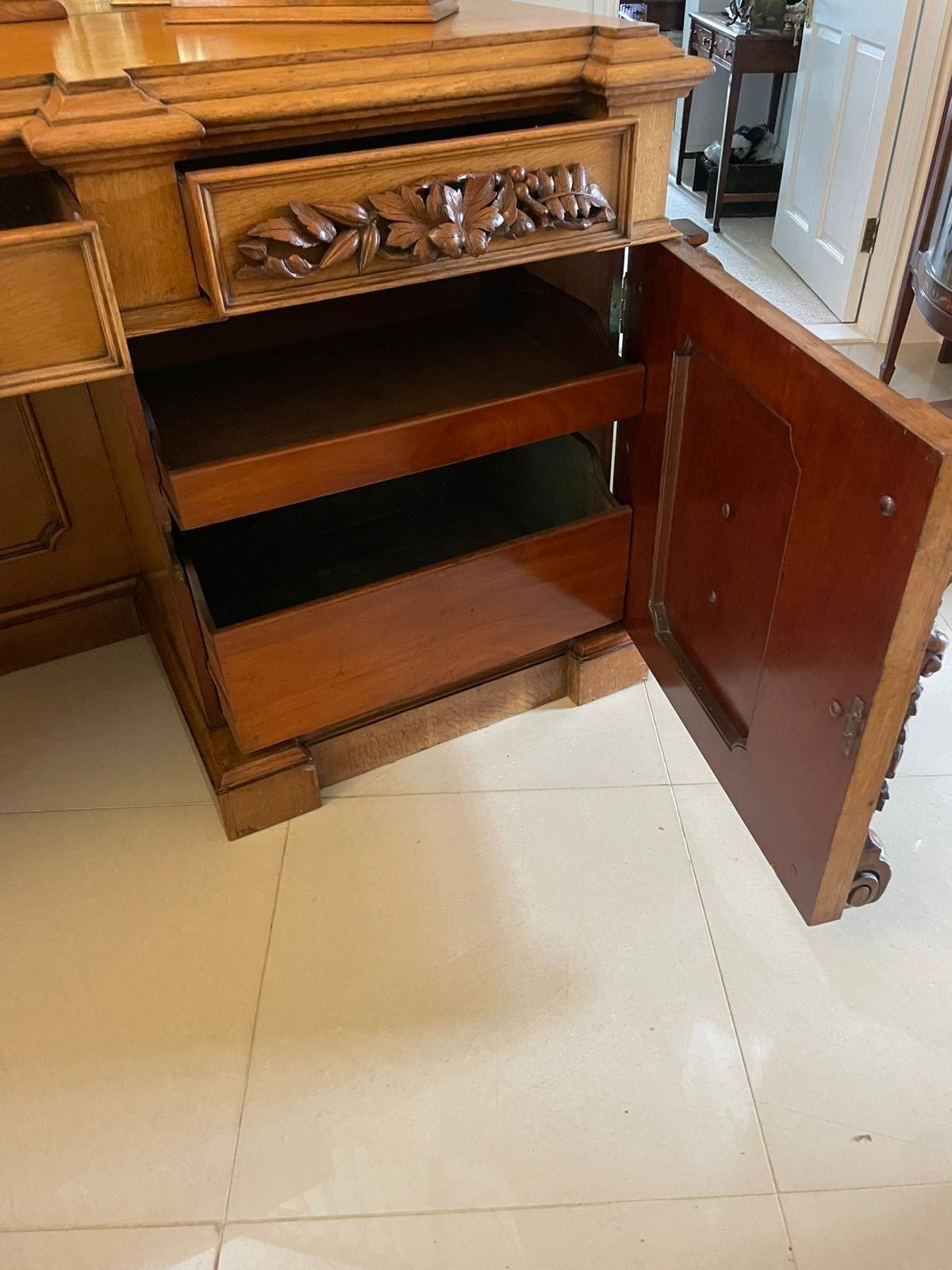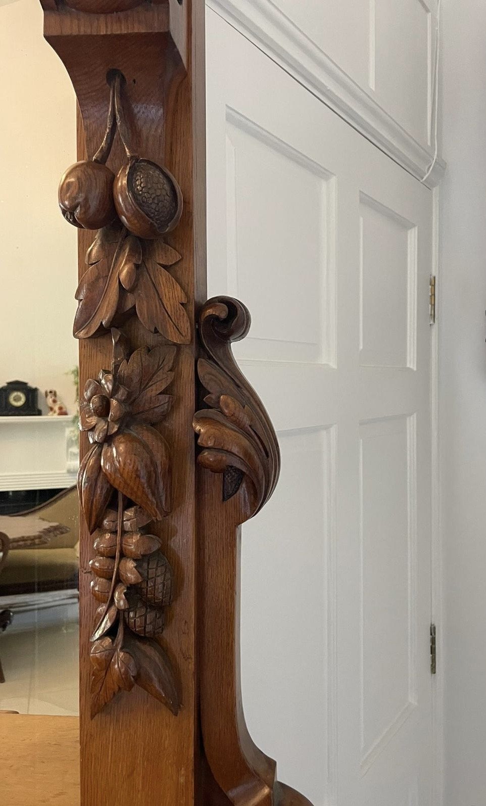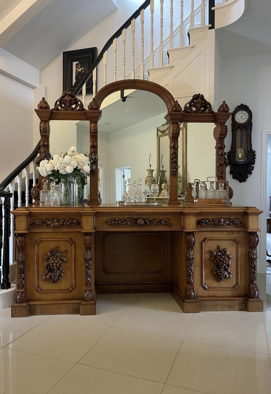 Magnificent Victorian antique carved oak mirror back sideboard having an impressive large mirror back with beautifully carved pears, apples and fruits above three glorious carved frieze drawers, two cupboard doors with carved grapes to the centre opening to reveal two sliding trays and two sliding drawers standing on a plinth base. All of the drawers and trays can be removed if required