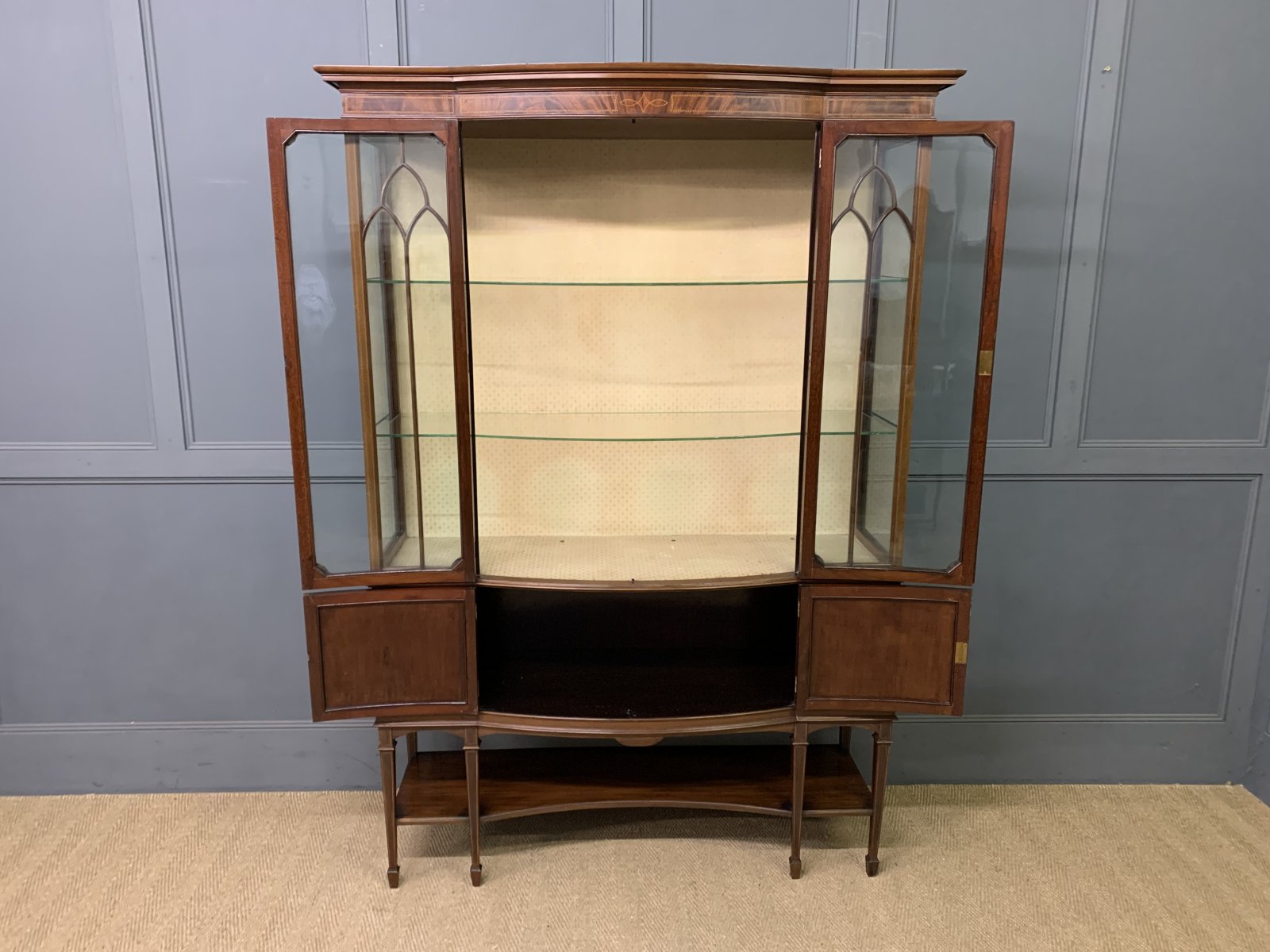 A good quality Edwardian period display cabinet by Maple & Co of London. Well constructed in mahogany and decorated with inlaid detailing throughout. With a pair of bow fronted glazed doors over a pair of cupboard doors. All doors are lockable (keys supplied). The glazed doors open to access a shelf and lined interior which affords ample display space. All standing on square tapering legs united by an under-tier. Cleaned and waxed in our workshops and offered for sale in very good original condition. Some fading to the cupboard doors. Bears original retailers label and marks to the rear. Contents not included.