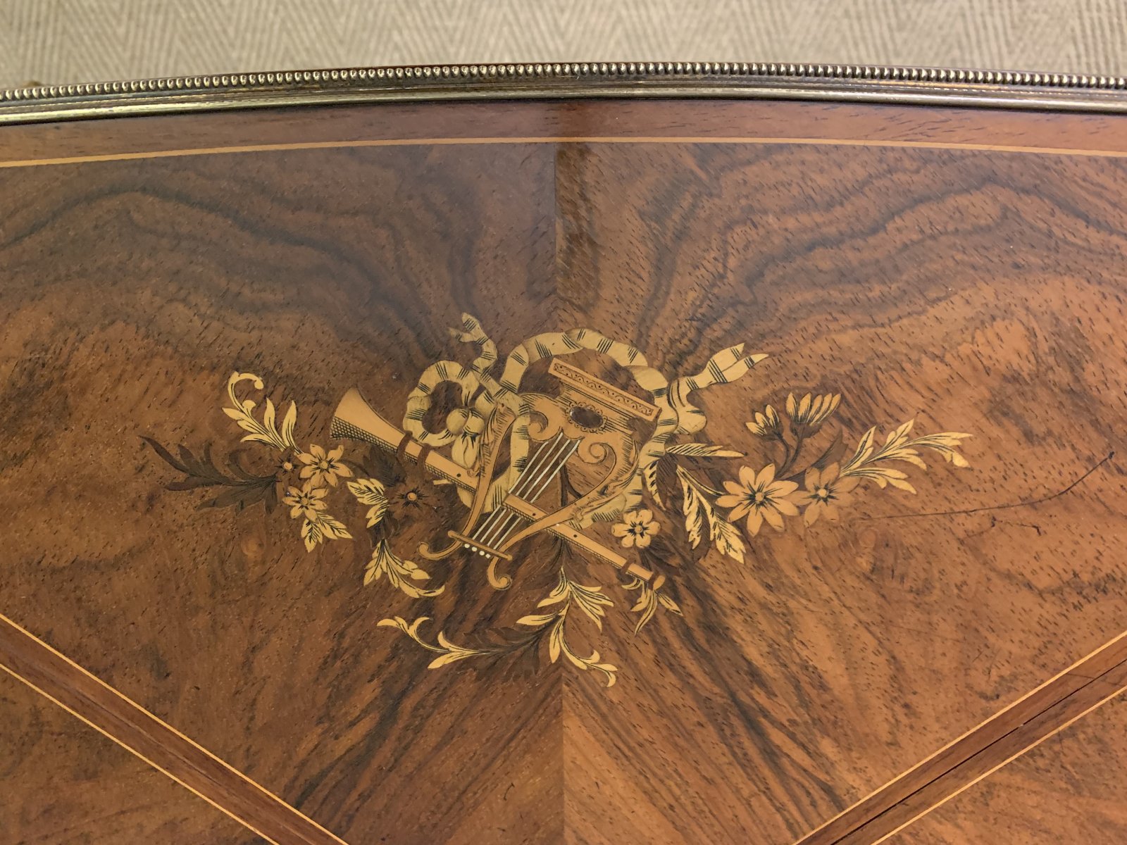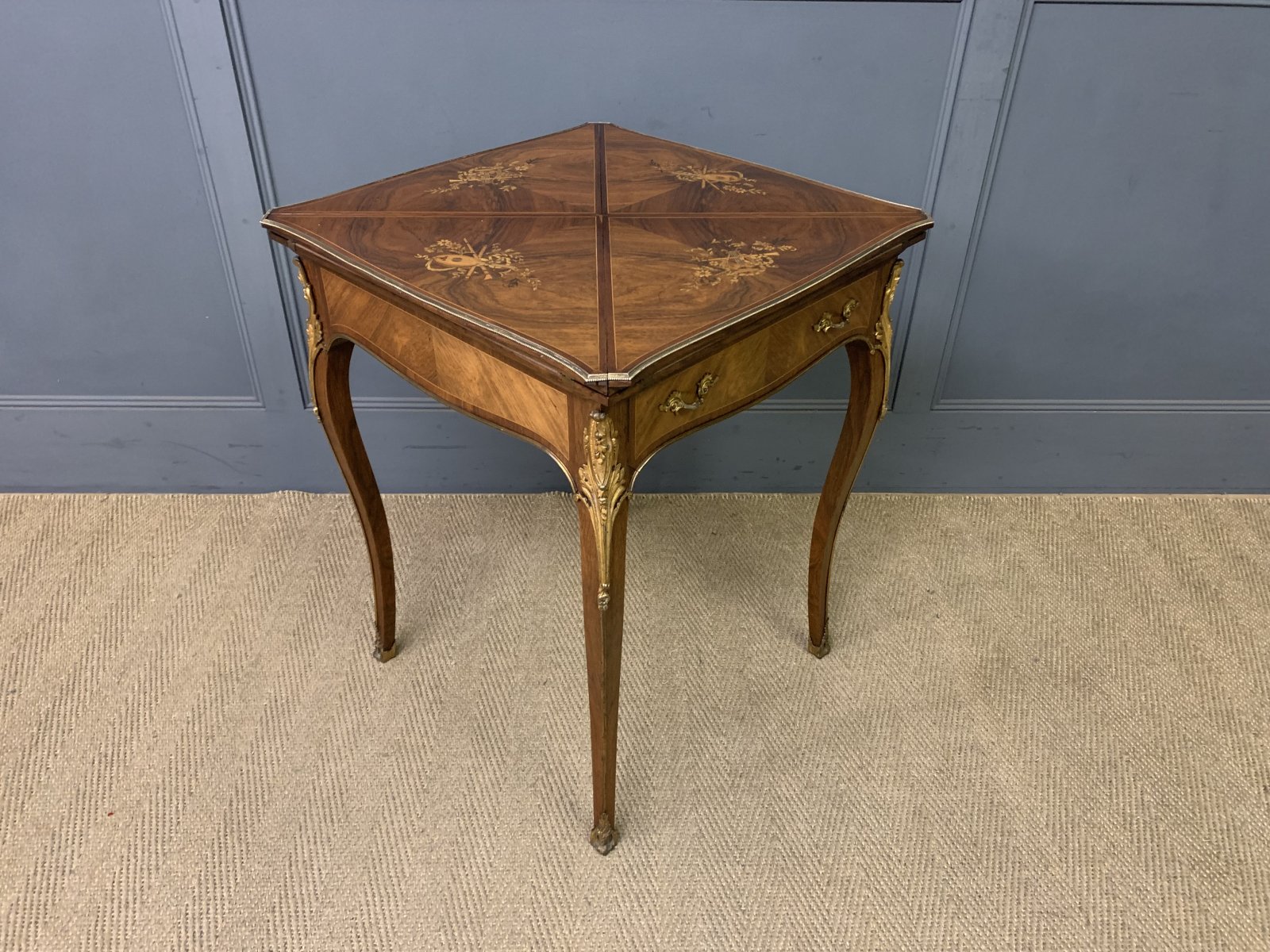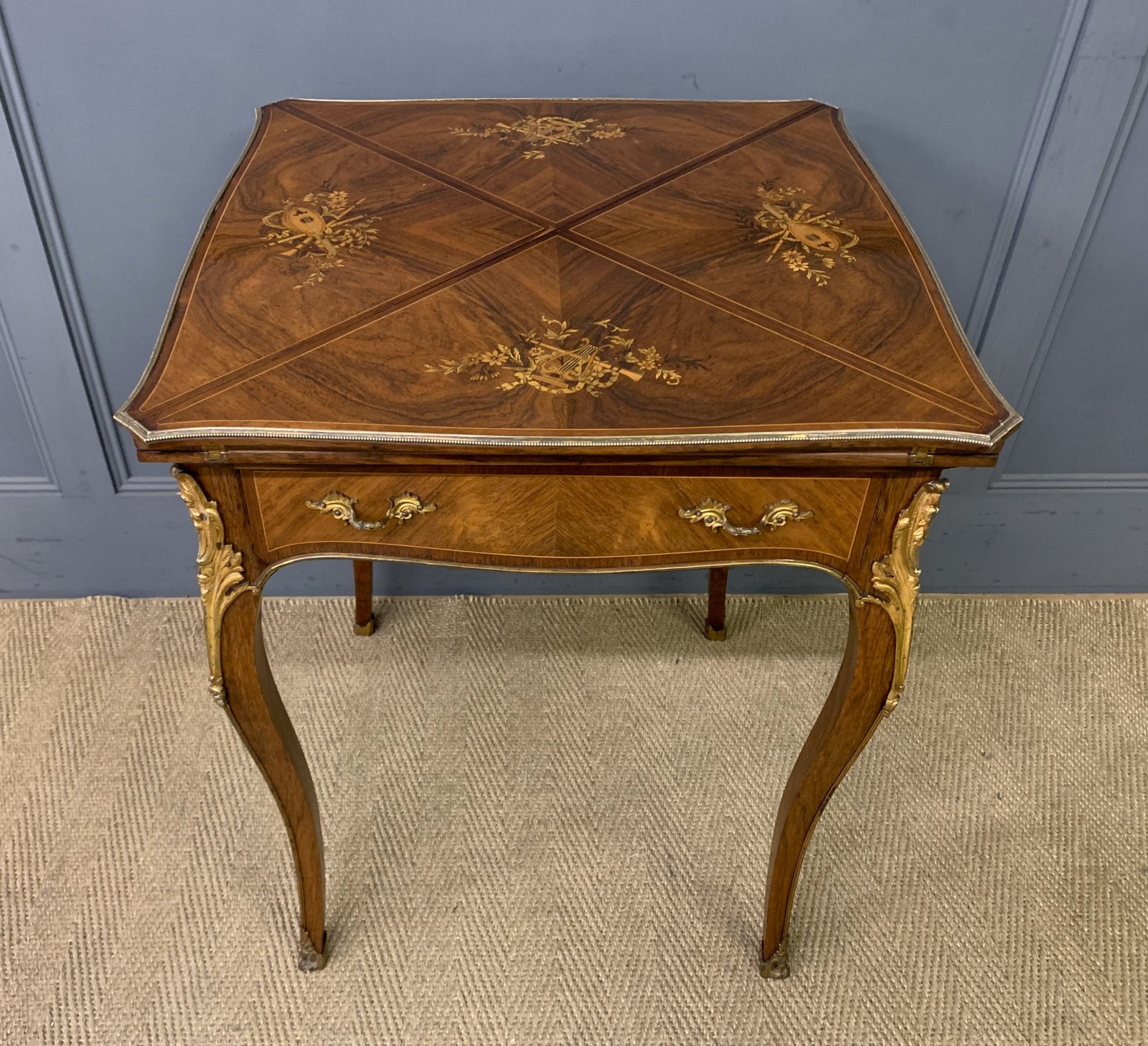 A fine quality late 19th century inlaid rosewood games , or card, table by Maple & Co. of London. Very well constructed in solid rosewood with attractive rosewood veneers onto a solid mahogany carcas. With a single drawer to the front and standing on elegant cabriole legs. Decorated throughout with crisply cast ormolu mounts. The top is decorated with profuse inlaid detailing of musical scenes in satinwood and boxwood. The top rotates and opens to reveal a baise lined playing surface. Cleaned and waxed in our workshops and now offered for sale in excellent overall original condition. The original baise is in-situ , it bears some staines and marks.