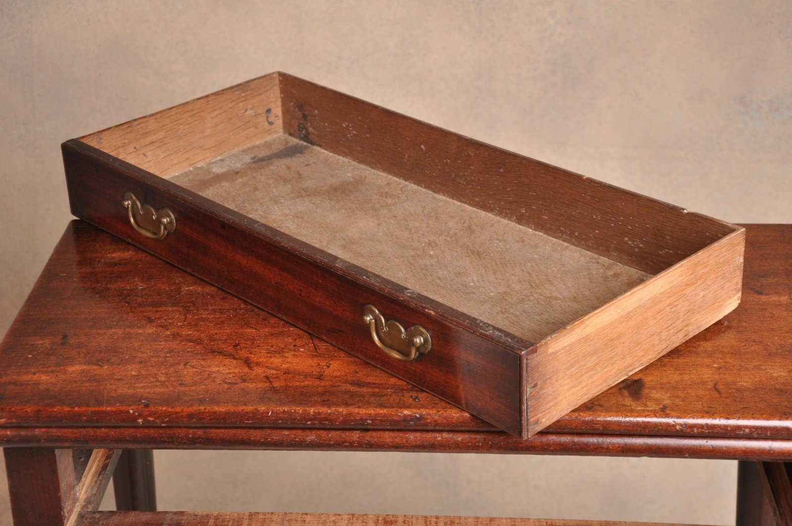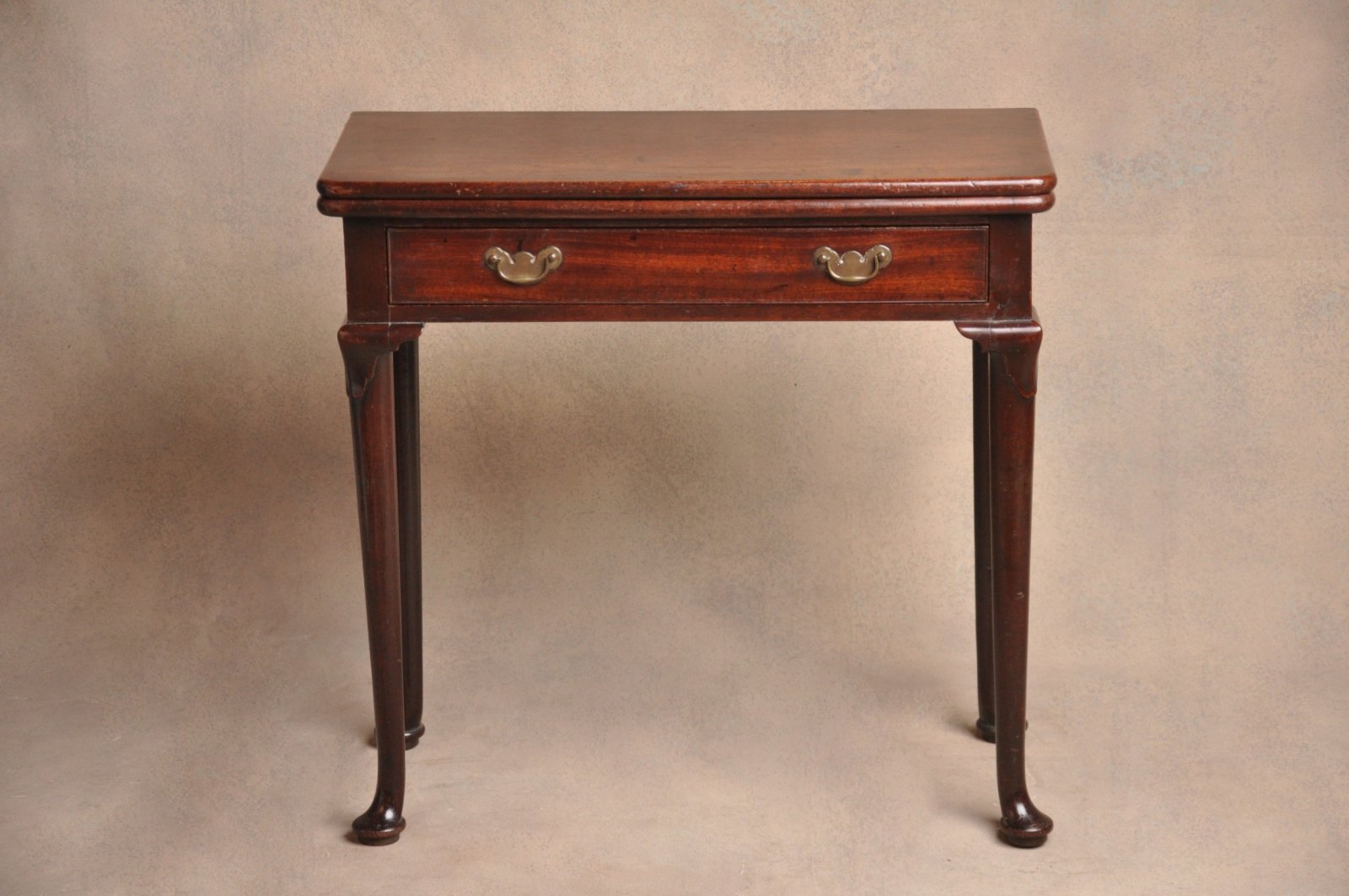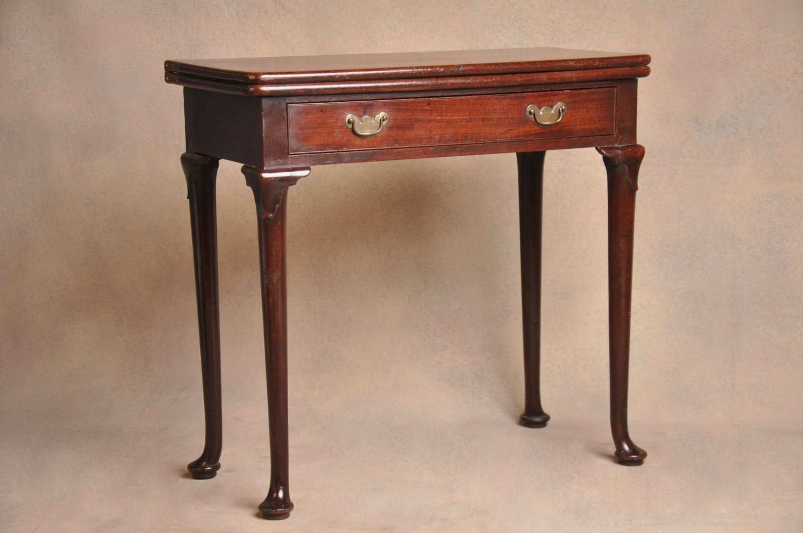 A delightful and elegant mid 18th Century Mahogany Tea Table of outstanding rich warm colour and patina. The lappet knee is very well executed to compliment this well drawn piece. The table has wonderful untouched original handles and the overall condition is superb with clean oak drawer linings. A piece that has obviously been well cared for over the years and lovingly polished.
