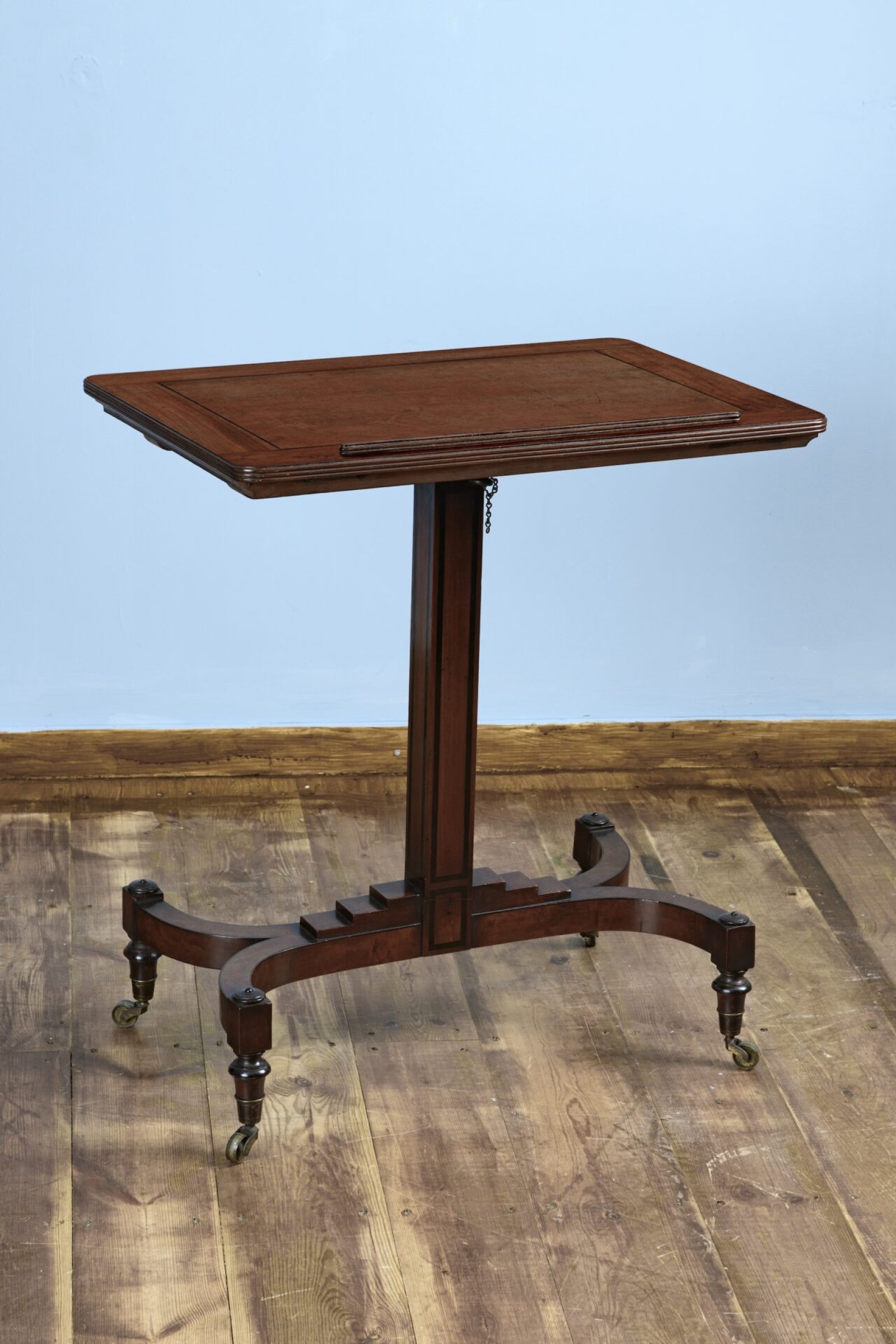 The metamorphic top with fine reeded edges sits above the original gilt brass collar moulding and a gilt brass pin. The mahogany support is pierced with several holes to allow various heights reaching a maximum height of 102.00 cm. The mahogany and ebony inlaid pedestal is finished to all four sides and conceals the metamorphic column when the music stand is at its lowest point of 75.00 cm.