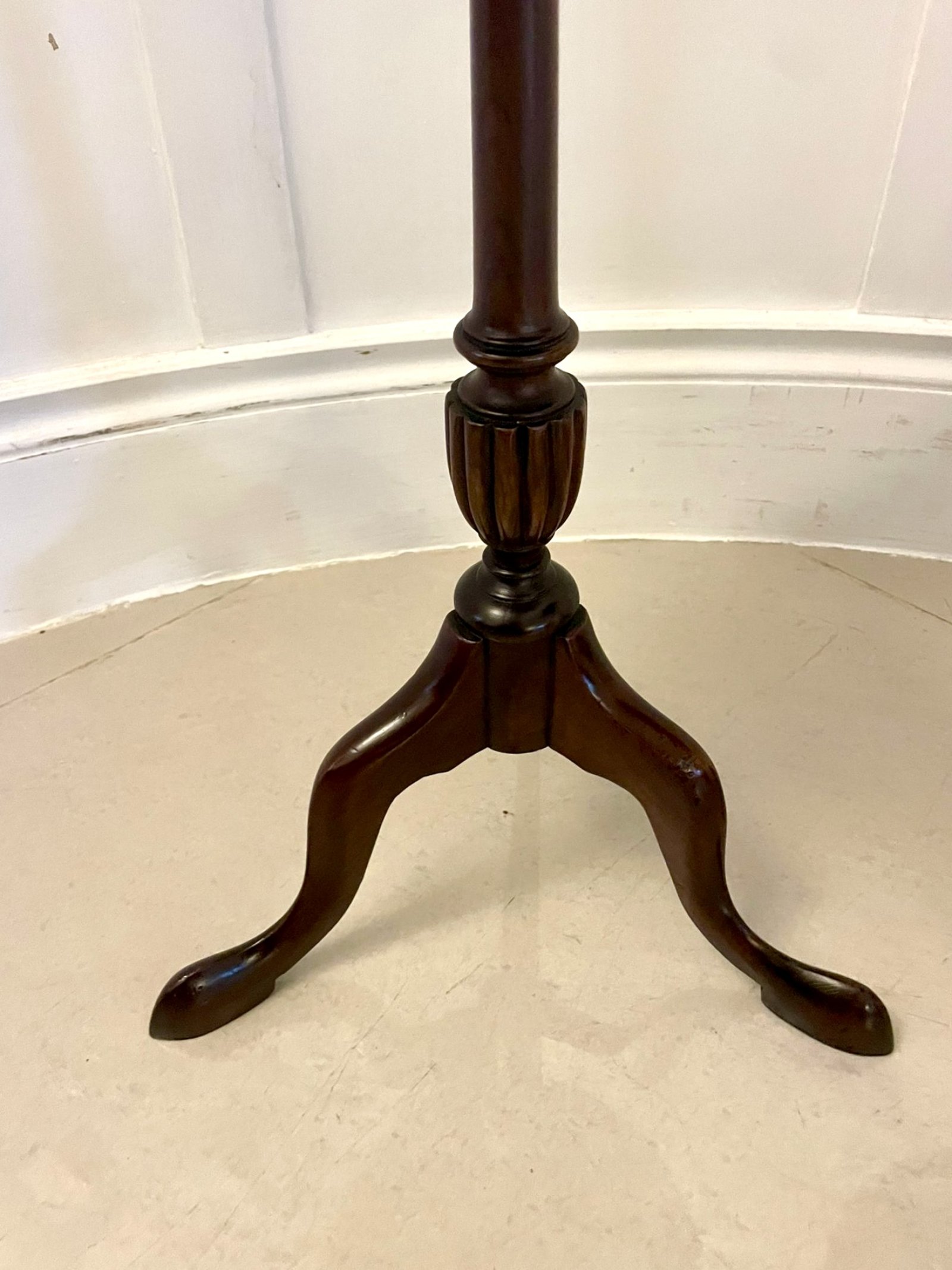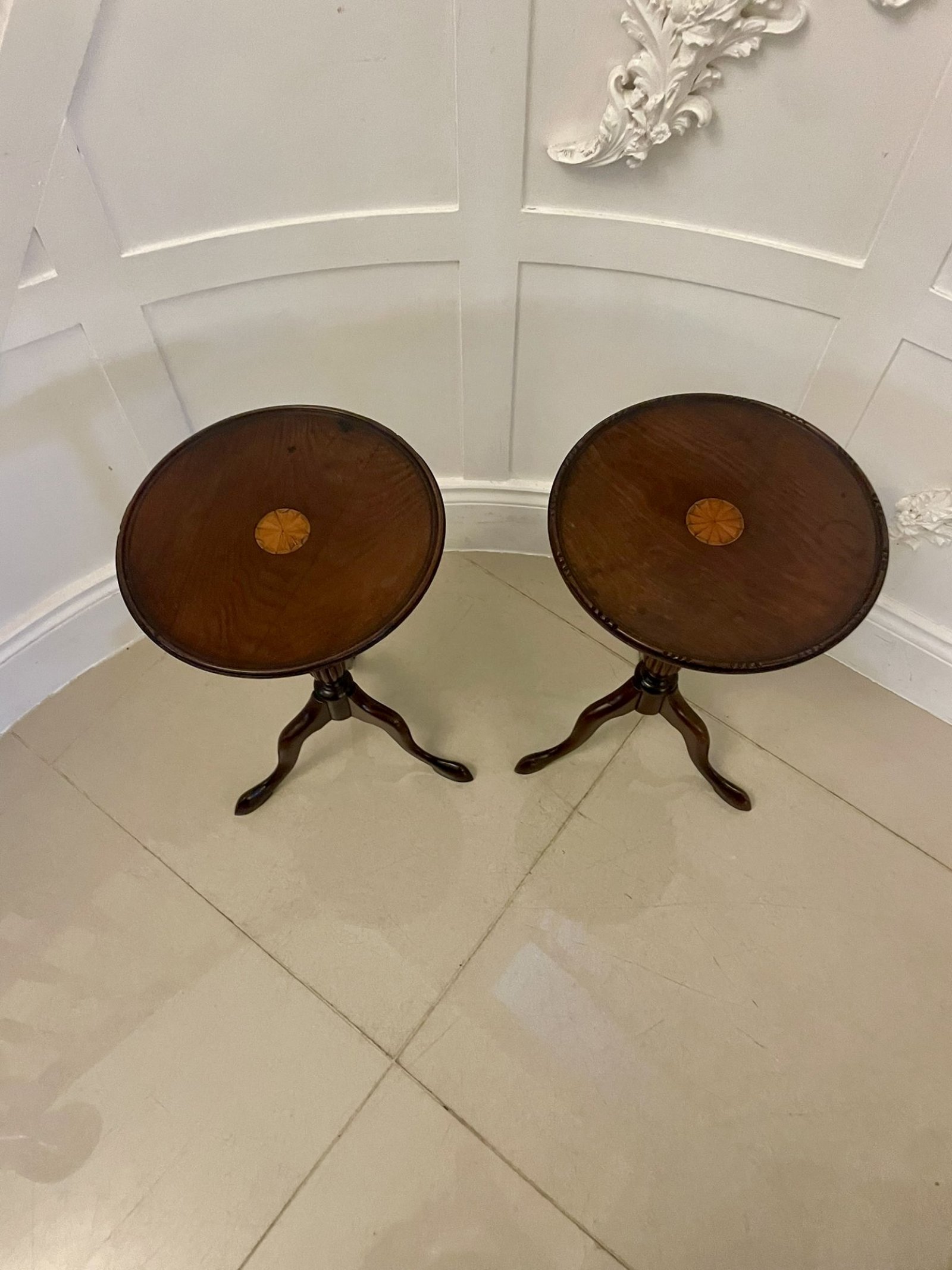 Near pair of antique Edwardian quality mahogany inlaid lamp tables having a quality circular mahogany top with a satinwood inlaid shell to the centre supported by a turned tapering carved mahogany pedestal column standing on three shaped cabriole legs