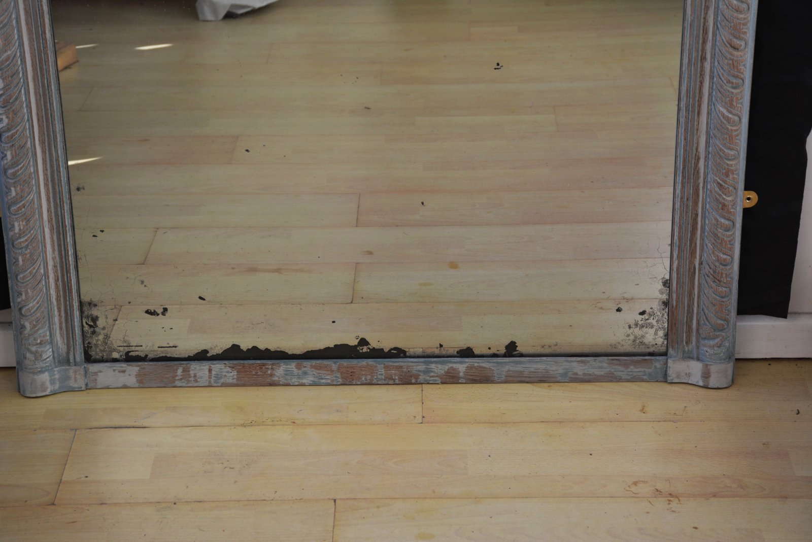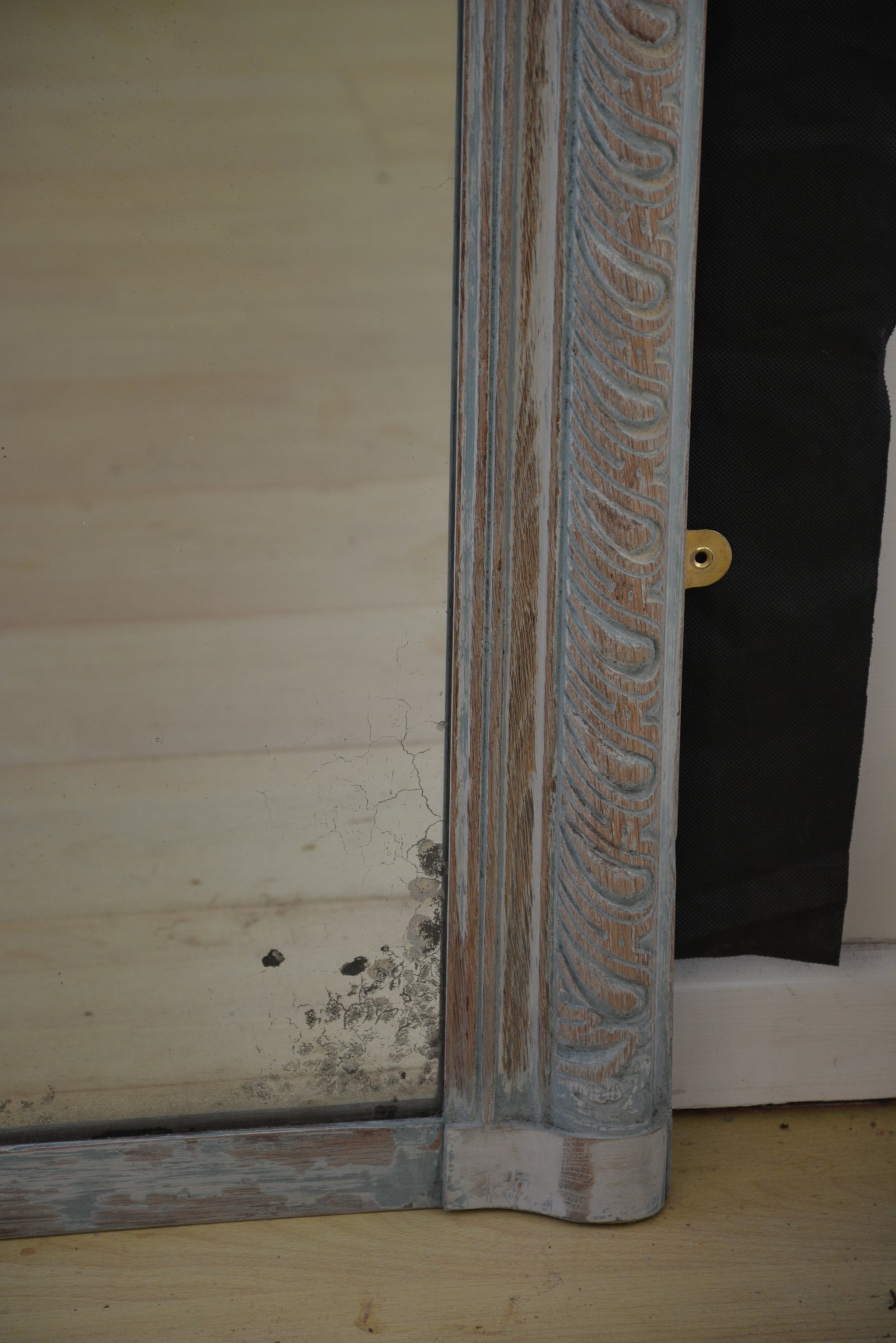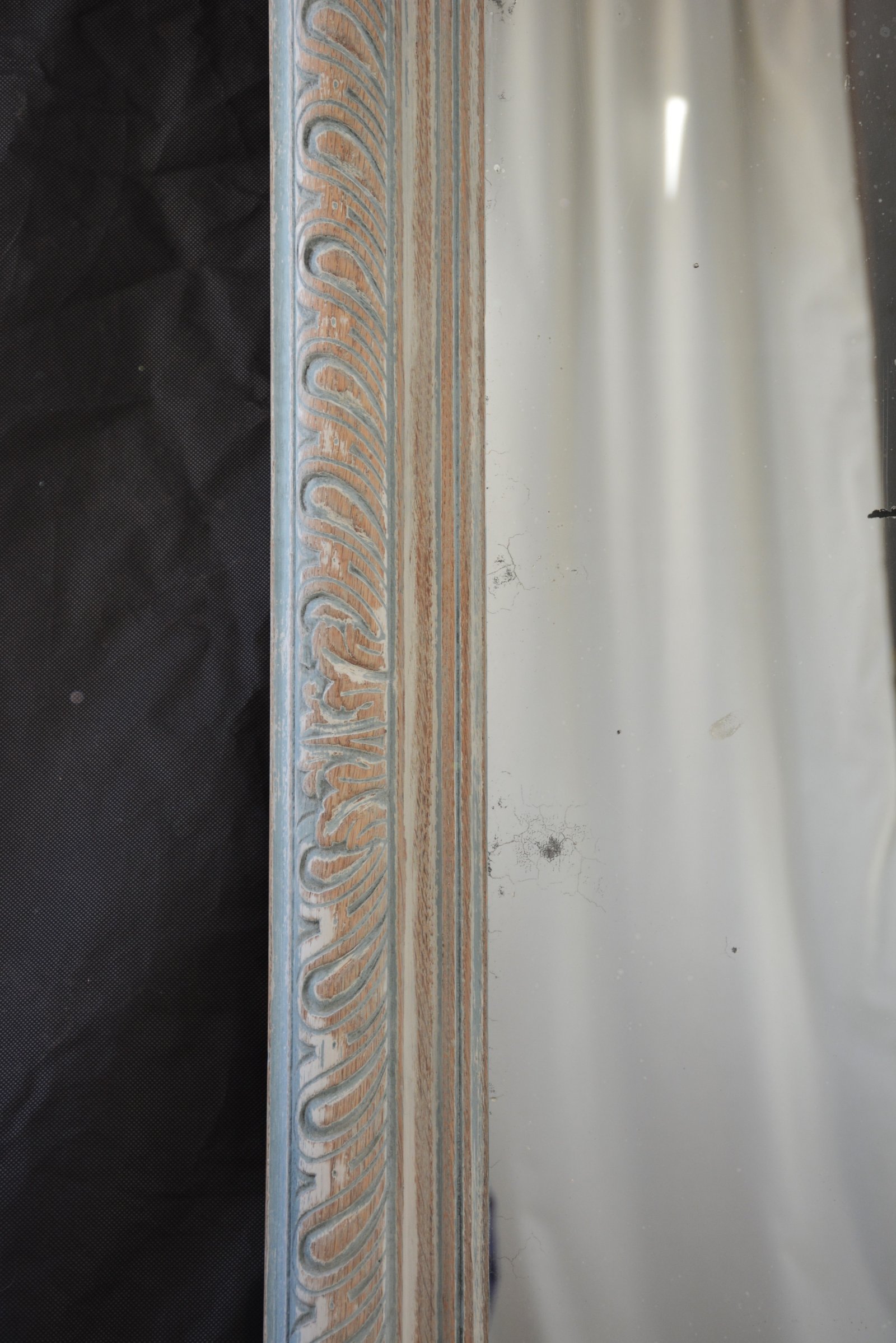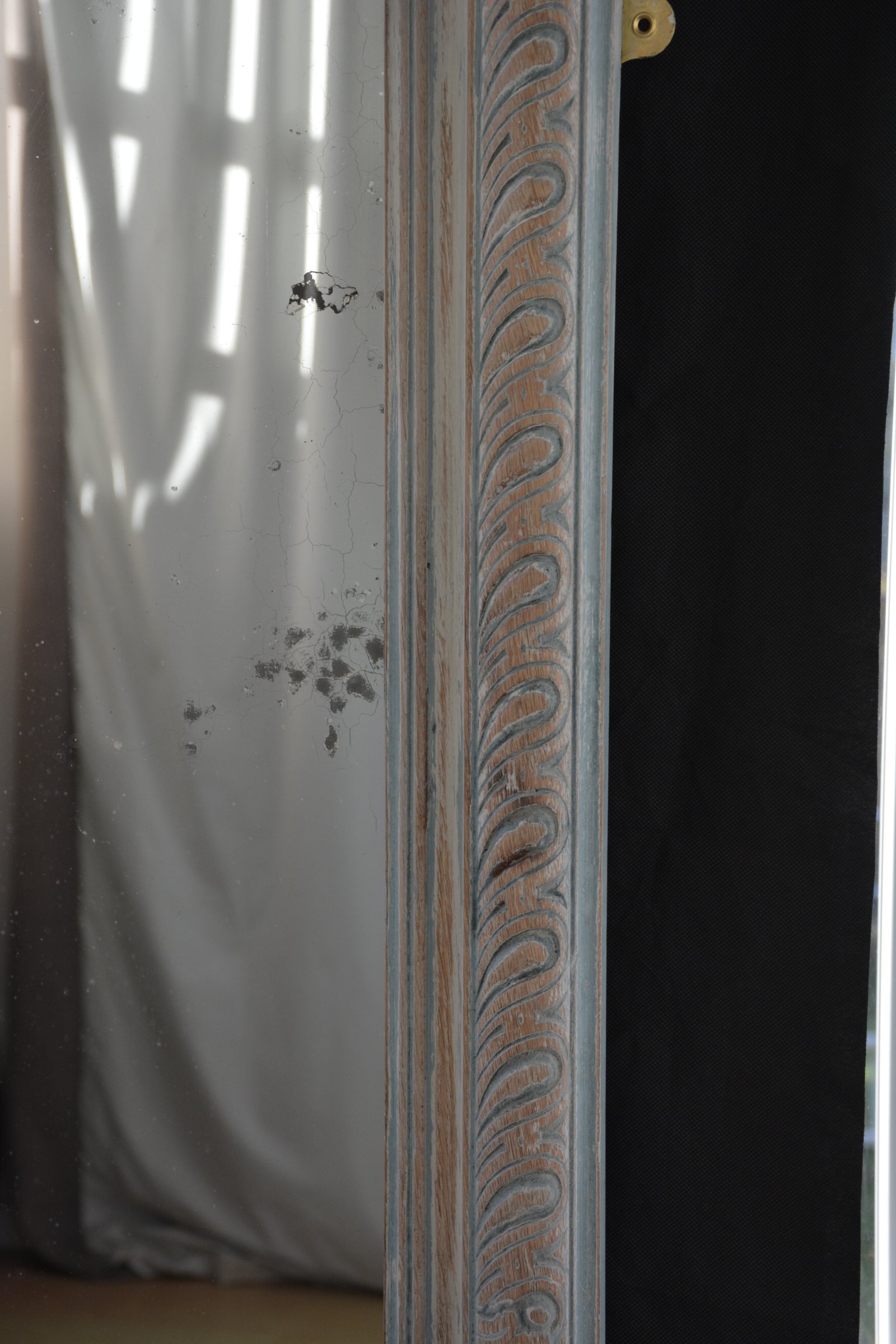 P0189 Large antique French country oak leaner mirror / wall mirror, having original glass with some silvering and imperfections in moulded and finely carved frame, depicting deeply lobed acanthus leaves. This motif originates in ancient Greece and Rome and is in widely used in antique frames. This antique mirror is carved in solid oak and is showing years of worn out paint which adds to its fabulous antique character. The the mirror has four wall fixing brackets, all in home ready condition. The mirror is solid and sturdy, woodworm free, no loses or missing elements. c1860