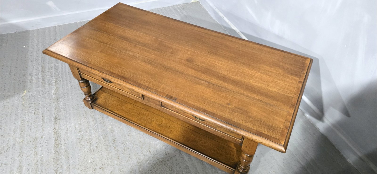 See shipping detailsA superb solid oak plank coffee table, in a lovely light oak colour, two drawers, and plank undertier, yew wood crossbanding, in overall very good condition.