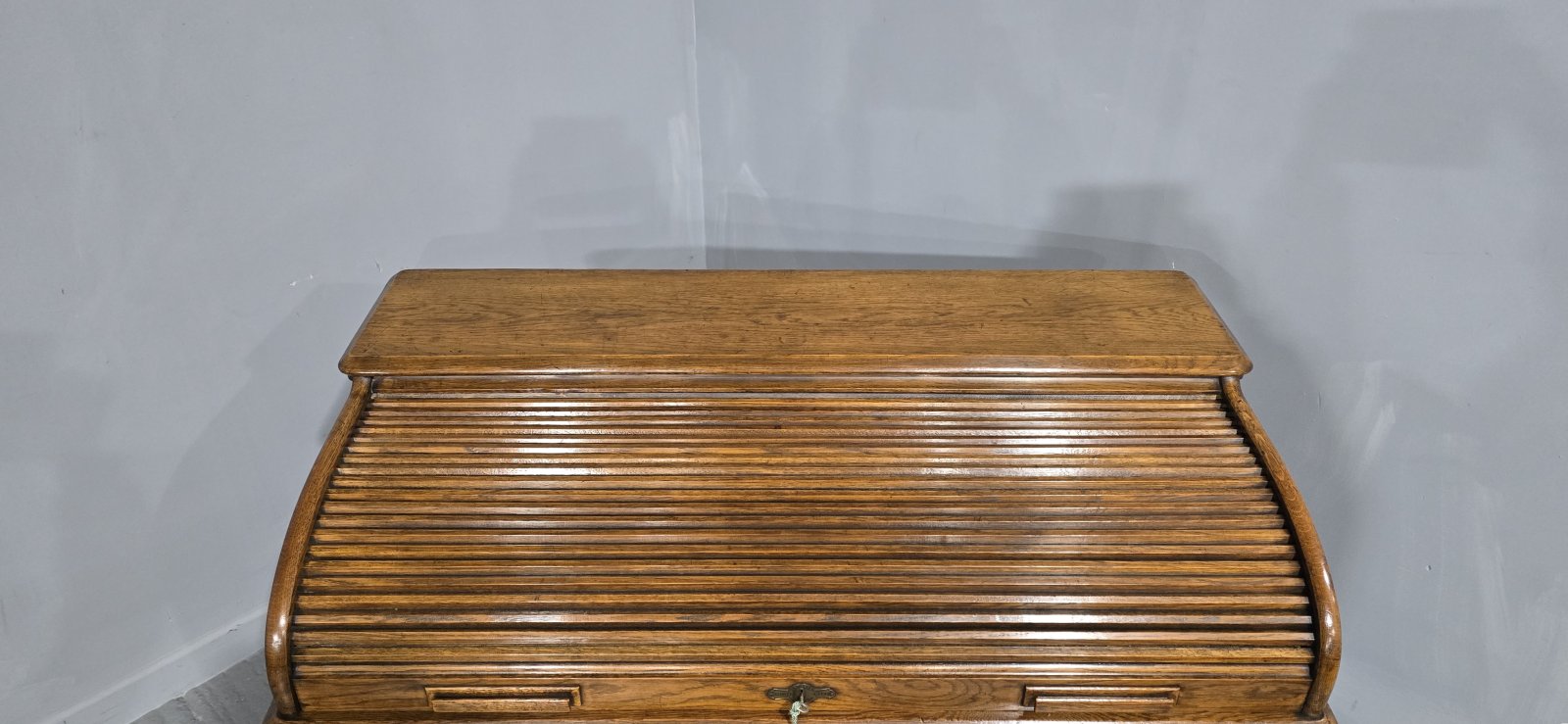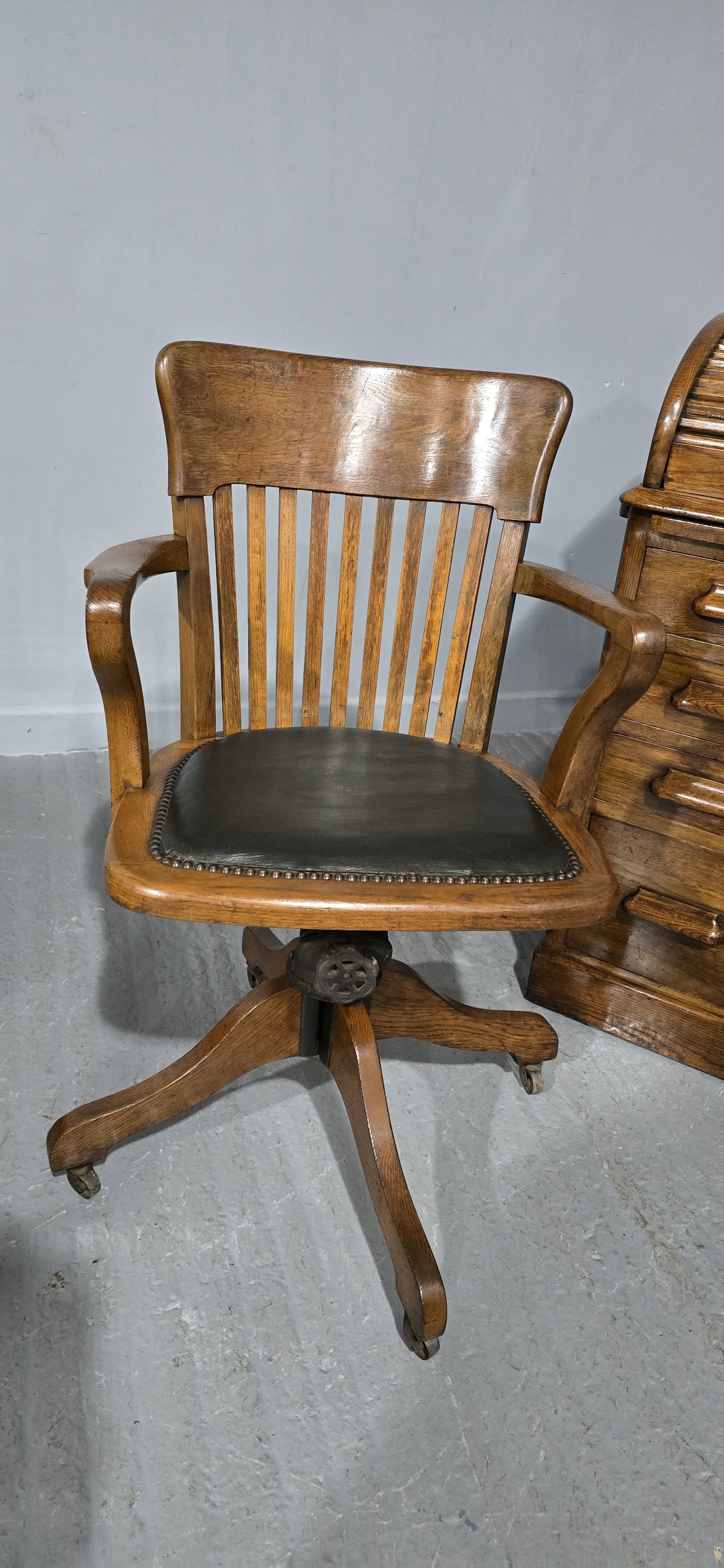 A wonderful medium oak roll topped desk and matching oak tilt and turn office chair, in excellent overall condition, desk comes into pieces for transport, original working key and lock, roll top runs smoothly, chair rises and tilt and turns.