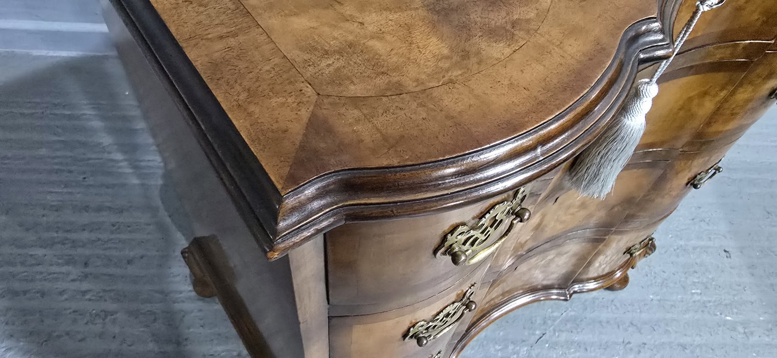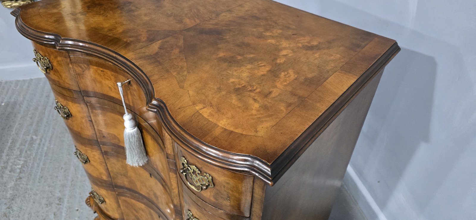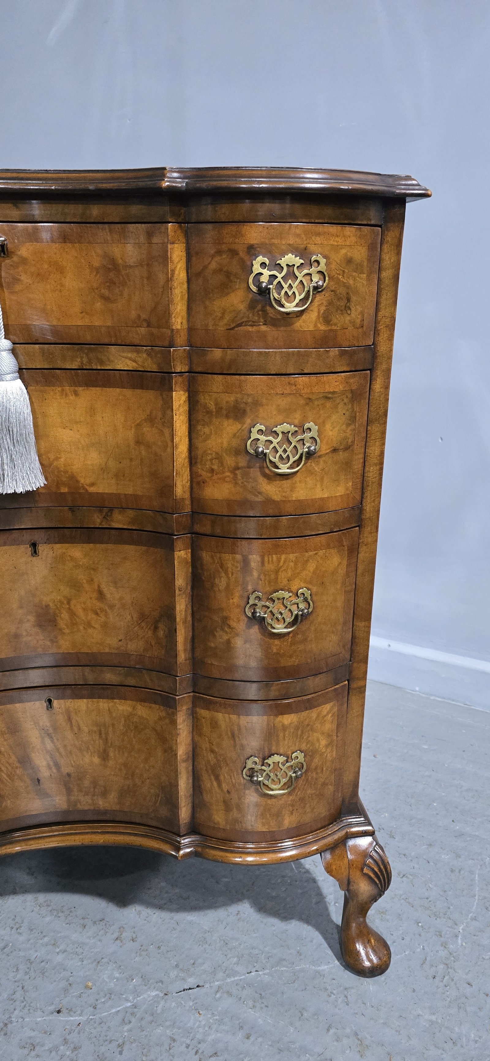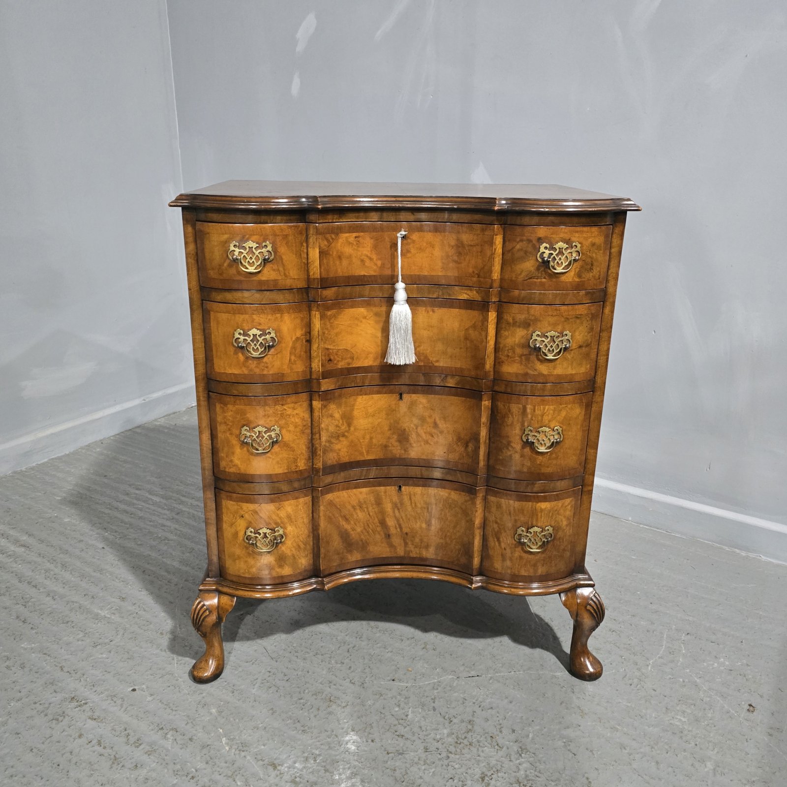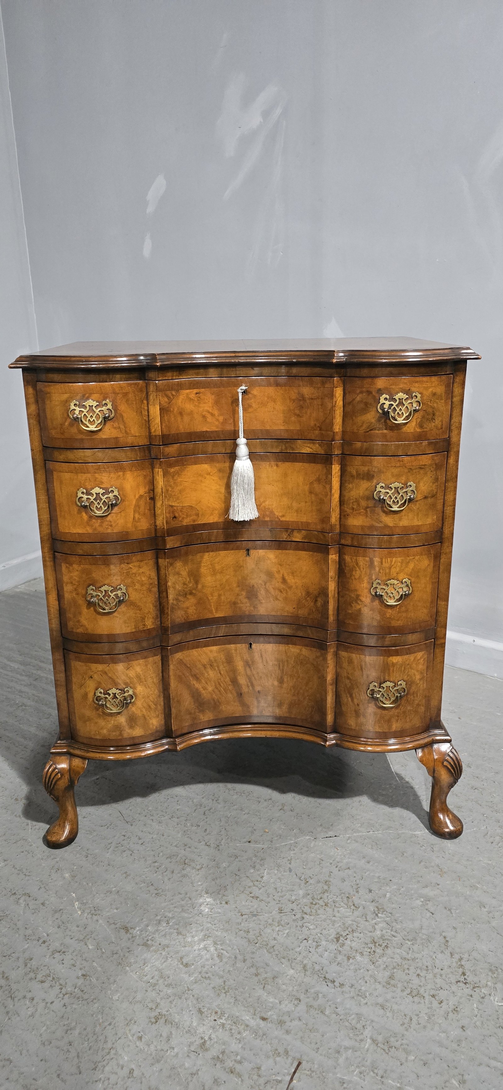 See shipping detailsA superb quality double serpentine Queen Anne walnut chest of four drawers with brass handles, oak lined and standing on squat cabriole legs, wonderful colour and condition.