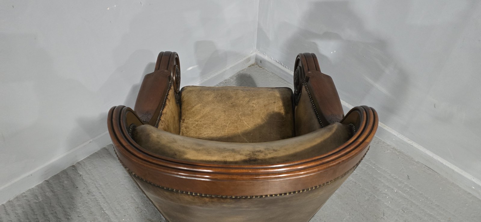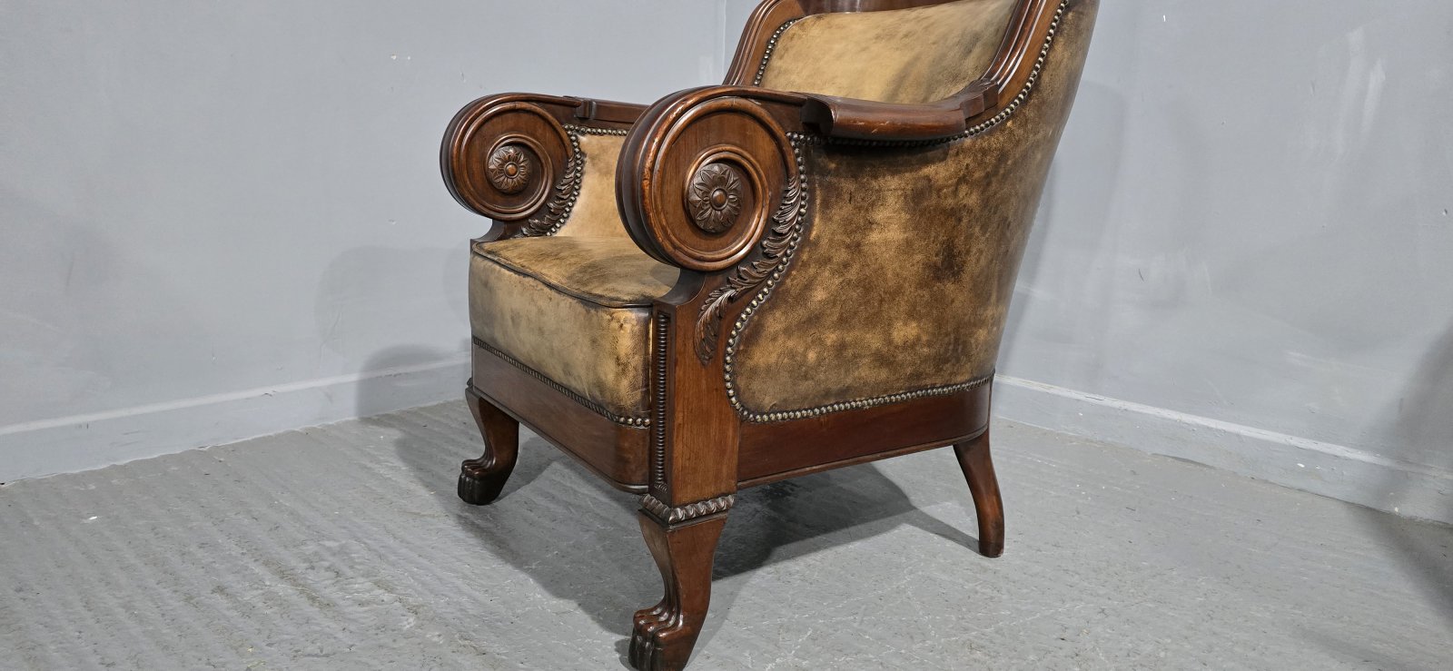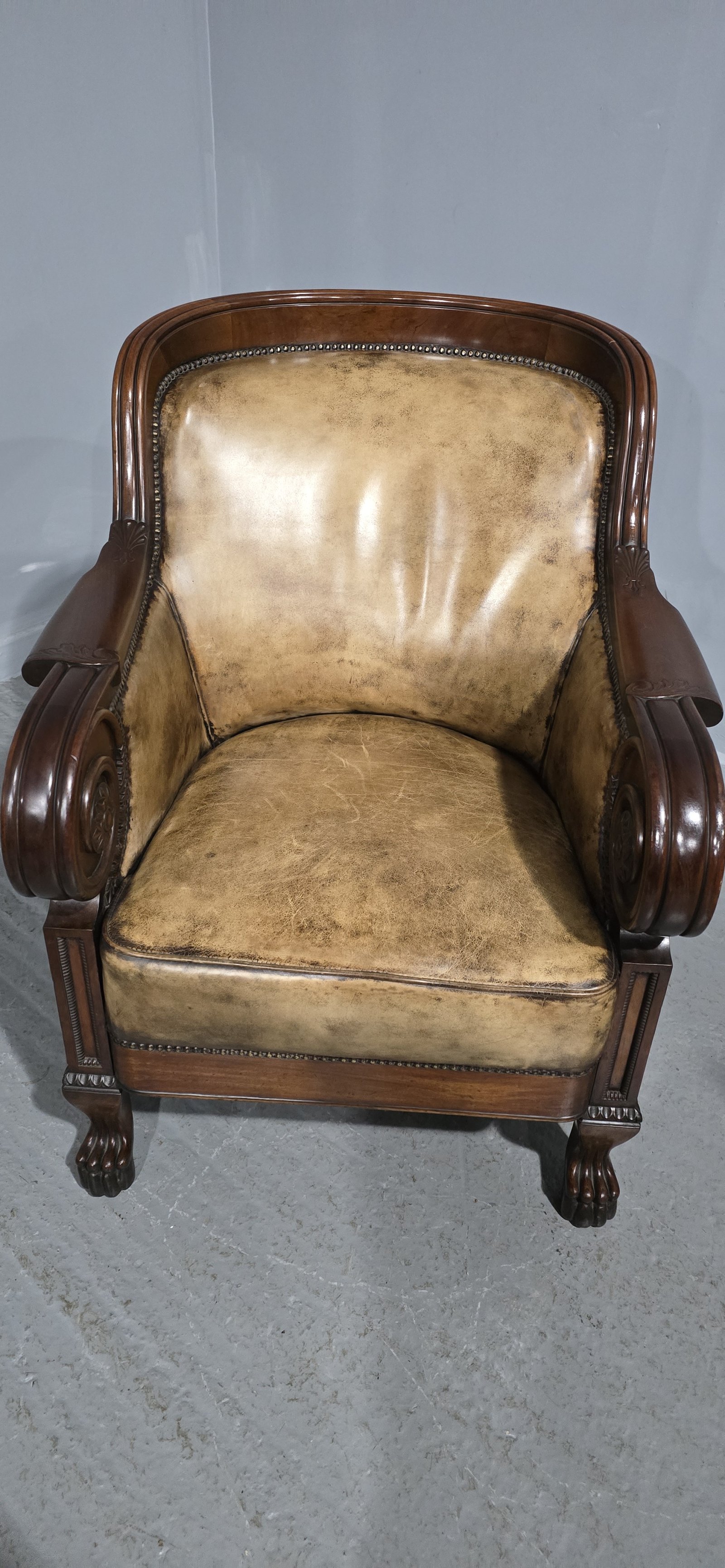 Huge mahogany library chair in the manner of George Bullock, light brown leather covered and individual brass studding, in outstanding condition.