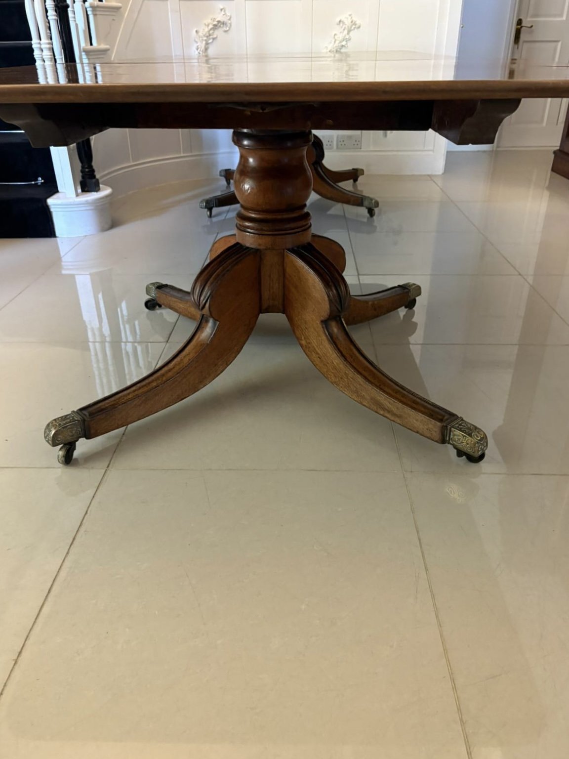 Outstanding quality 16 seater antique George III figured mahogany two pilar dining table having a superior quality figured mahogany top with one large extra leaf supported by turned pedestal columns standing on 4 carved reeded sabre legs with fantastic original ornate brass castors.