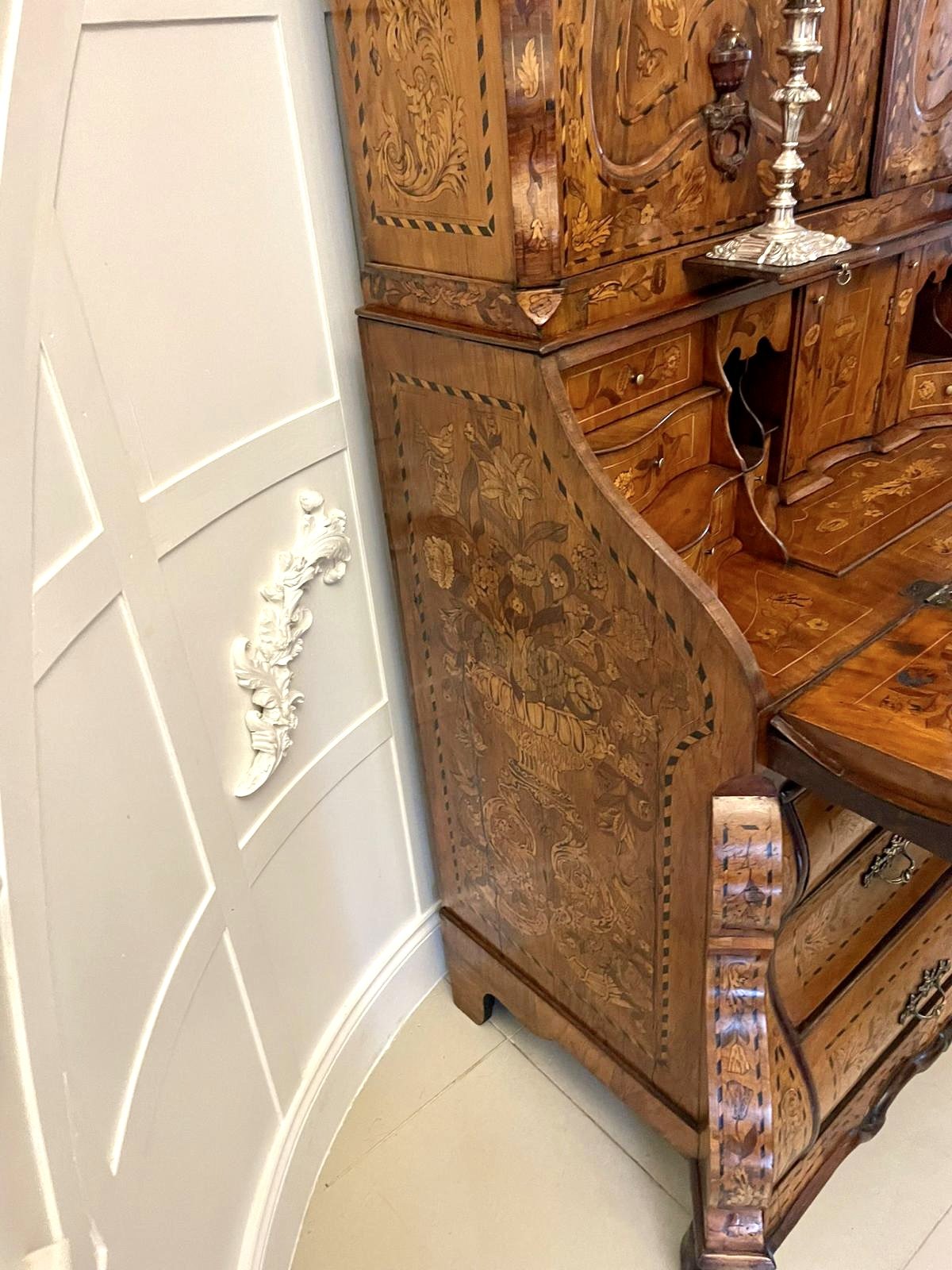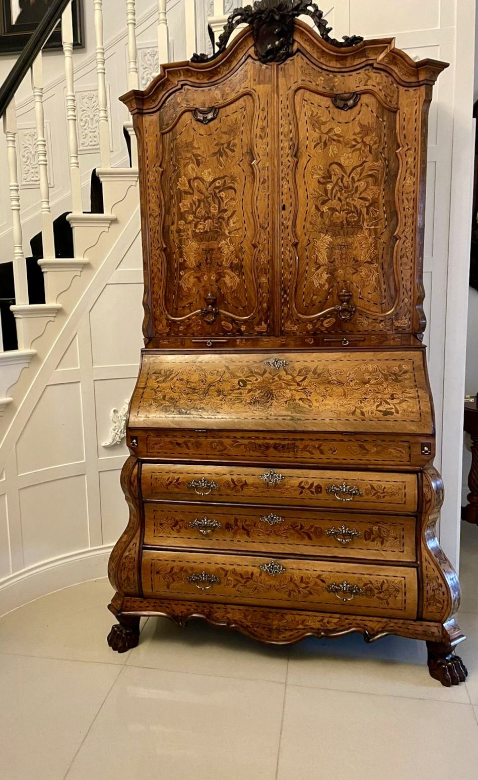 Outstanding quality 18th century antique Dutch marquetry inlaid burr walnut bureau bookcase having an outstanding quality Dutch marquetry inlaid burr walnut bureau bookcase with a beautiful carved shaped cornice above a pair of marquetry inlaid carved panelled doors opening to reveal an adjustable shelved interior above a bombe shaped bureau with a fitted interior consisting of ten drawers, pigeons holes, centre door, and a sliding well above three bombe shaped drawers with original ornate brass handles, fantastic marquetry inlaid sides standing on carved walnut paw feet united by a shaped carved walnut apron