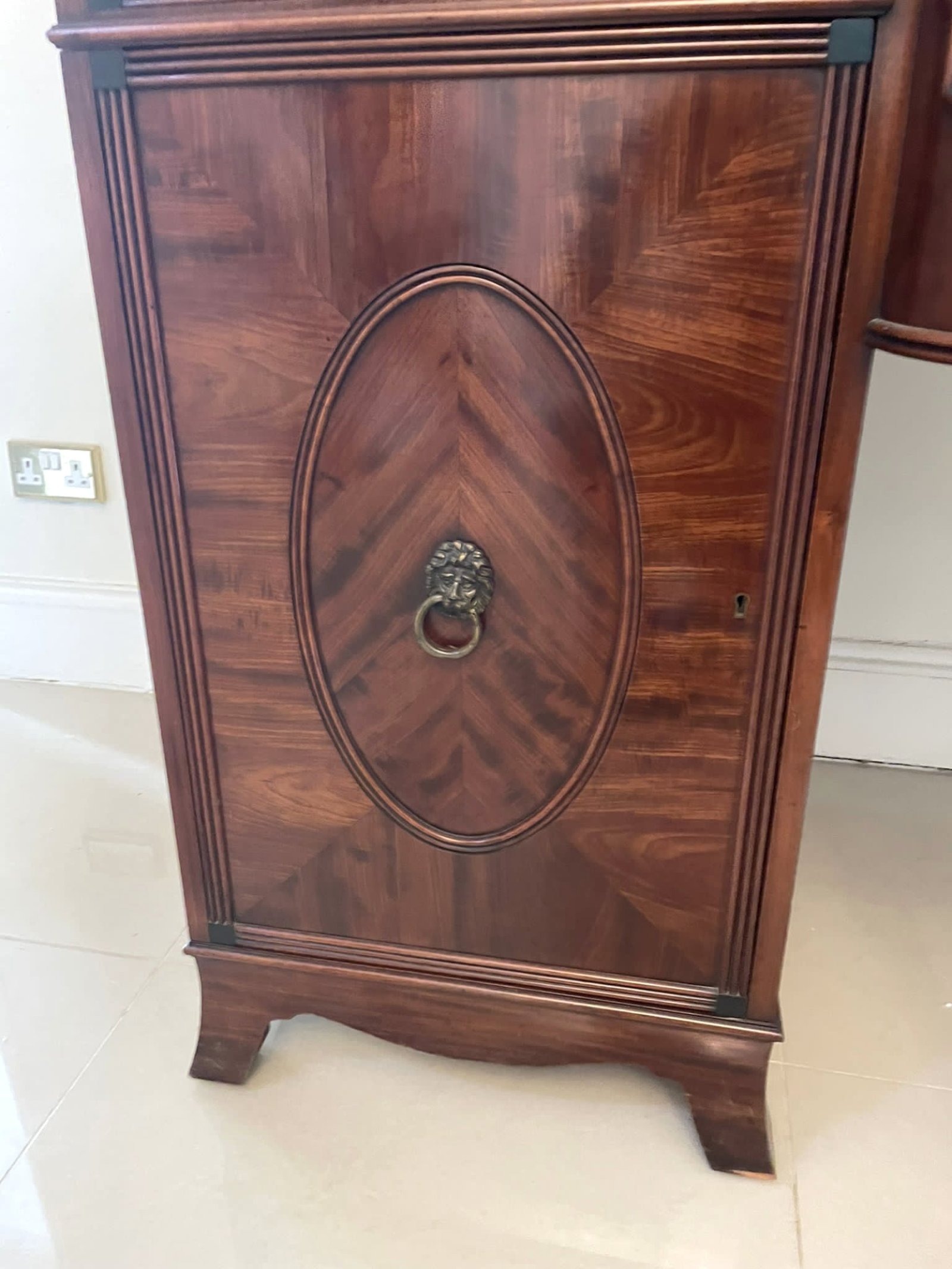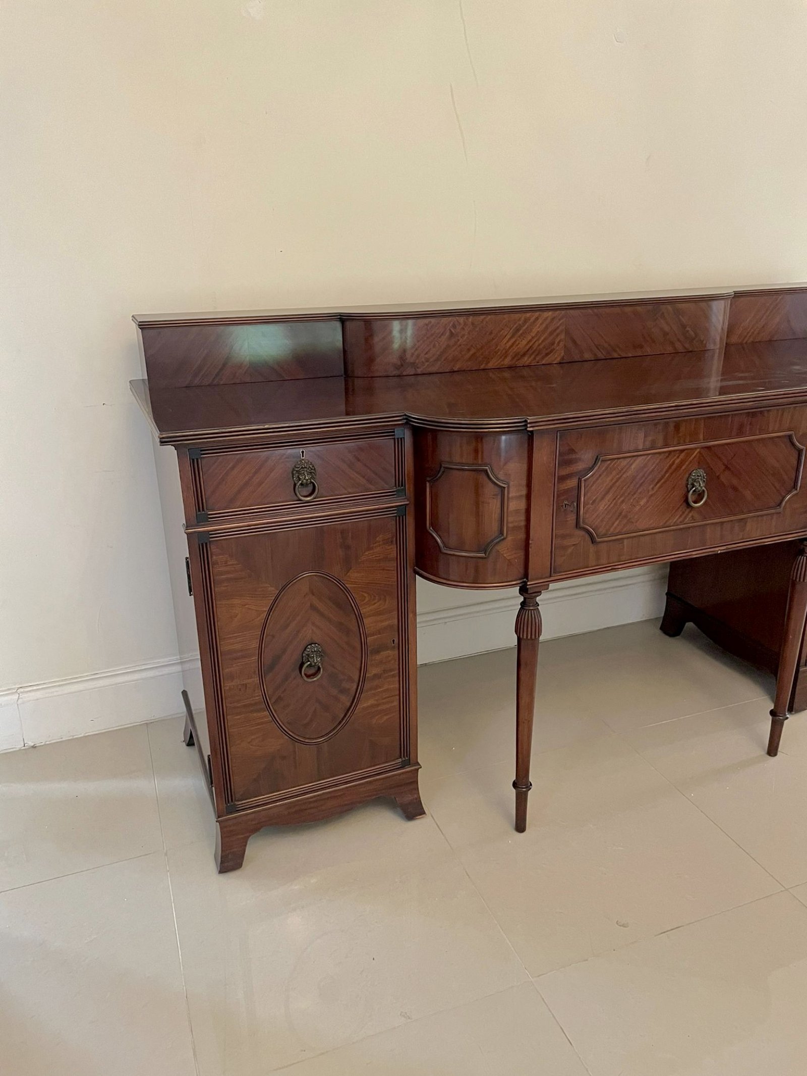 Outstanding quality antique Edwardian mahogany sideboard having a quality mahogany gallery back above a shaped mahogany top with a reeded edge above a figured mahogany moulded door flanked by two bow fronted moulded sides with original brass lions head handle opening to reveal a storage compartment and flanked by two figured mahogany frieze drawers with a moulded edge and original brass lions head handles above two cupboard doors with oval figured mahogany panels with original brass lions head handles opening to reveal a fitted interior consisting of sliding trays and a cellarette, two turned tapering legs to the centre and raised on shaped bracket feet.