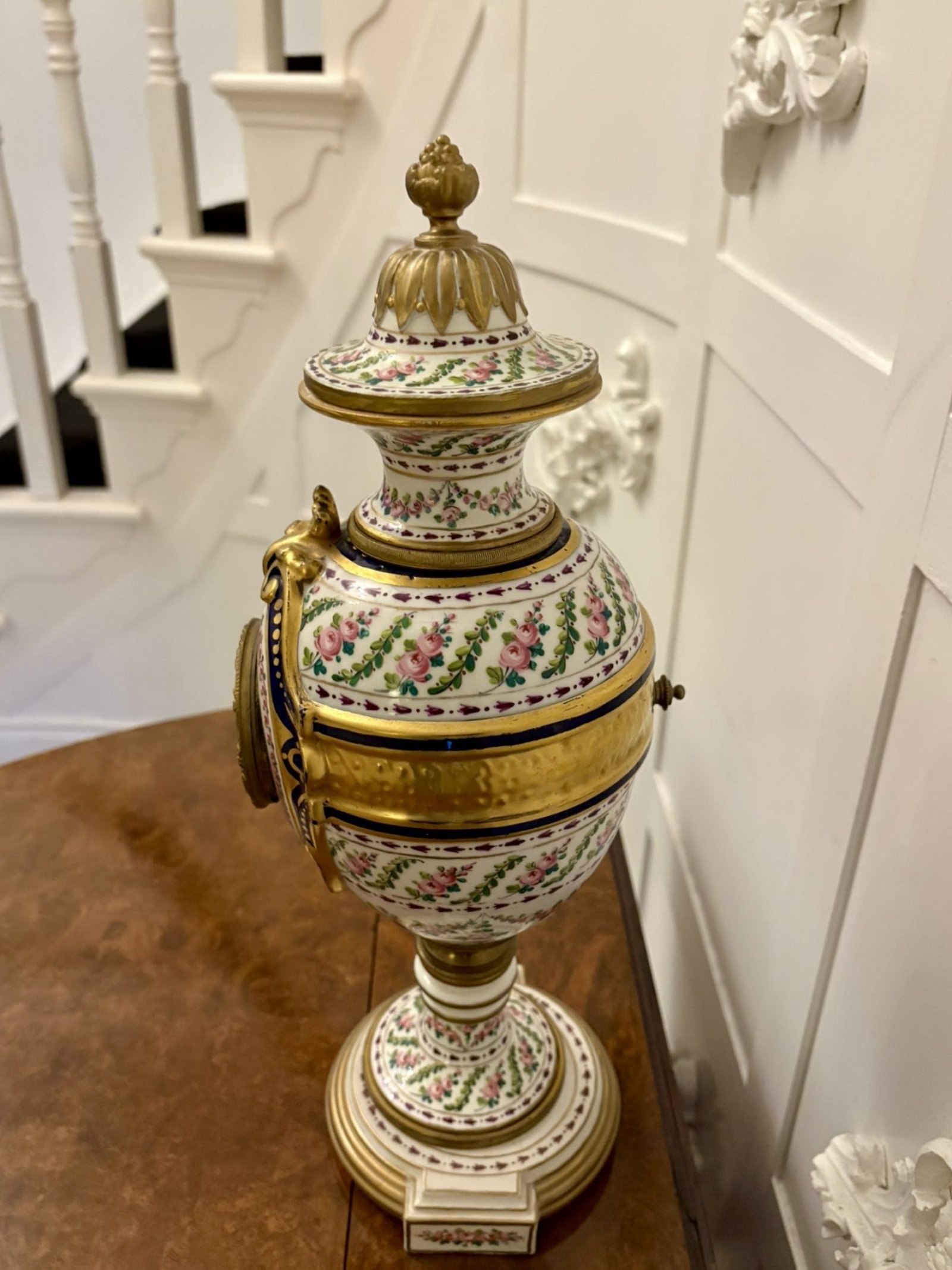 An outstanding quality French porcelain mantel clock of elegant urn form, richly decorated with finely hand-painted floral garlands of pink roses and foliage, set against a crisp white ground. The porcelain body is beautifully complemented by deep cobalt blue reserves and lavish gilt bronze mounts, creating a striking and refined contrast typical of high-quality French decorative work of the Victorian period.