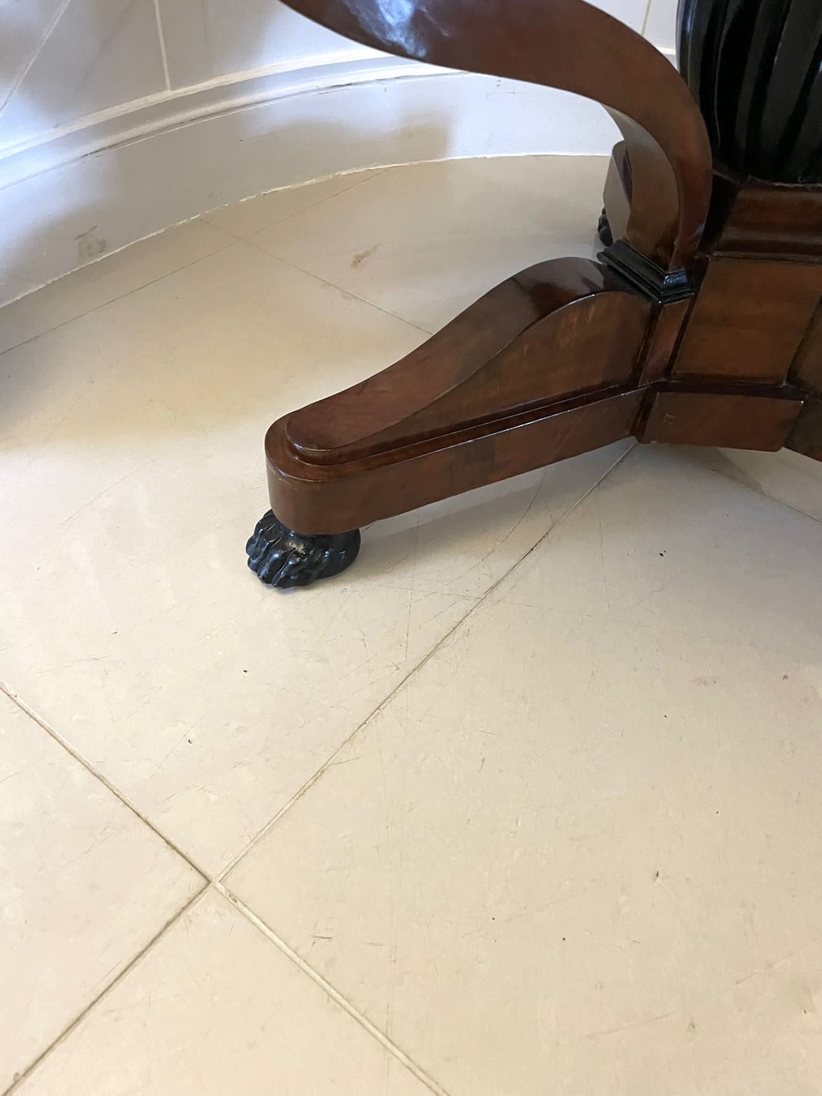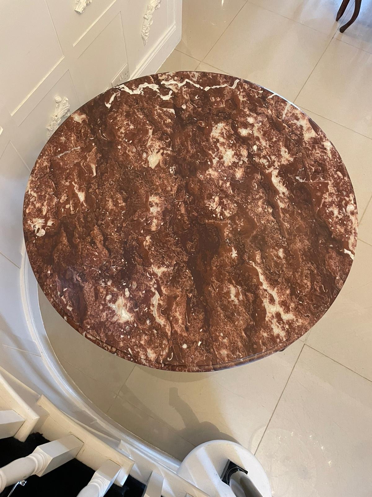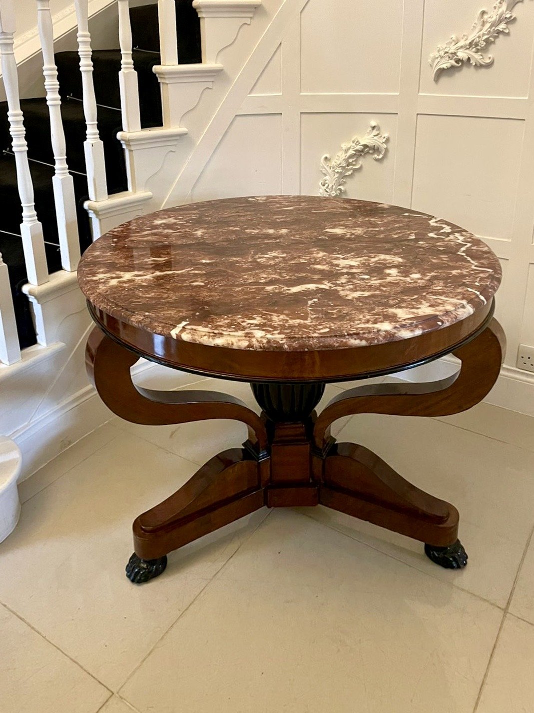 Outstanding quality antique French Victorian marble top centre table having an outstanding quality circular coloured marble top with a moulded edge above a mahogany circular frieze supported by three scroll shaped scrolls and a ebonised shaped reeded pedestal column standing on a platform with 3 ebonised claw feet