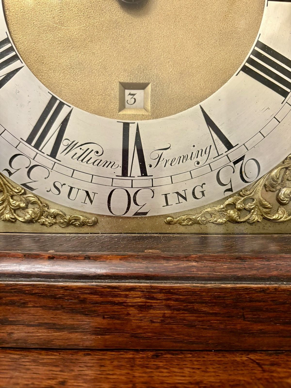 Outstanding quality antique George III oak and burr oak brass face longcase clock by William Frening, Suning having an outstanding quality case with a long door, turned columns to the hood, glass windows to the sides crossbanded in burr oak, square brass dial, original hands, silver plate chapter ring, date calendar, original 30 hour bird cage movement, weight and pendulum
