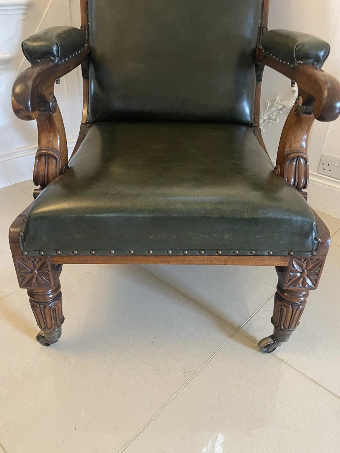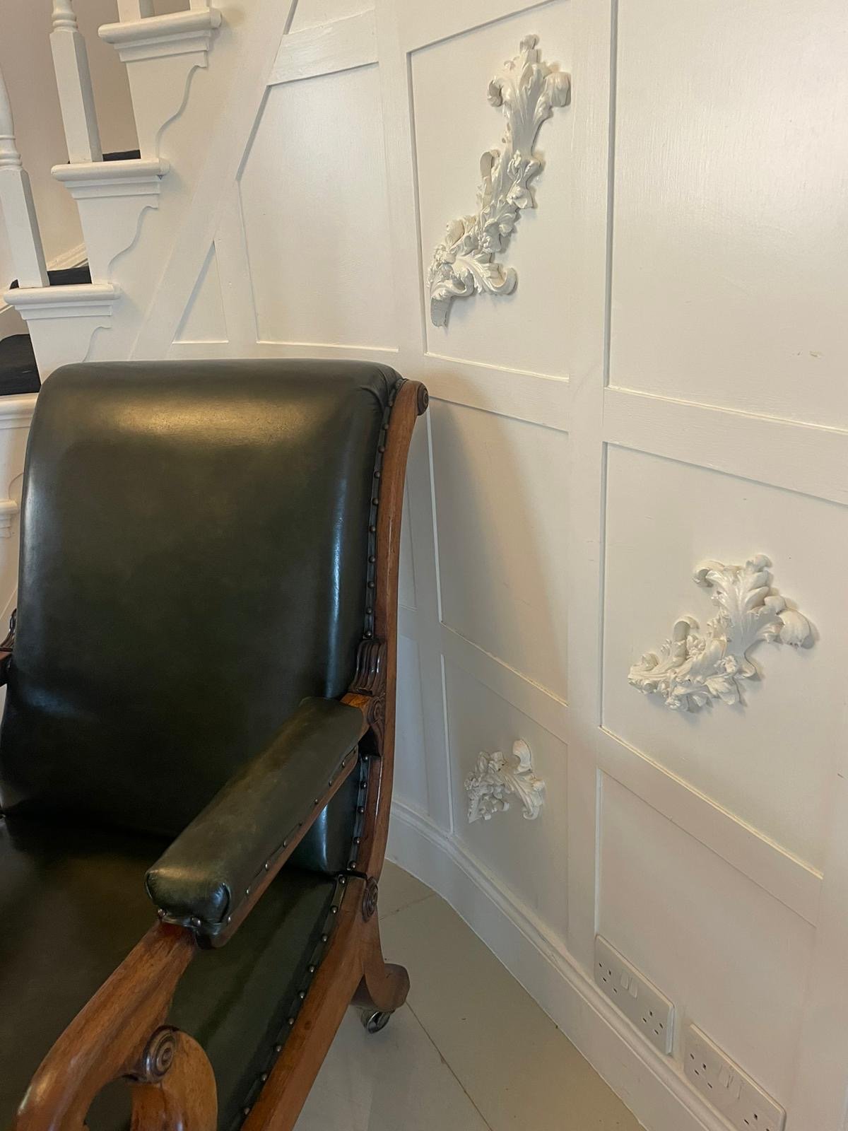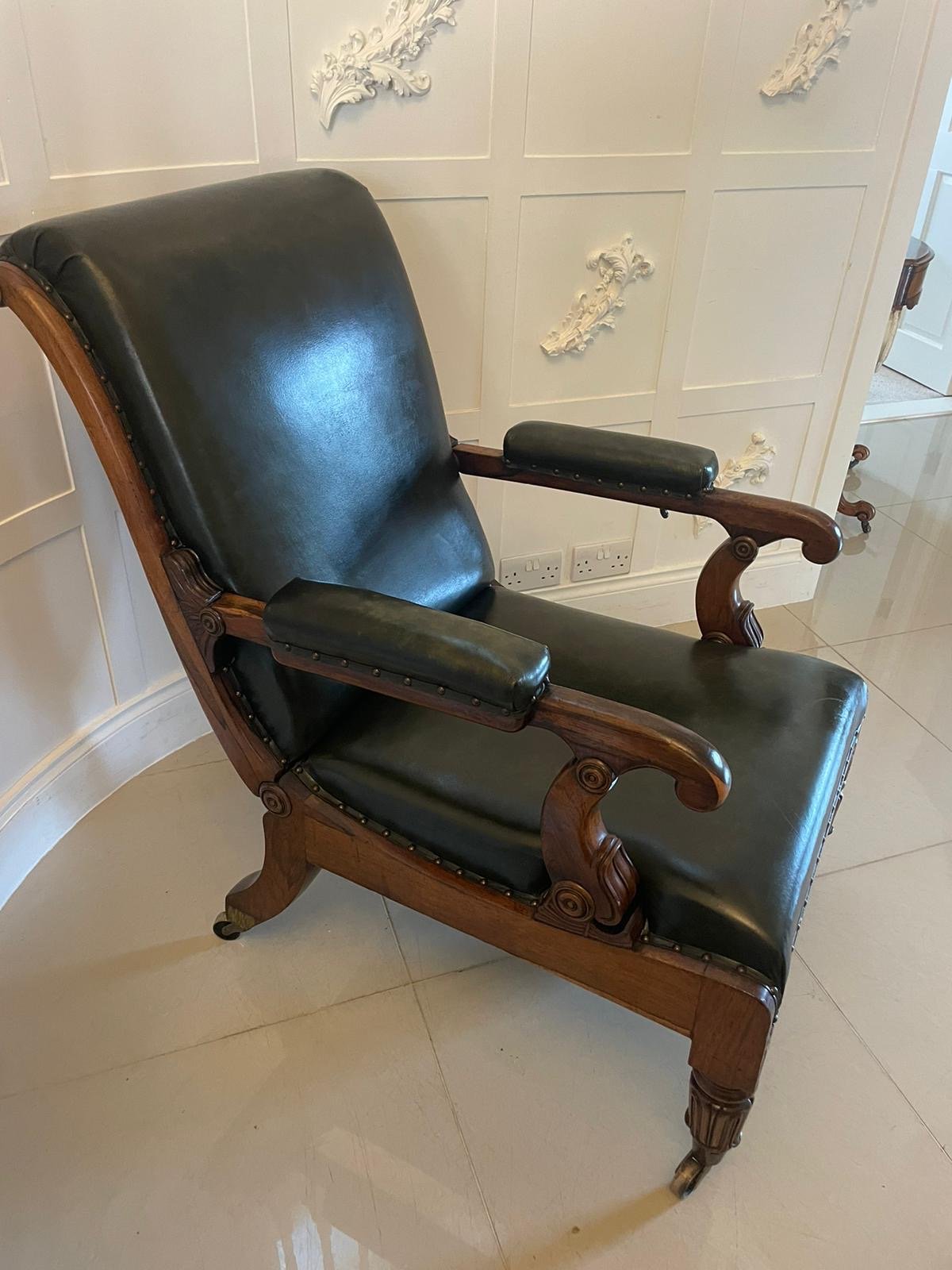 Outstanding quality antique Regency quality rosewood reclining armchair having fabulous carving and newly reupholstered in a quality green leather with close nailed standing on splendid carved tulip legs to the front with original brass cup castors and out swept back legs
