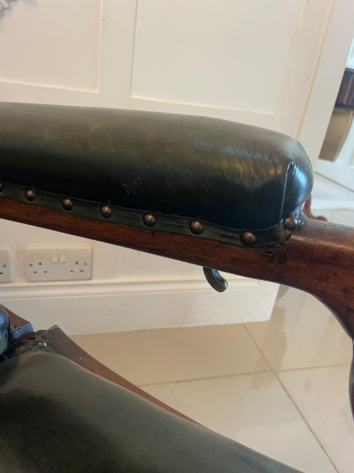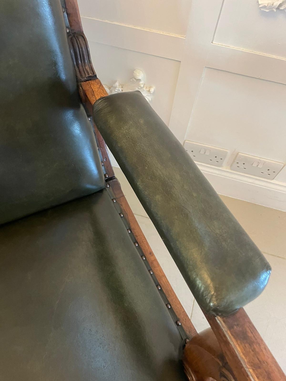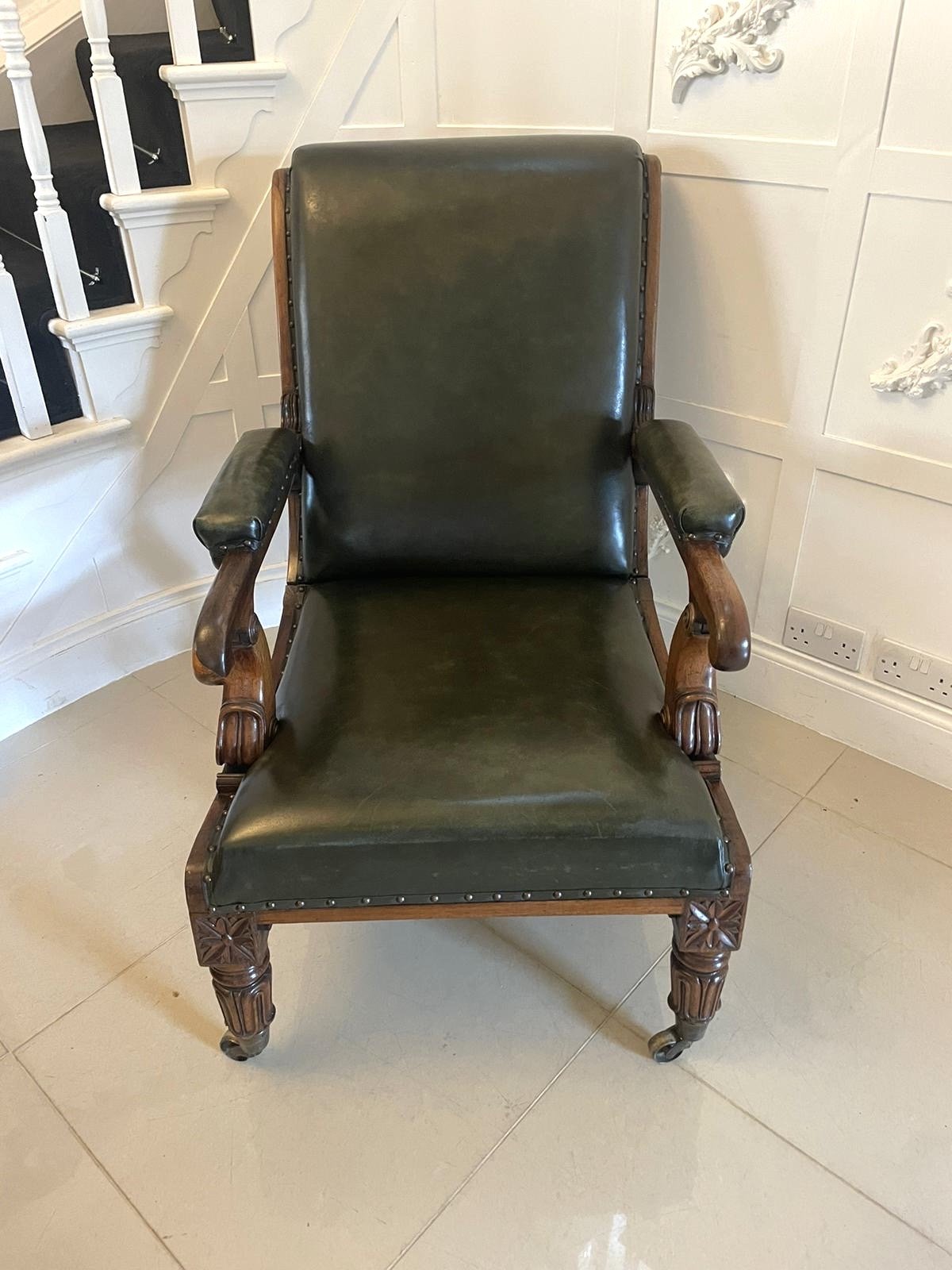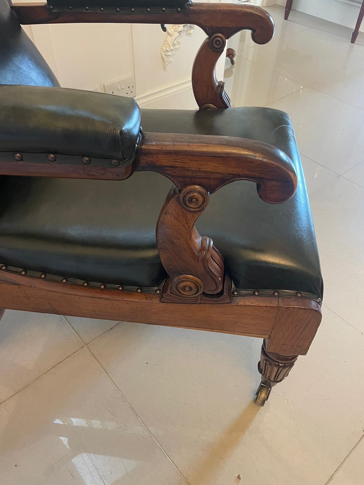 Outstanding quality antique Regency quality rosewood reclining armchair having fabulous carving and newly reupholstered in a quality green leather with close nailed standing on splendid carved tulip legs to the front with original brass cup castors and out swept back legs