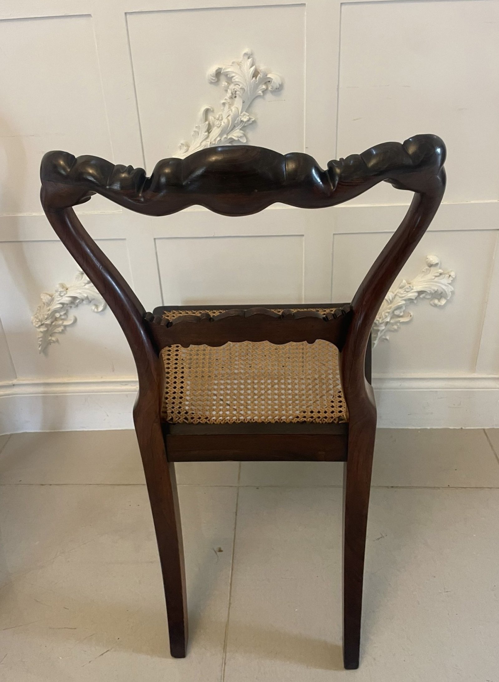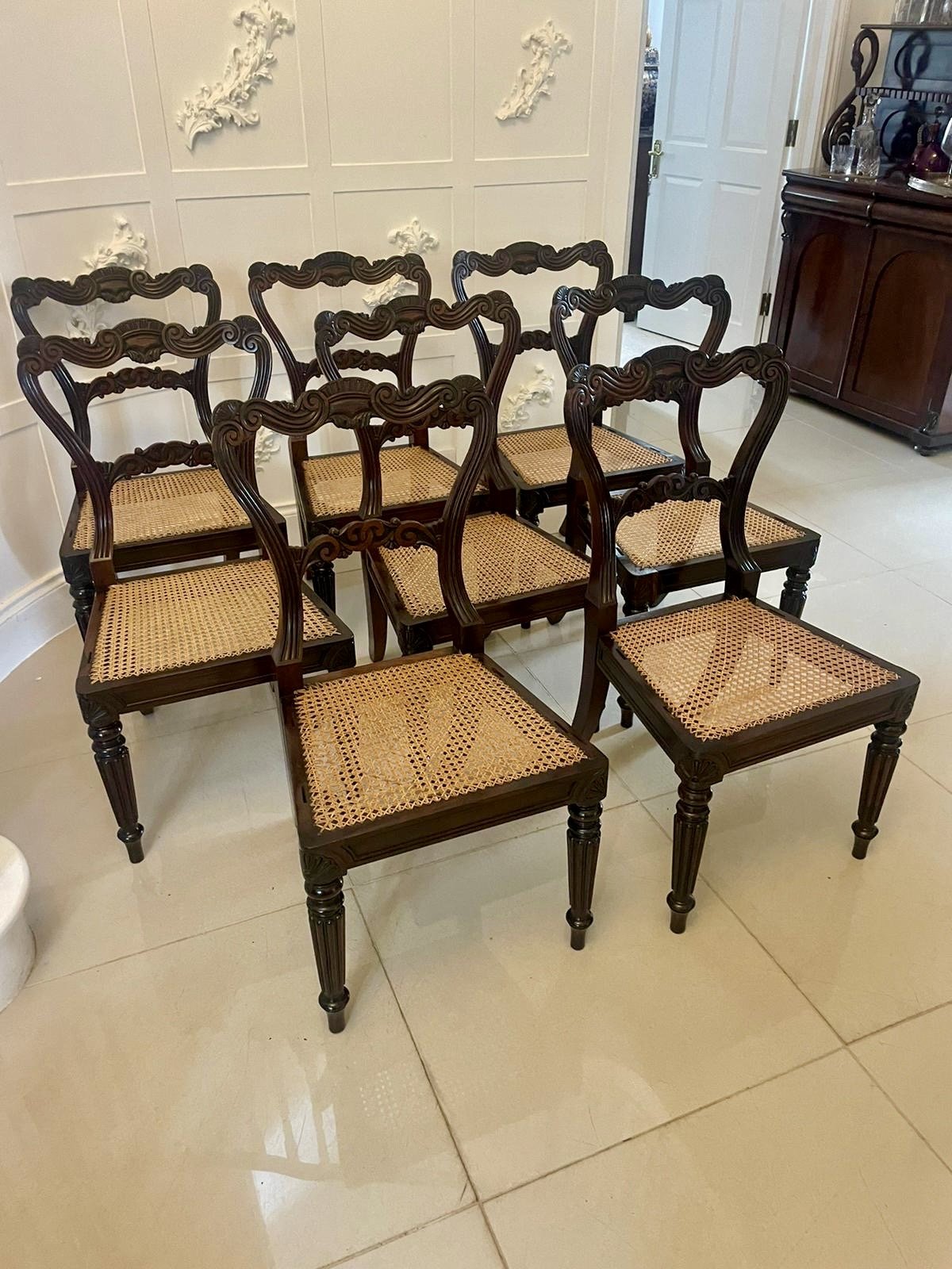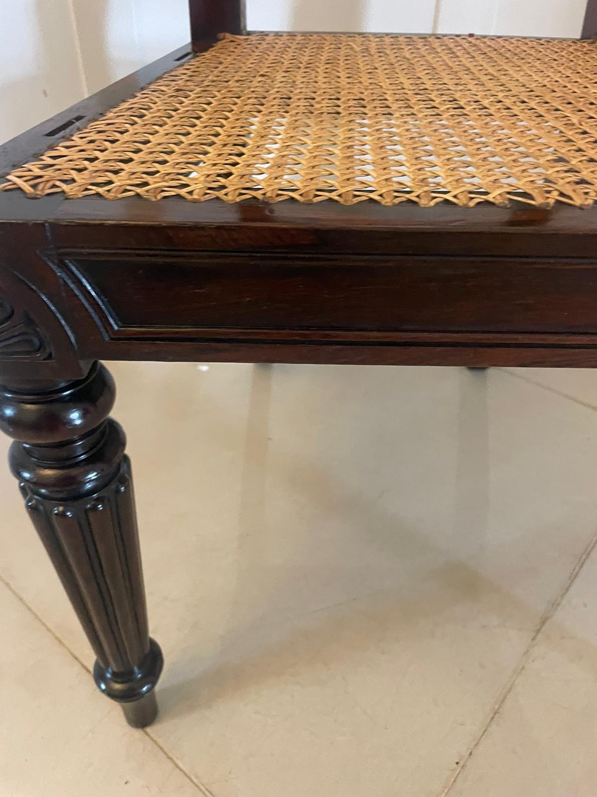 Outstanding quality antique Regency set of 8 carved rosewood dining chairs having a magnificent quality carved rosewood shaped back with a carved centre splat, Bergere seats in perfect condition, rosewood moulded frieze standing on carved turned reeded tapering legs to the front and out swept back legs