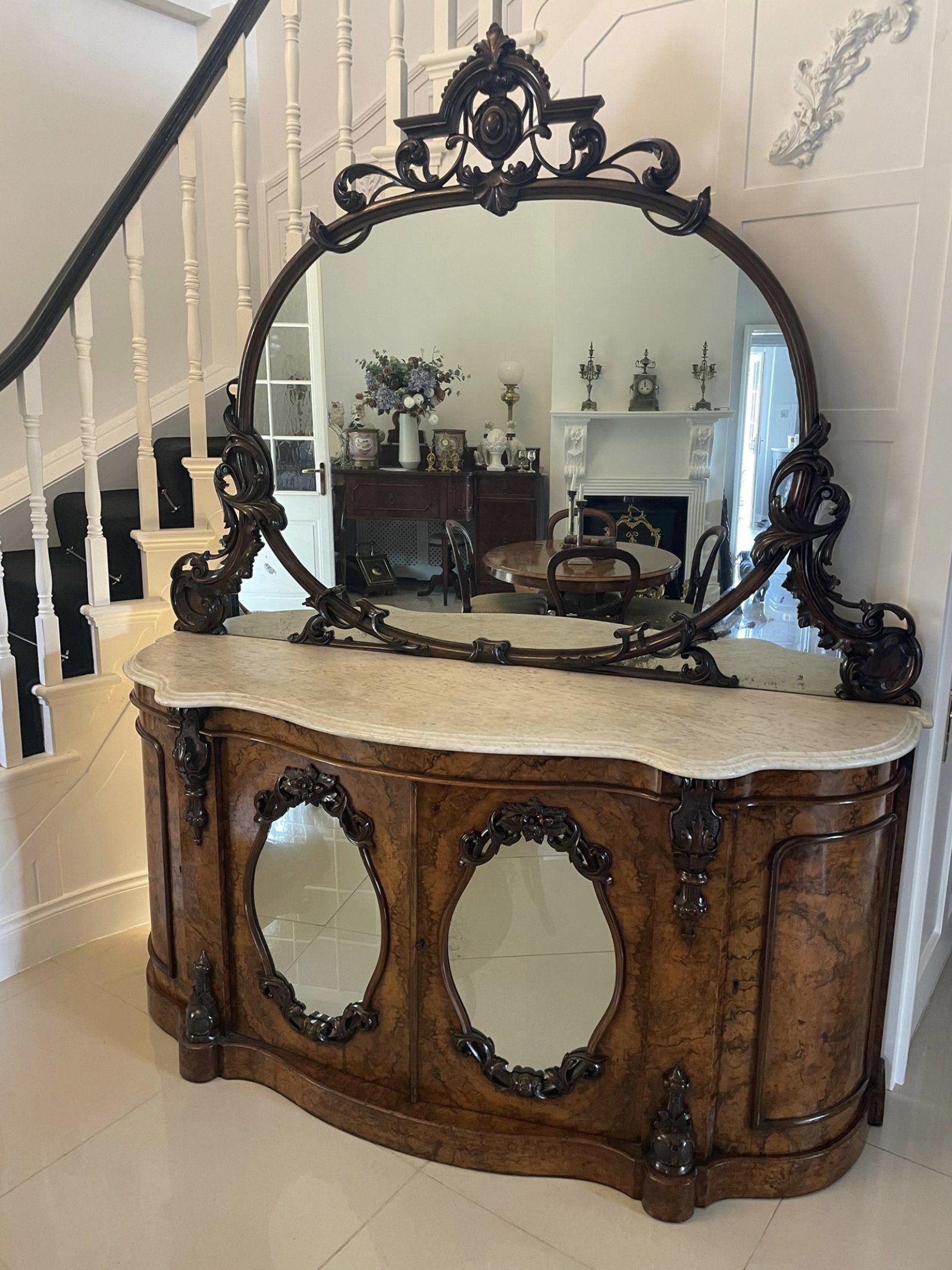 Outstanding quality antique Victorian burr walnut and carved mirror back credenza having an outstanding quality carved shaped mirror back above a serpentine shaped white marble top with a double moulded edge above a pair of burr walnut oval, carved mirror doors opening to reveal a polished shelf interior flanked by two burr walnut moulded doors opening to reveal a polished shelf interior. It stands on a serpentine shaped burr walnut plinth