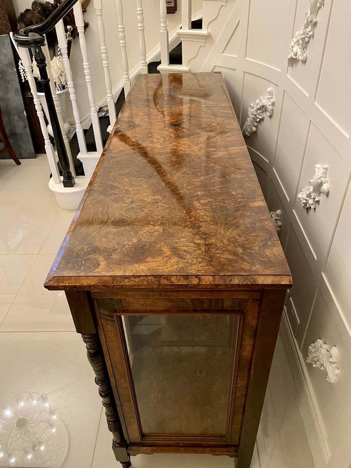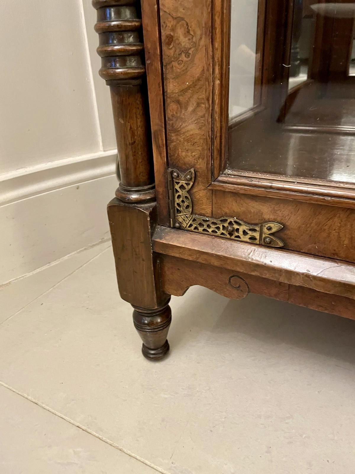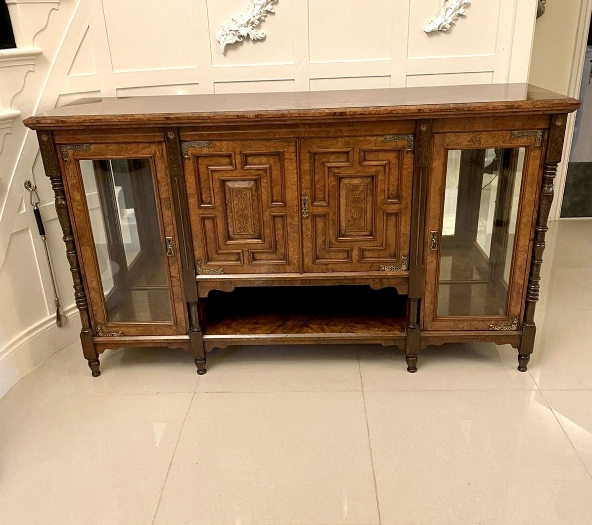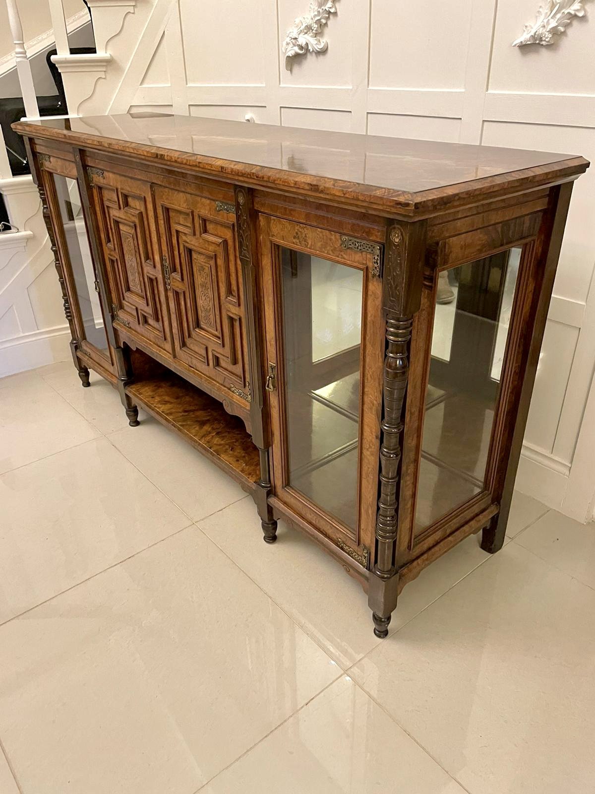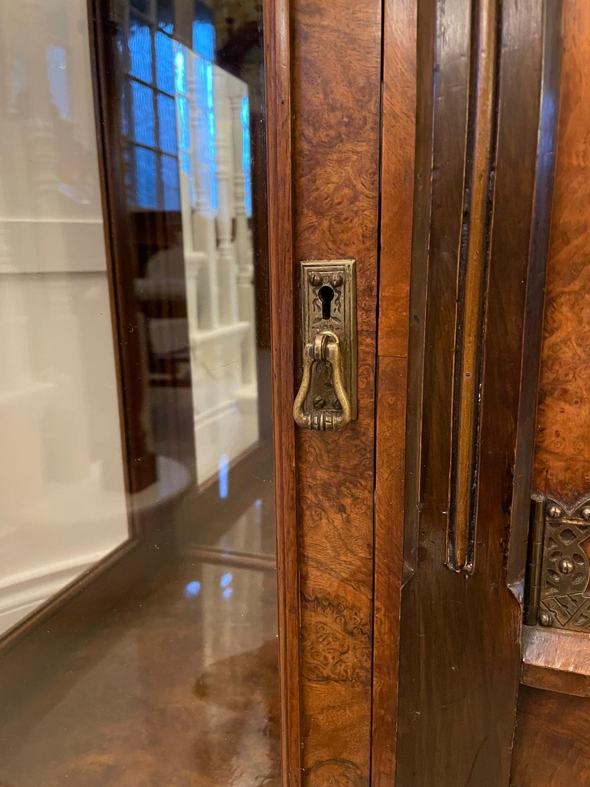 Outstanding quality antique Victorian burr walnut credenza having an outstanding quality burr walnut top with moulded edge. It boasts a stunning pair of walnut moulded panelled and carved doors to the centre with original ornate brass hinges, the doors open to reveal a shelved interior flanked by walnut glazed doors and glazed ends with original brass hinges, adjustable shelf and turned tapering columns with beautiful carved sunflower supports, the base boasts a burr walnut shelf and is raised on elegant turned feet. Original key.