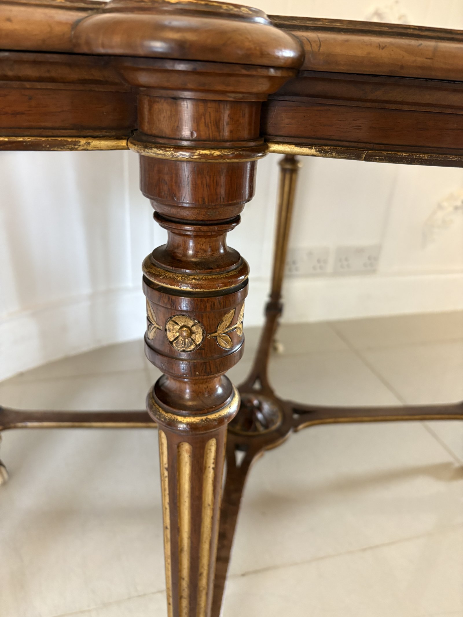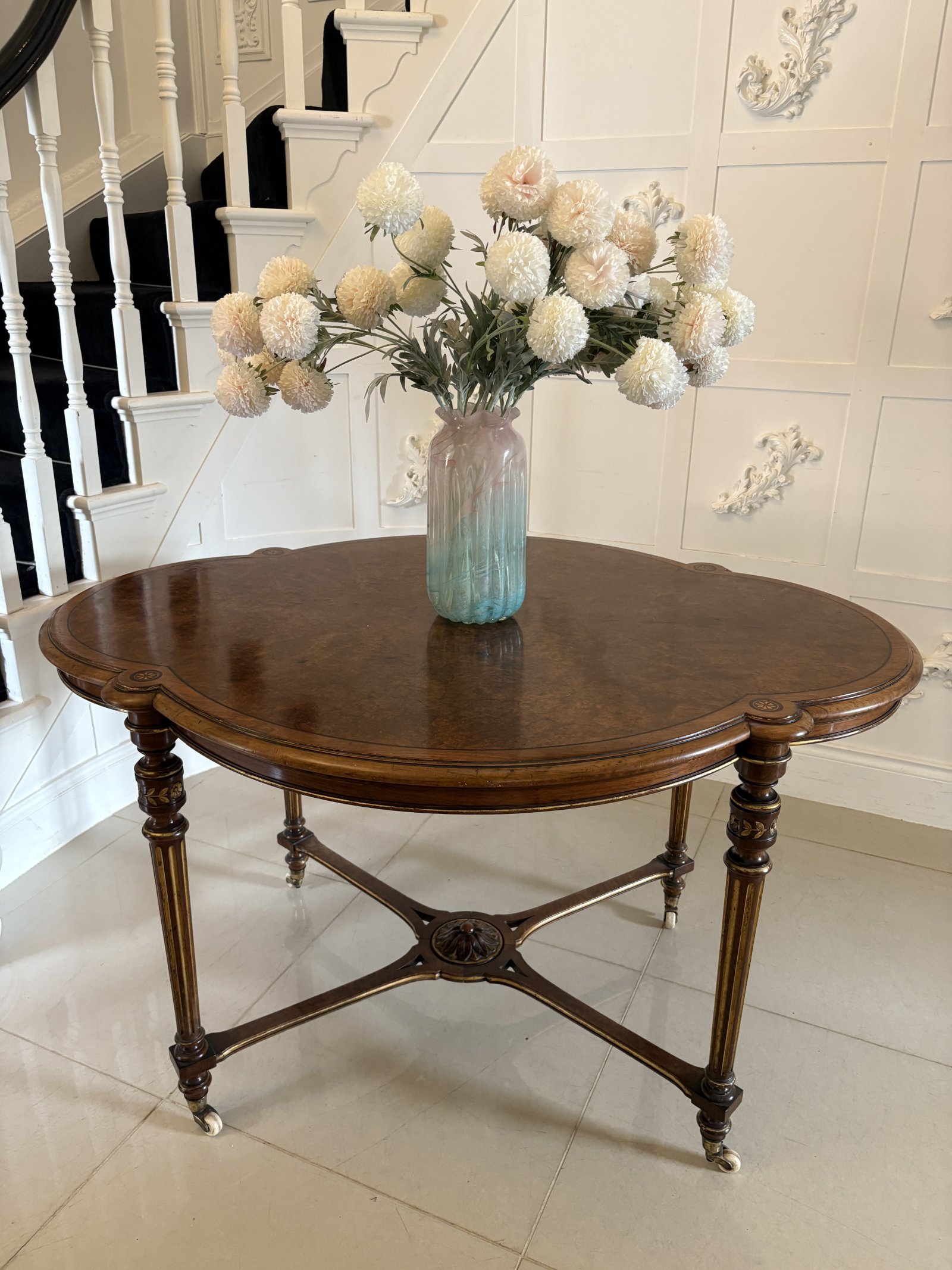 Outstanding quality antique Victorian burr walnut inlaid centre table having a magnificent quality burr walnut inlaid serpentine shape top standing on four elegant turned carved reeded gilded legs with original brass cup castors united by a carved walnut cross stretcher