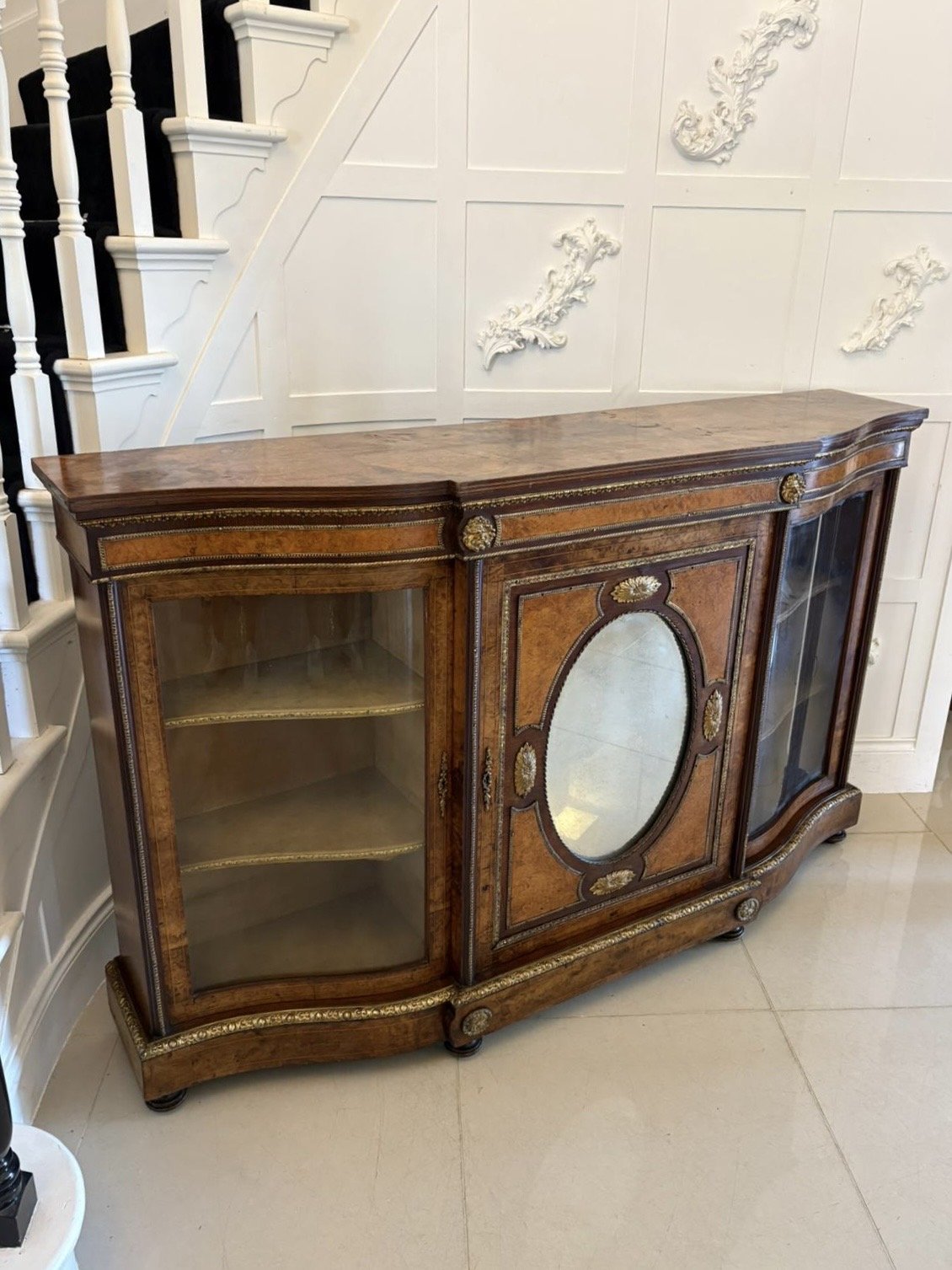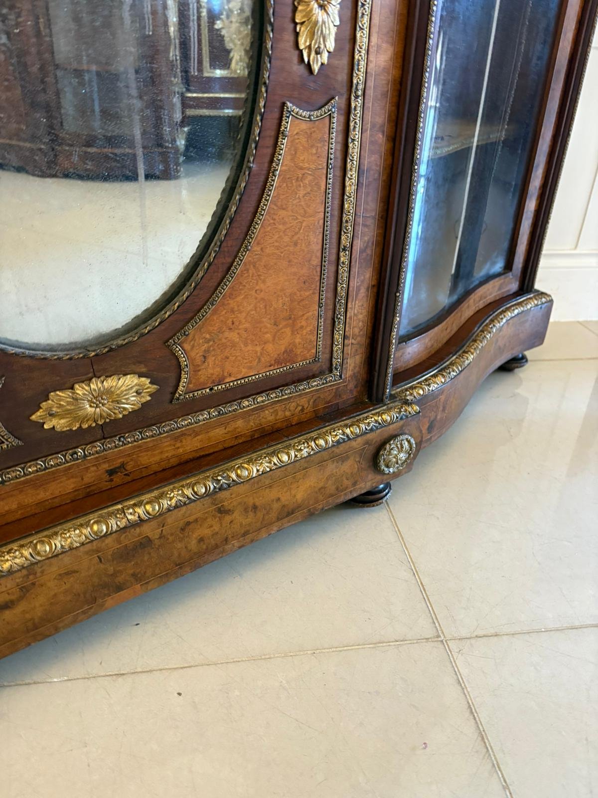 Outstanding quality antique Victorian burr walnut ormolu mounted credenza having a burr walnut serpentine shaped top, ormolu mounted burr walnut frieze above a single door with a oval mirror, burr walnut ormolu mounted panels opening to reveal a fitted shelf flanked by a pair of serpentine shaped glazed doors opening to reveal two display shelves standing on an ormolu mounted burr walnut serpentine shaped plinth with original turned feet.
