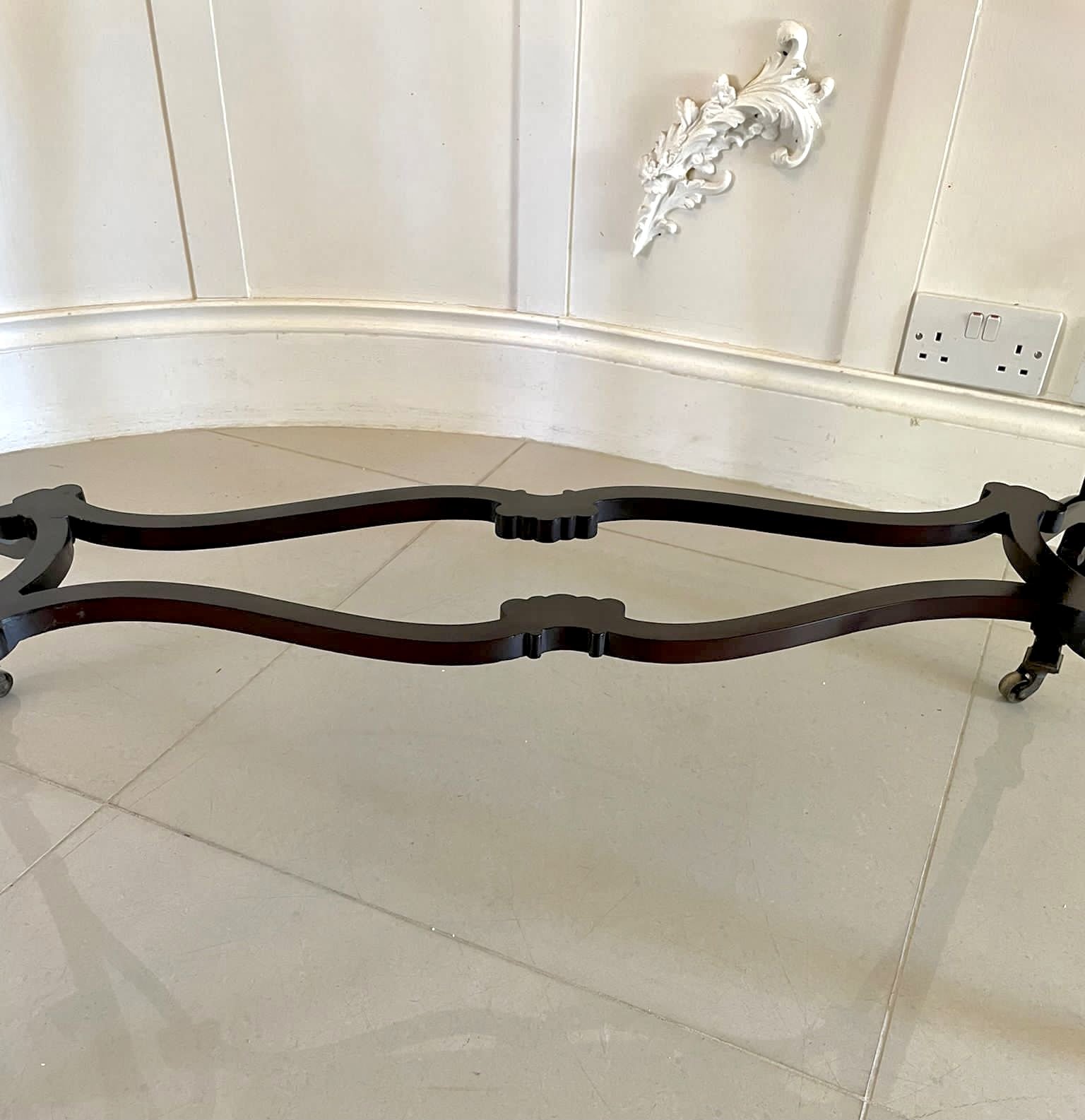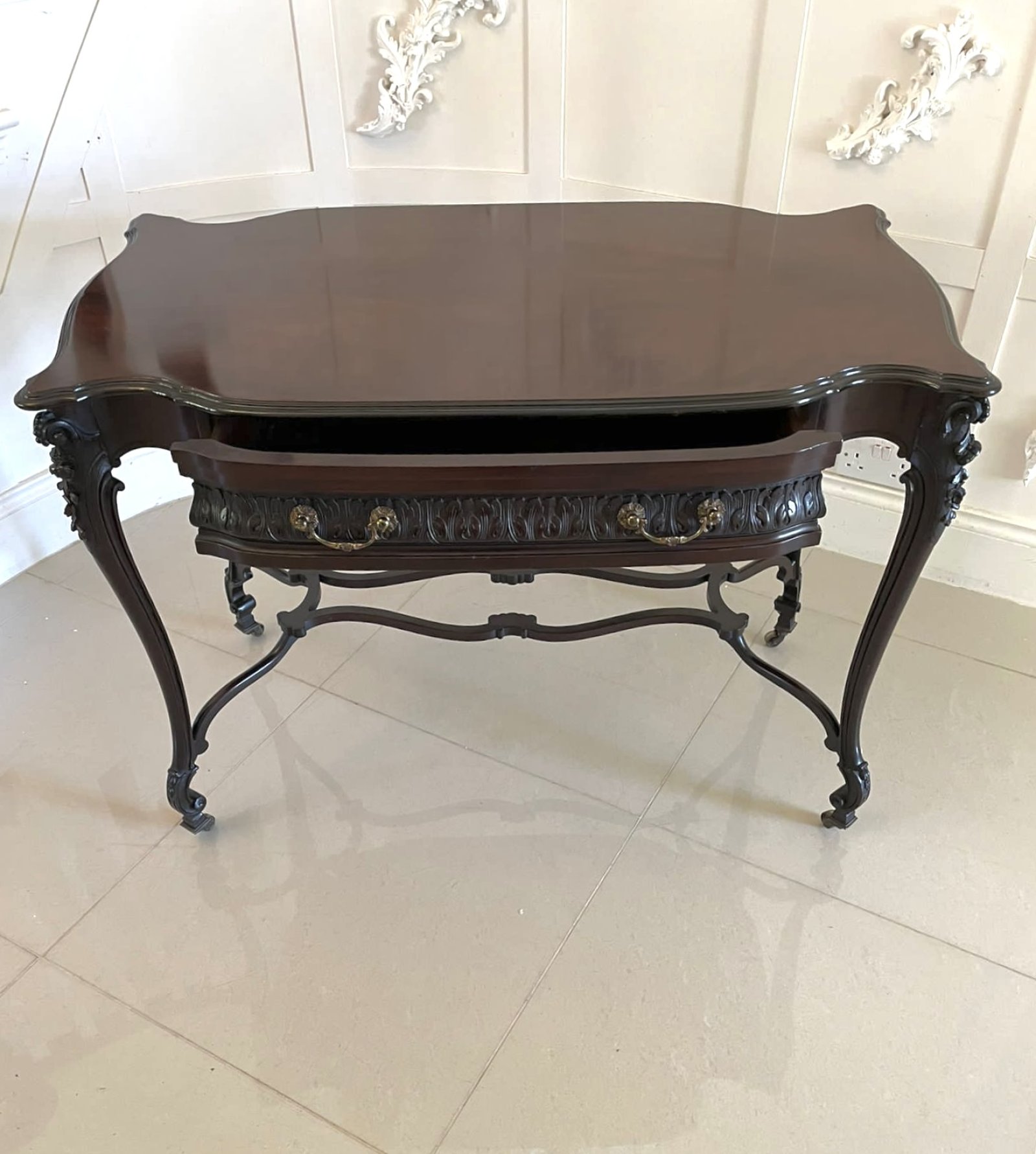 Outstanding quality antique Victorian carved mahogany freestanding centre table having a quality shaped mahogany top with a moulded edge above one long drawer with fantastic quality carving and original brass handles, freestanding carved back and sides standing on four quality beautifully carved mahogany shaped cabriole legs with carved scroll feet and original brass casters united by attractive fine carved mahogany shaped stretchers.
