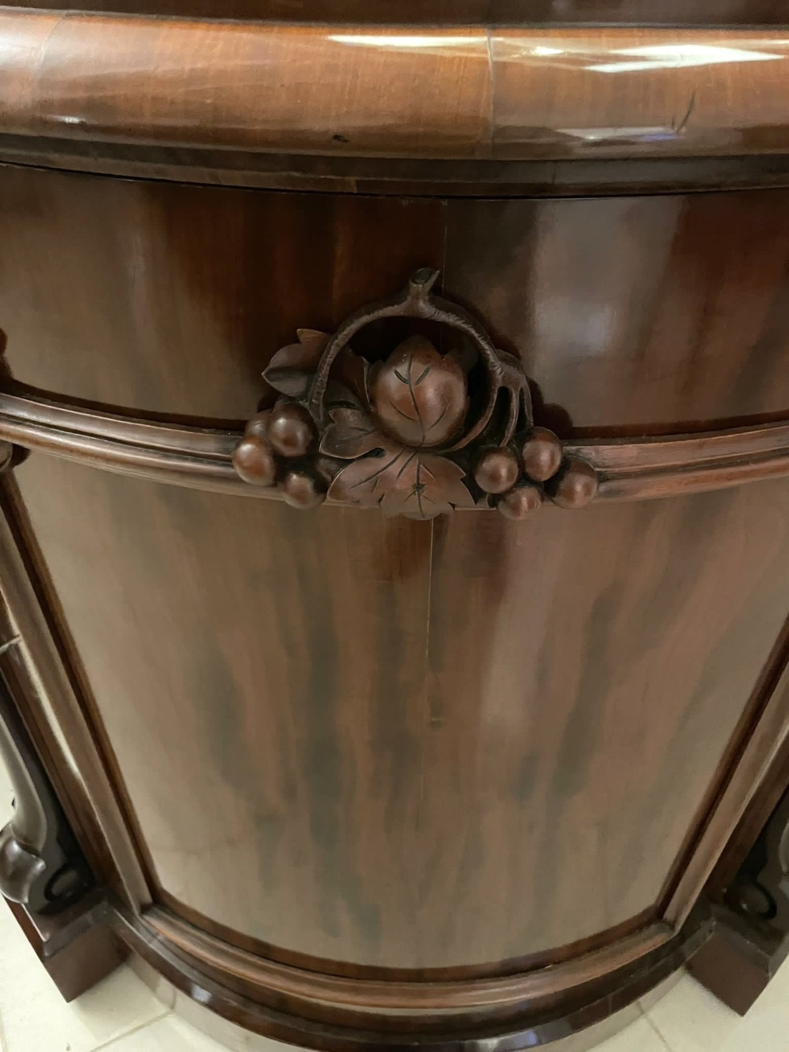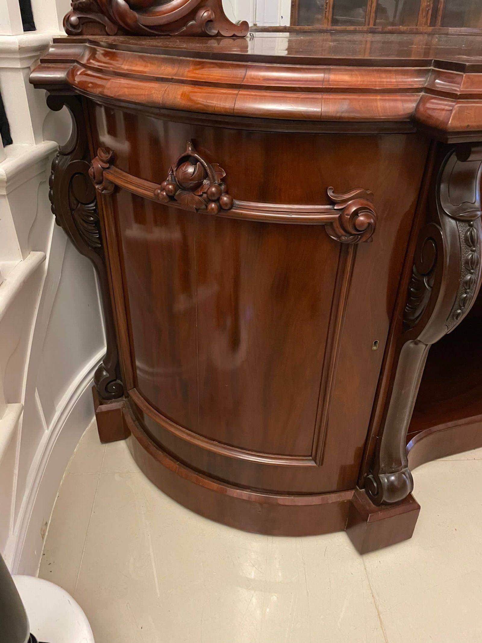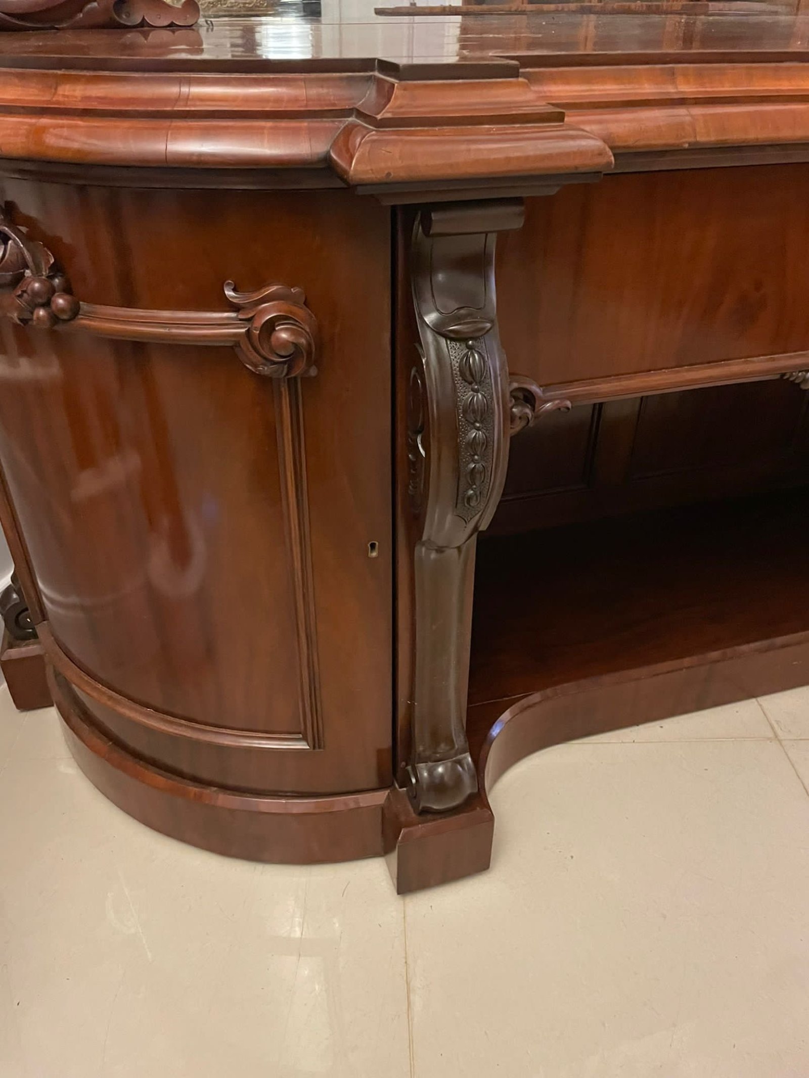Outstanding quality antique Victorian carved mahogany mirror back sideboard having a quality carved mahogany mirror back above a serpentine shaped sideboard with a central drawer flanked by a pair of bowed carved mahogany doors standing on a plinth base.