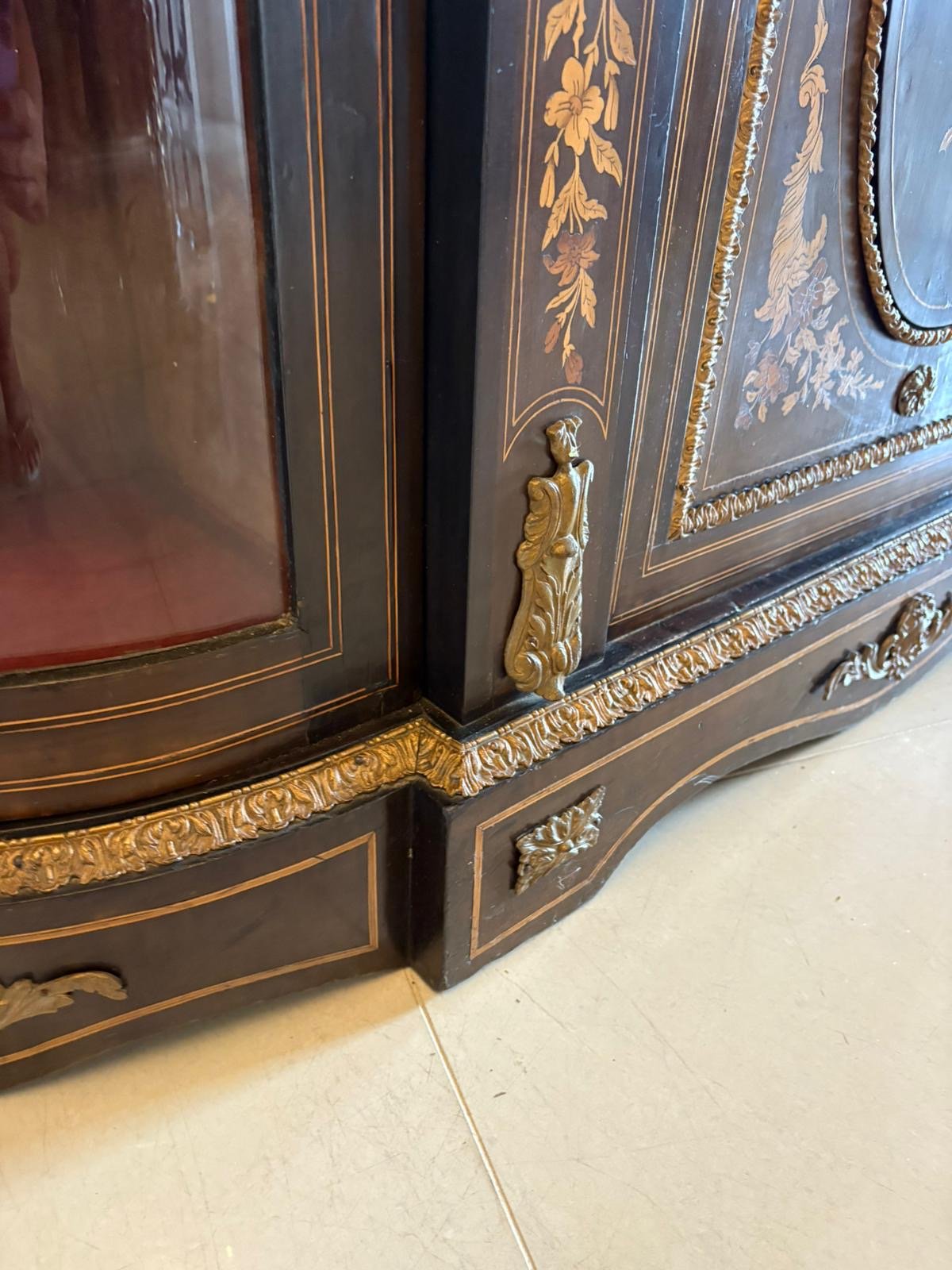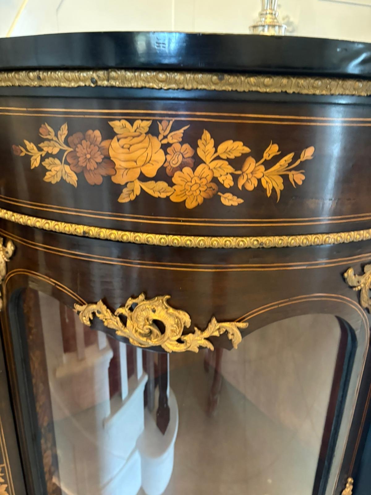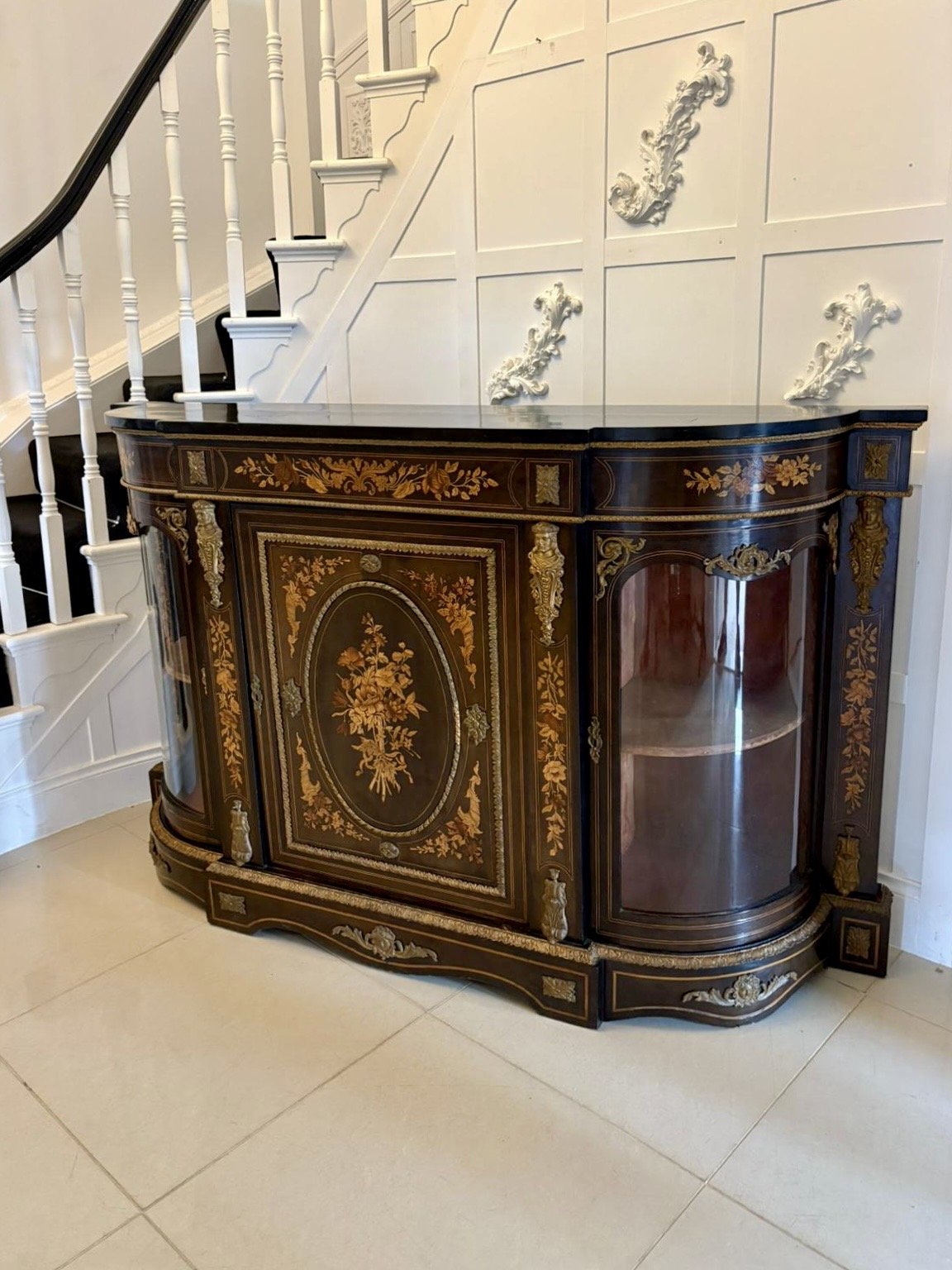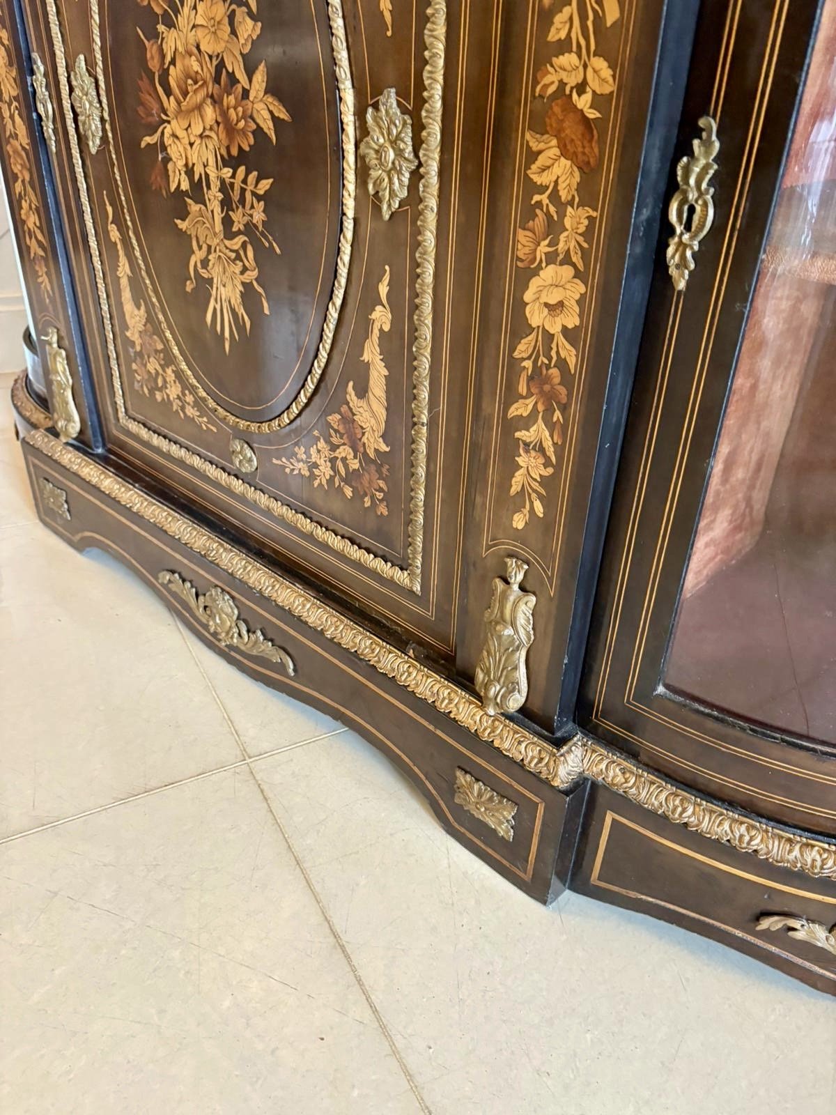 Outstanding quality antique Victorian ebonised and inlaid floral marquetry credenza/sideboard having an ebonised shaped top above an inlaid floral marquetry frieze with ornate ormolu mounts above a majestic inlaid floral marquetry door flanked by two bow ended glass doors opening to reveal a display shelf. It boasts large ornate ormolu mounts standing on a shaped plinth base