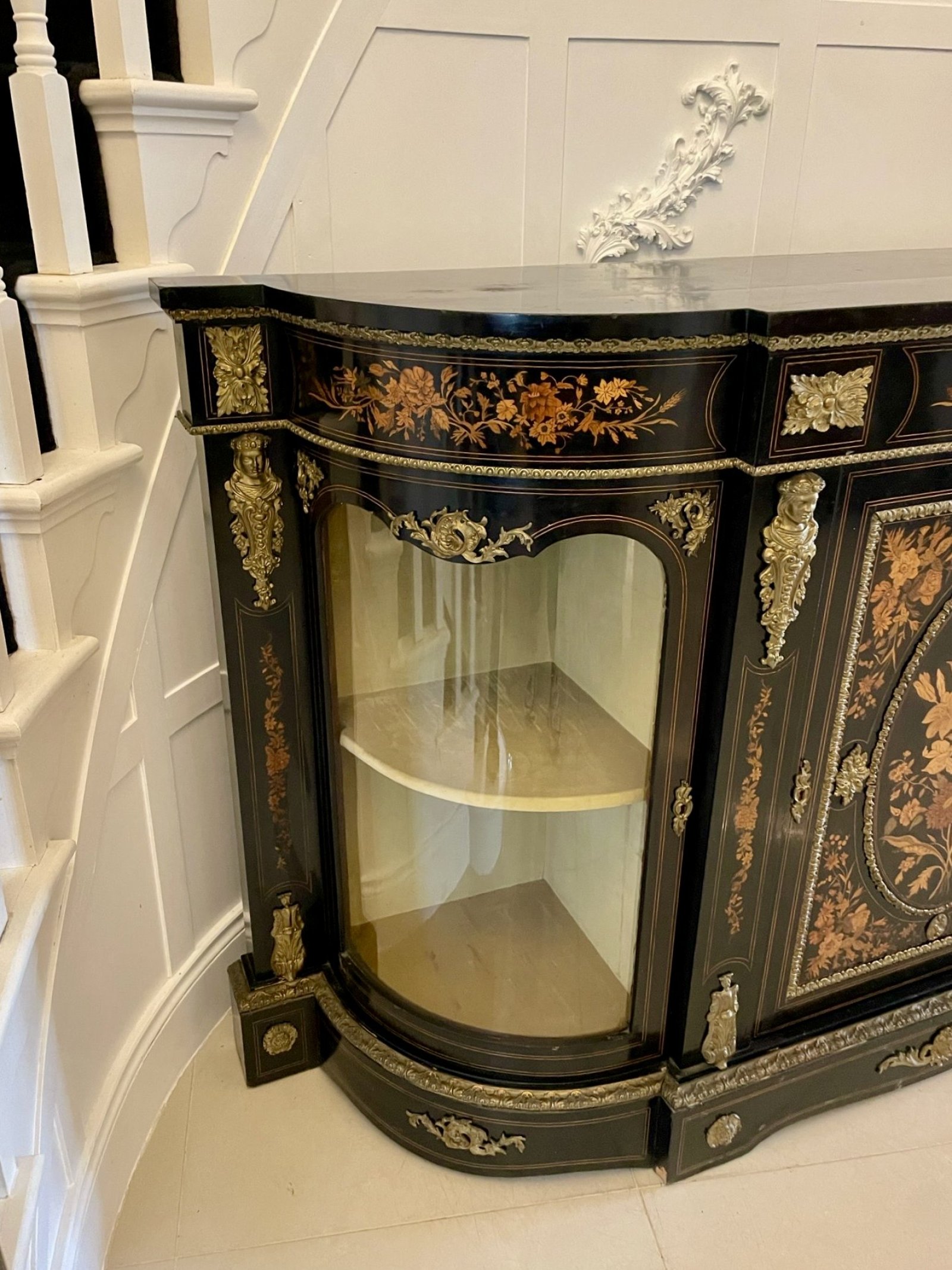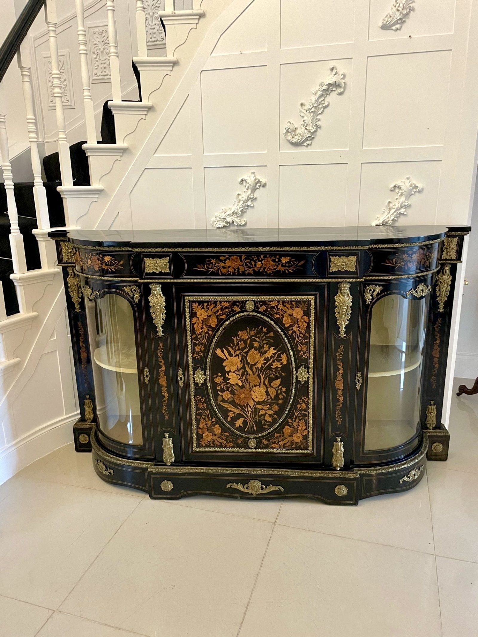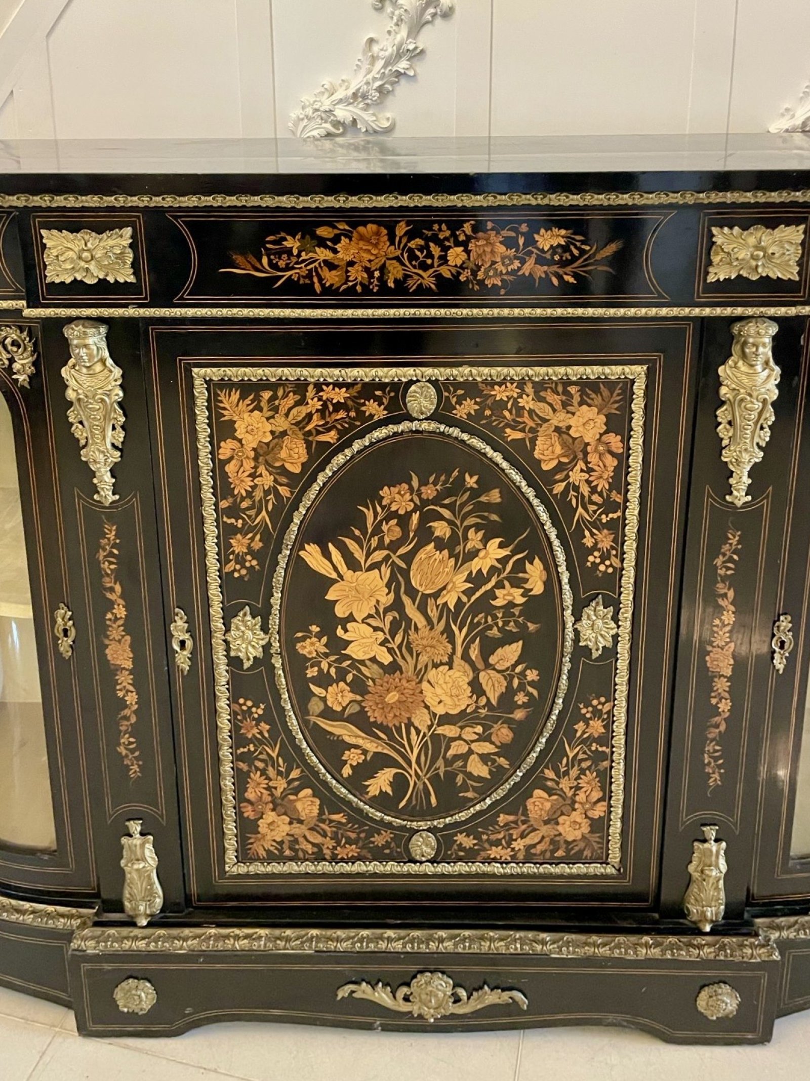 Outstanding quality antique Victorian ebonised and inlaid floral marquetry credenza/sideboard having a ebonised shaped top above an inlaid floral marquetry frieze with ornate ormolu mounts above a majestic inlaid floral marquetry door flanked by two bow ended glass doors opening to reveal a display shelf. It boasts large ornate ormolu mounts standing on a shaped plinth base