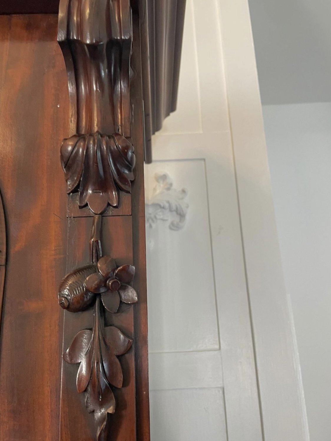 Outstanding quality antique Victorian figured mahogany glazed cupboard bookcase having a shaped moulded cornice above a figured mahogany frieze above a pair of figured mahogany glazed arched shaped doors with mahogany moulding. The doors open to reveal four adjustable shelves, two quality carved mahogany corbels with fruit, flowers and leaves. The base having one long figured mahogany drawer above a pair of outstanding quality figured mahogany cupboard doors with oval moulded panels and four carved mahogany corbels opening to reveal a fitted shelf storage compartment and a large mahogany drawer with original brass handle standing on a plinth base with a thumb moulded edge