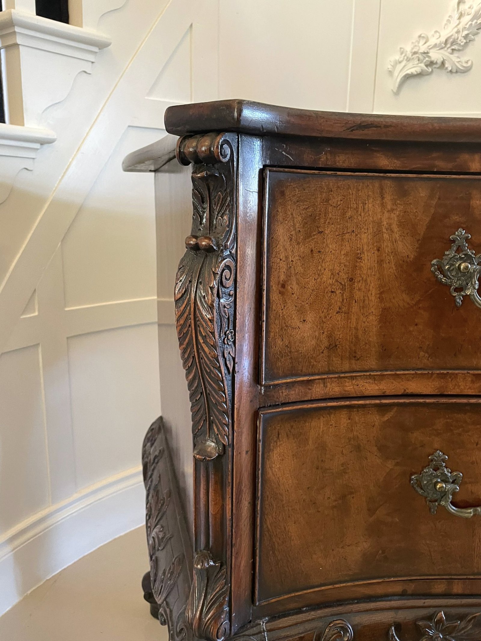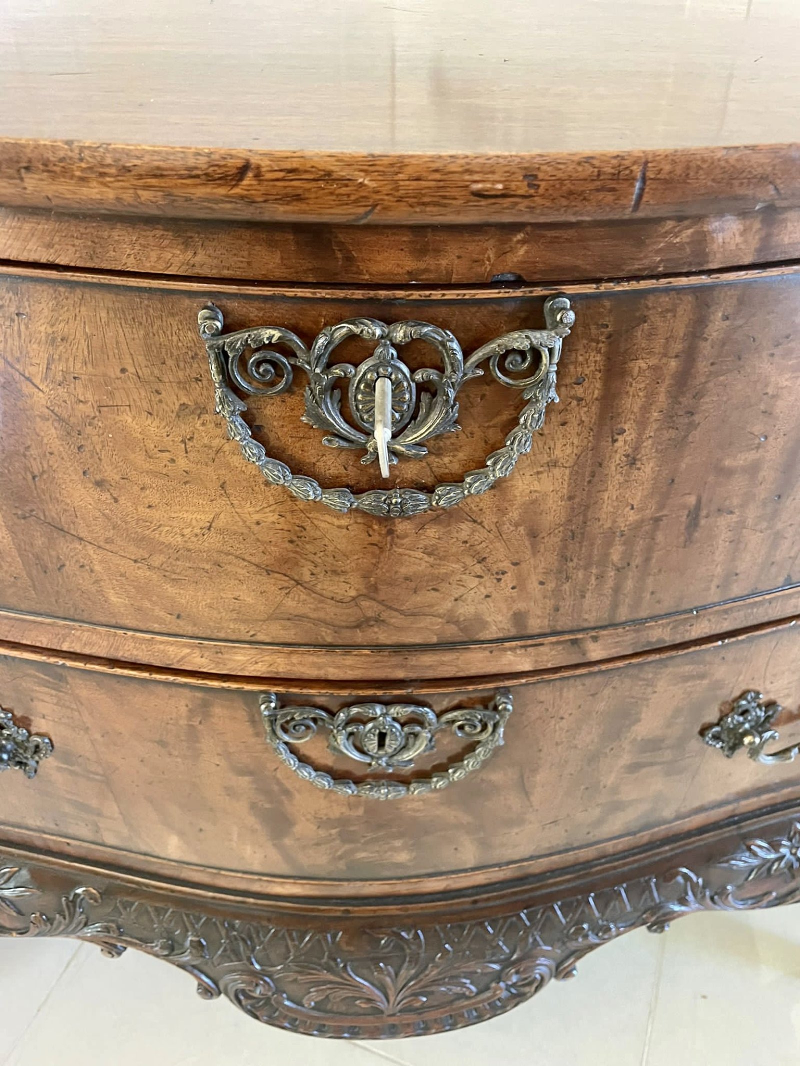 Outstanding quality antique Victorian figured mahogany serpentine shaped chest of drawers having a quality serpentine shaped mahogany top above two long figured mahogany serpentine shaped cockbeeded drawers with original ornate brass handles, fantastic quality carved mahogany corners standing on four shaped carved cabriole legs with scroll feet united by an outstanding quality carved mahogany shaped apron