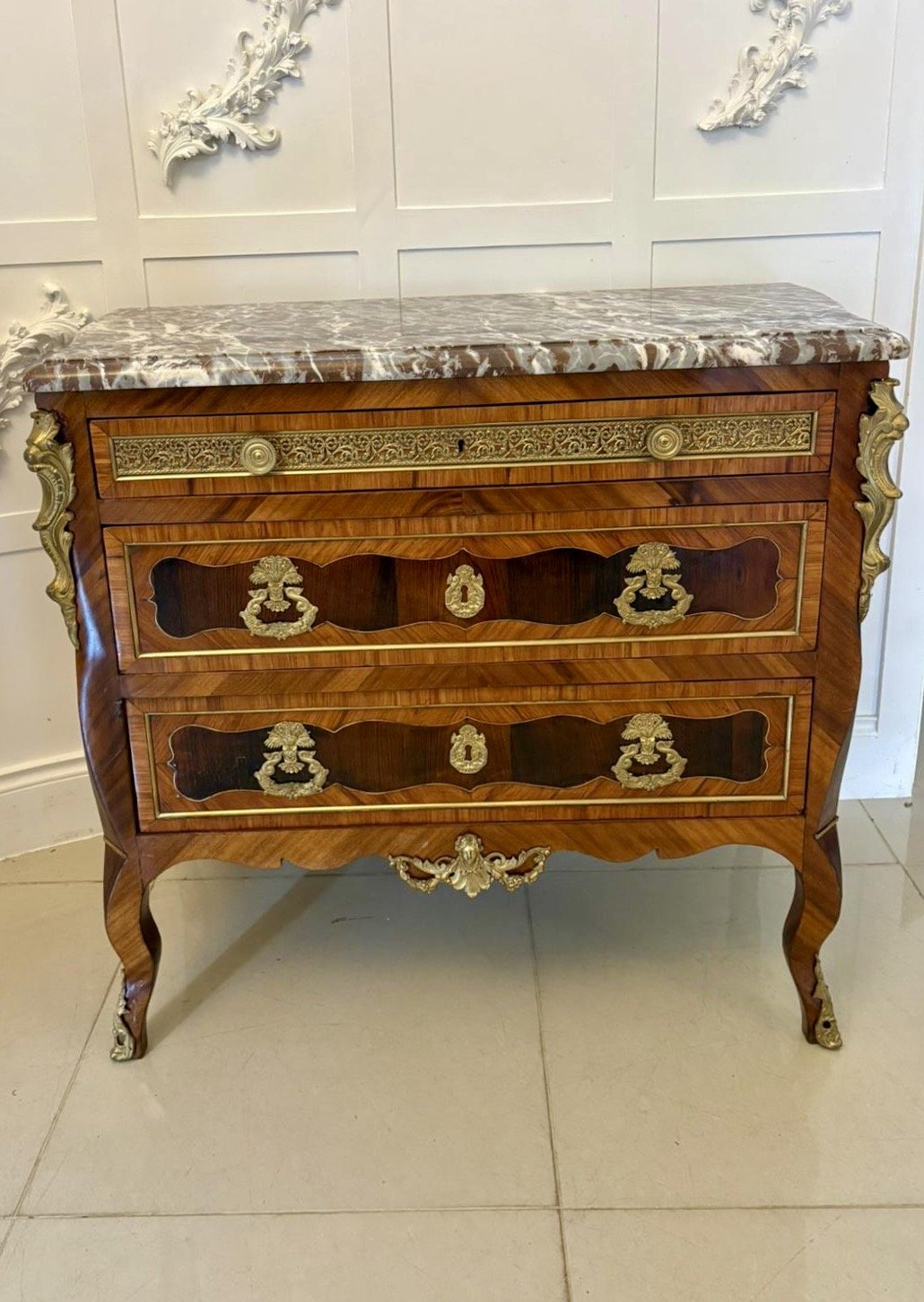 Outstanding quality antique Victorian French marble top commode chest of drawers having a pretty and shaped marble top with a moulded edge above 3 outstanding quality kingwood and ormolu mounted drawers with original ornate ormolu handles, shaped sides standing on shape cabriole legs with ormolu mounted feet.