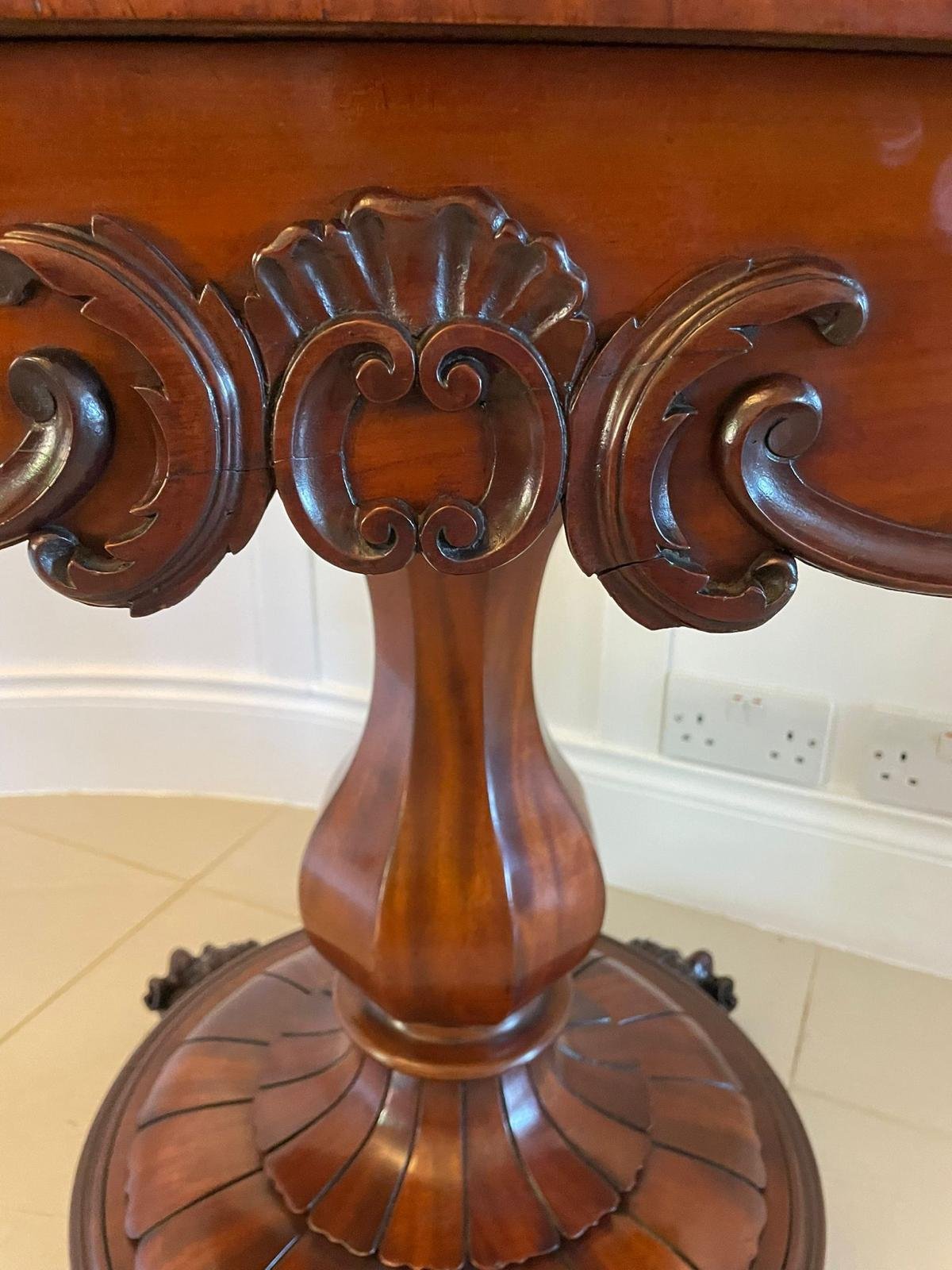 Outstanding quality antique Victorian mahogany card/side table having an outstanding quality mahogany fold over swivel top with a moulded edge opening to reveal a green baize interior above a shaped carved mahogany frieze. It is supported on an octagonal baluster column standing on a magnificent quality mahogany circular carved platform base raised by four carved mahogany scroll feet