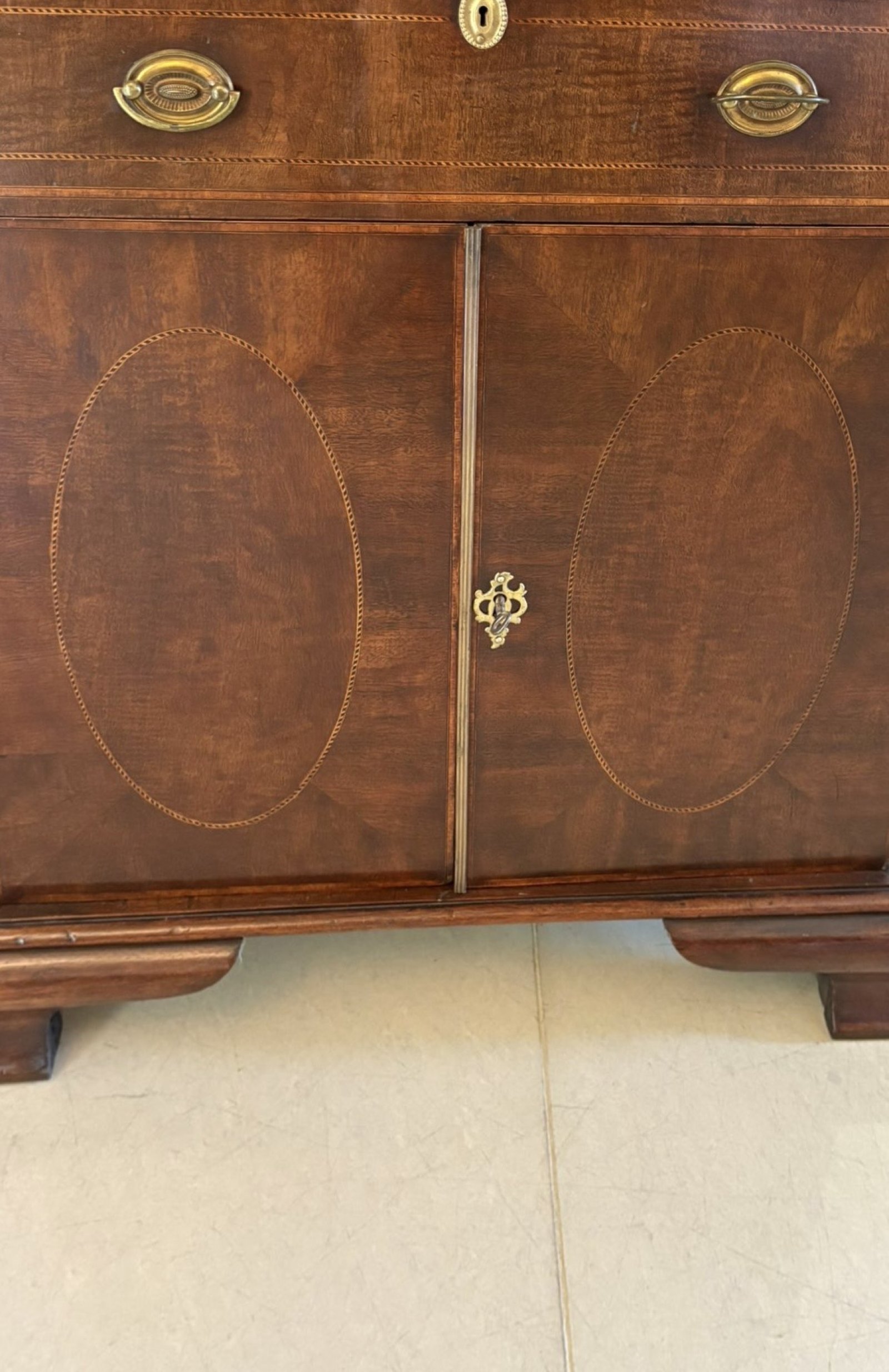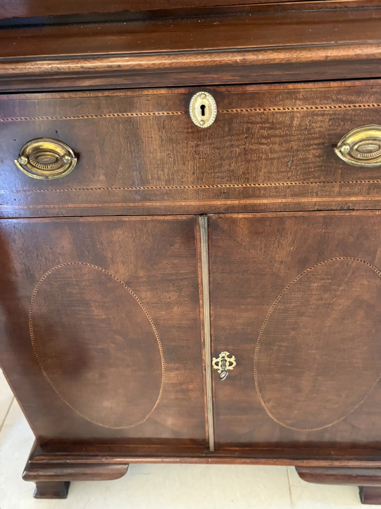 This exceptional cabinet is a rare find, showcasing the superior craftsmanship of a bygone era. Its unique design, detailed inlay, and rich patina make it a truly special piece.