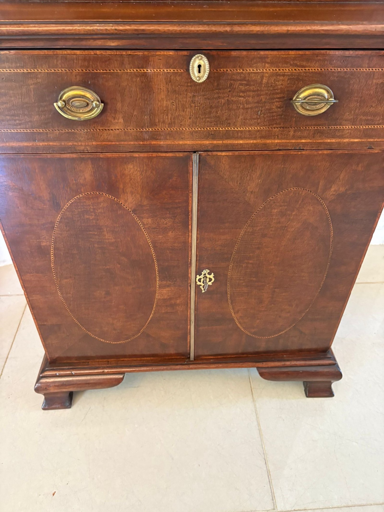 Outstanding quality antique Victorian mahogany inlaid bookcase having a mahogany swan neck pediment, shaped cornice above a quality mahogany inlaid astral glazed door opening to reveal three adjustable shelves above one long drawer with original oval brass handles above a pair of figured mahogany oval inlaid doors opening to reveal a shelf storage compartment standing on original shaped ogee bracket feet.