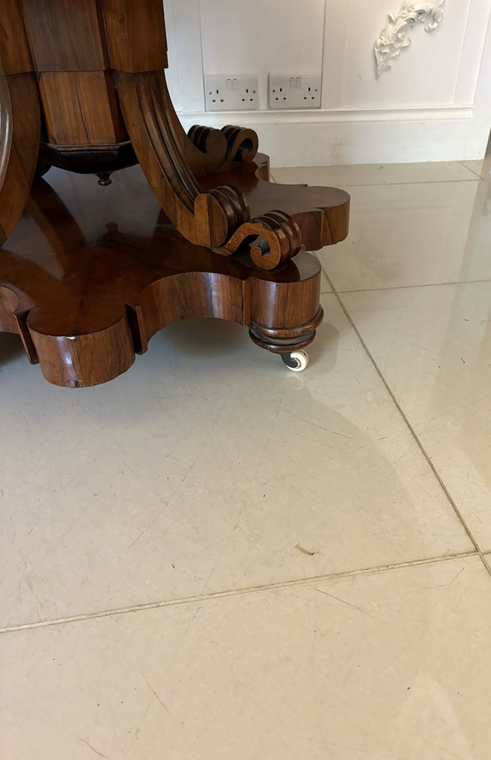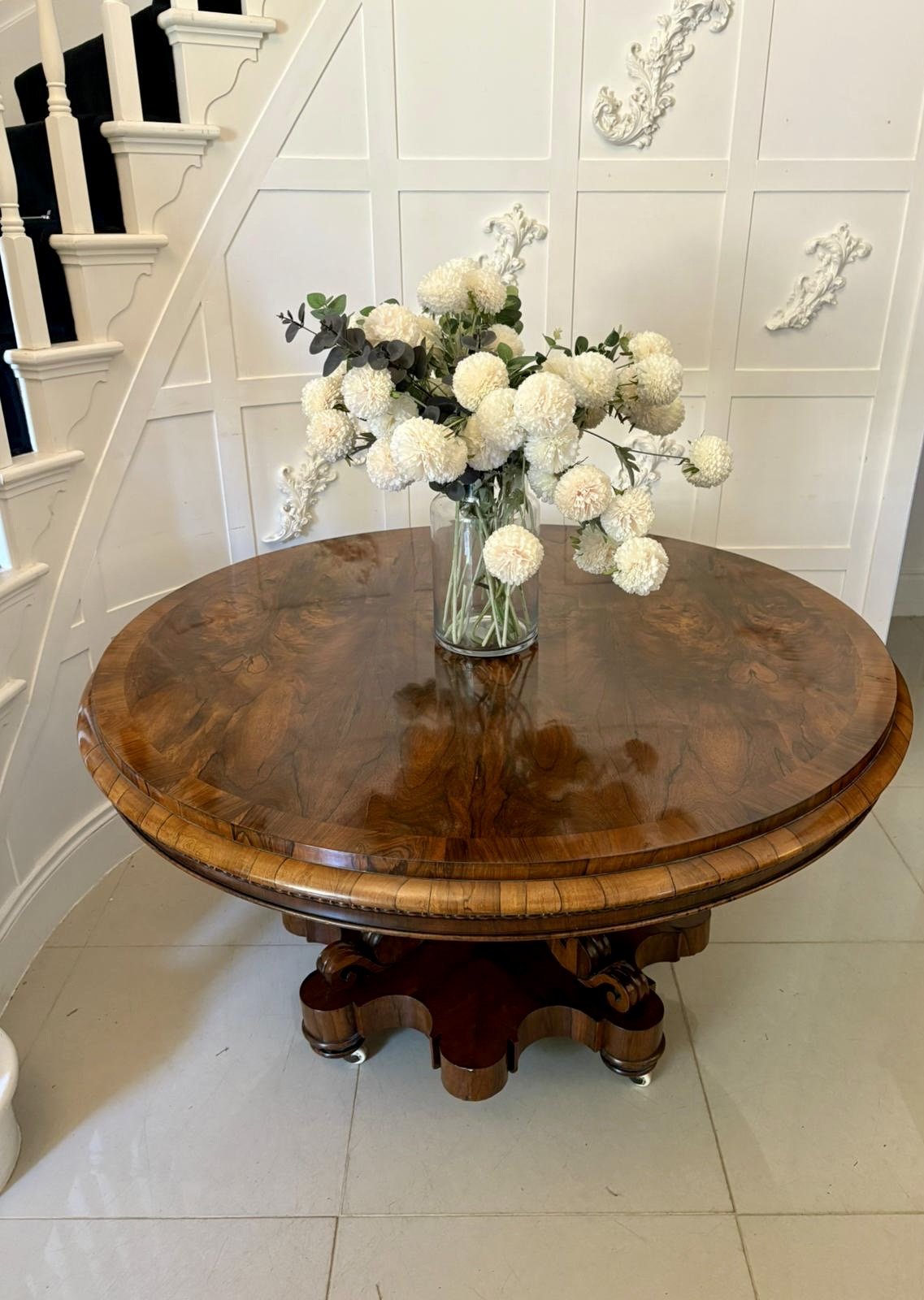 Outstanding quality antique Victorian rosewood circular centre/dining table having a magnificent quality rosewood crossbanded tilt top with an unusual carved moulded edge supported by a pedestal column with four shaped scrolls standing on a fantastic scalloped shaped platform base with original castors.