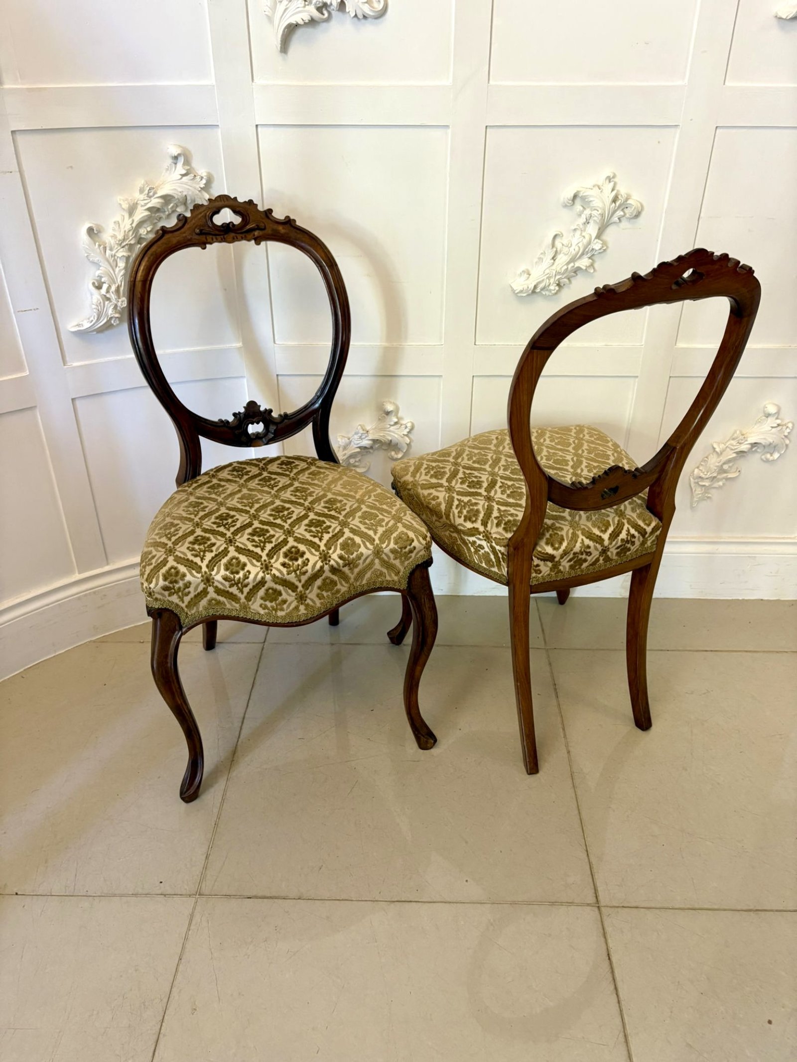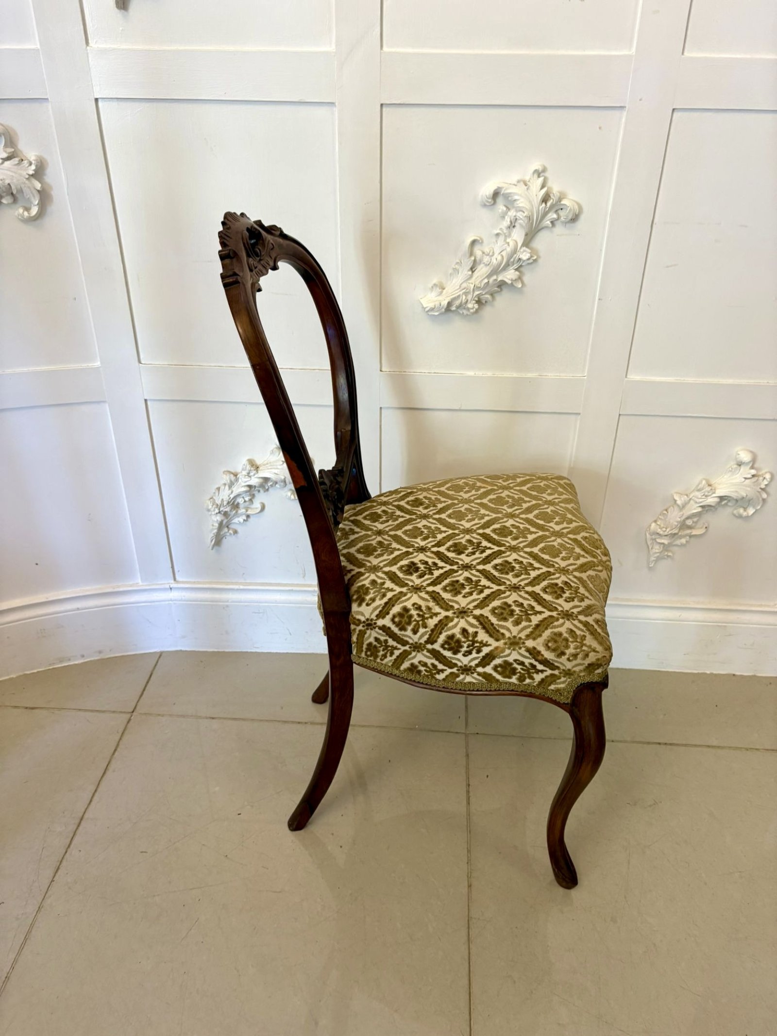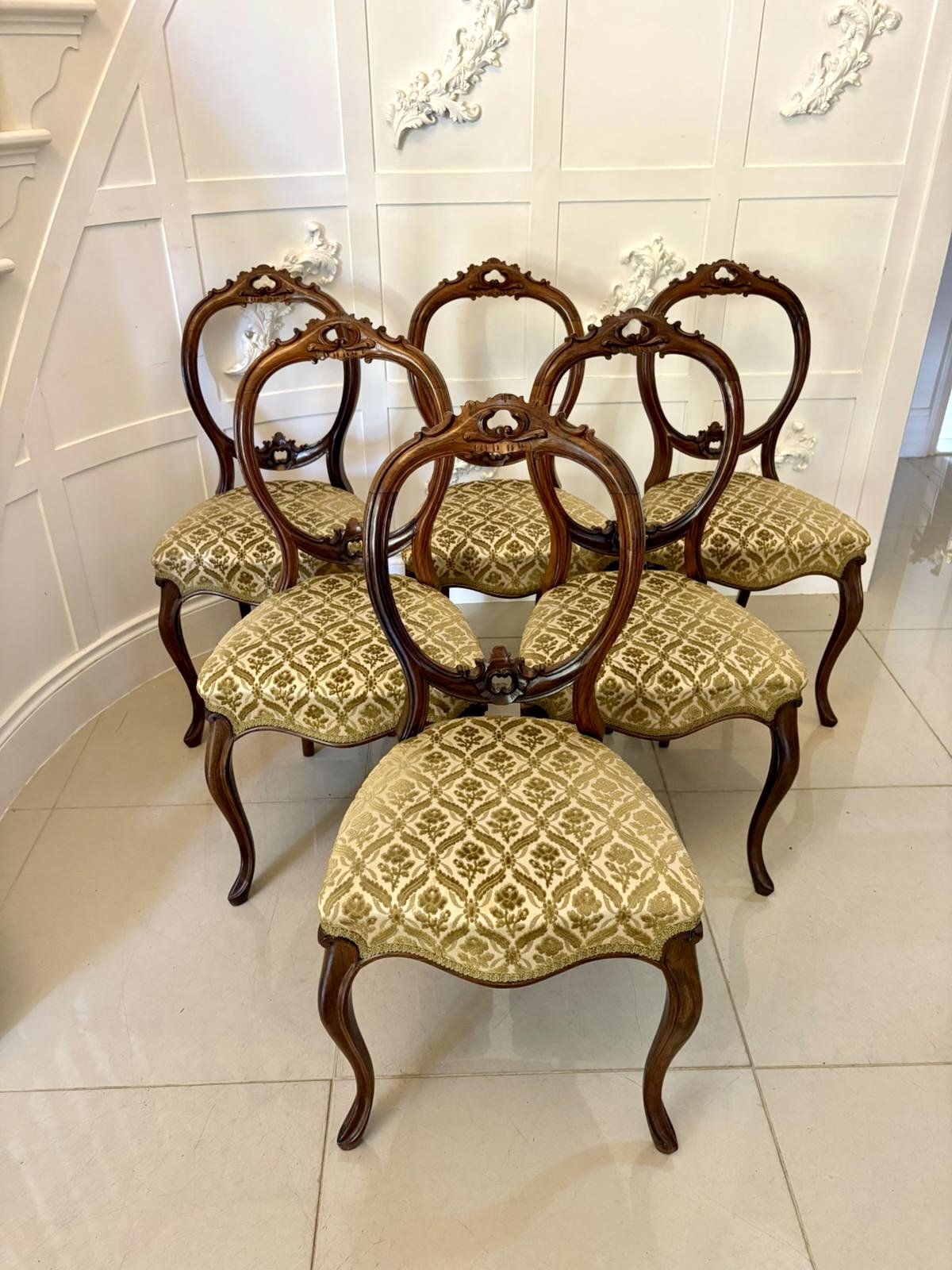 Outstanding quality antique Victorian set of six carved walnut dining chairs having a wonderful quality carved walnut balloon back, upholstered serpentine shaped seats in a quality fabric standing on shaped carved cabriole legs to the front and out swept back legs.