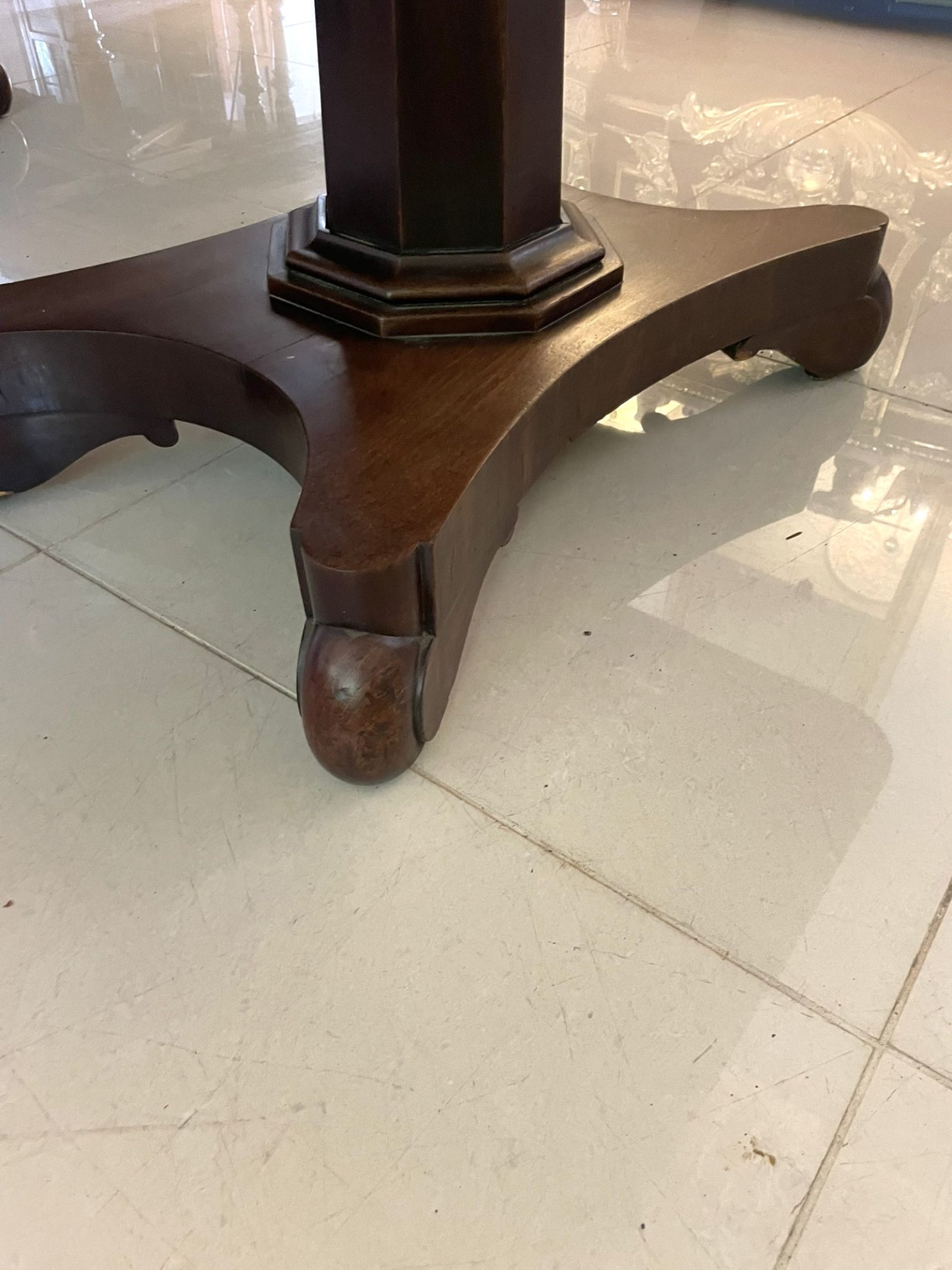 It stands on three well-balanced pedestal bases each with a boldly faceted column and triform platform terminating in shaped bun feet. The rectangular top features a finely moulded edge and extends smoothly to accommodate additional leaves offering versatility for both formal entertaining and everyday dining.