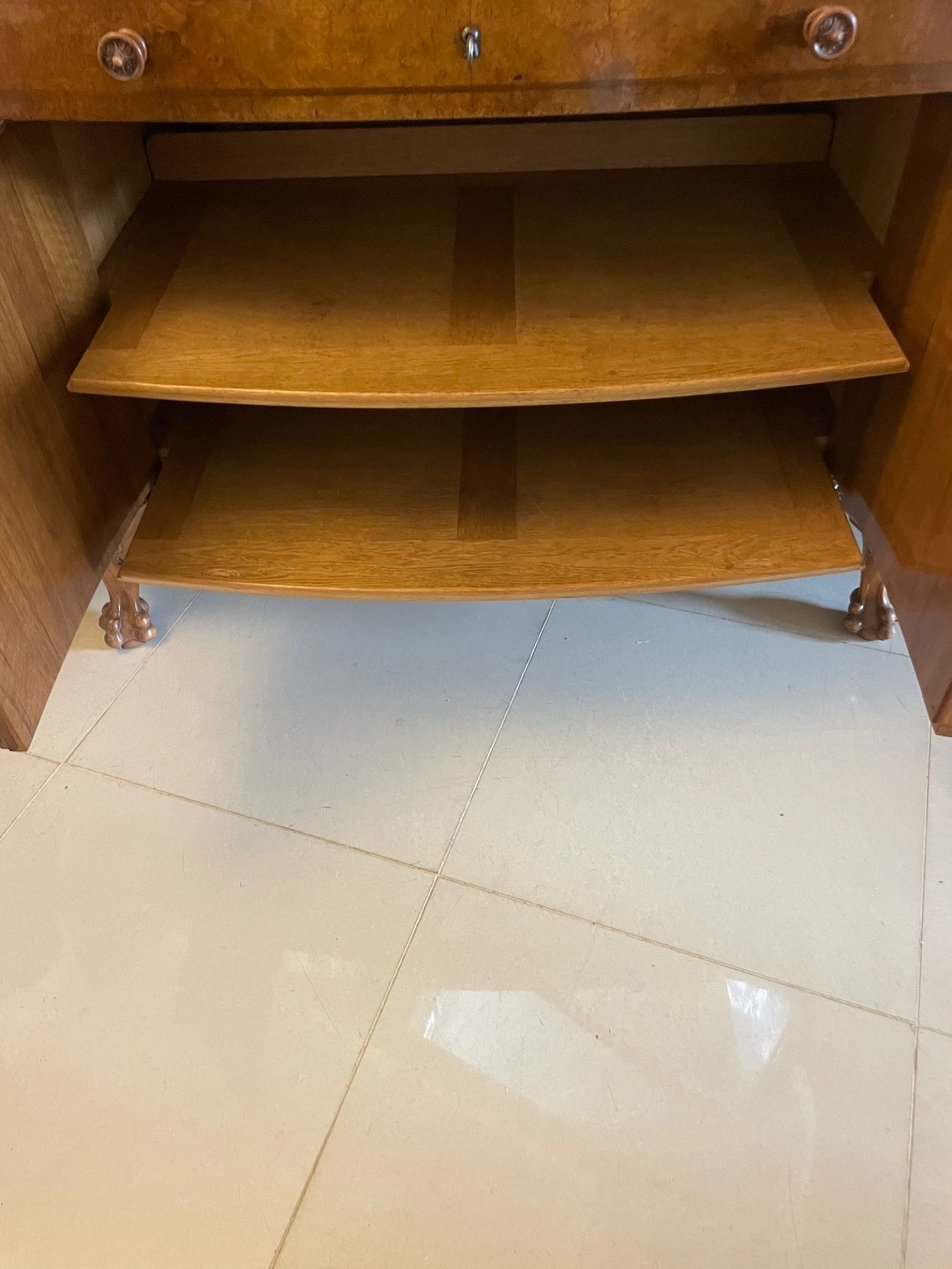 Outstanding quality large antique carved burr walnut bow fronted sideboard having an outstanding quality burr walnut bow fronted top with a carved edge above a bow fronted centre drawer with original carved walnut knobs flanked by unusual swing out burr walnut drawers boasting lovely carved bells and flowers above a pair of bow fronted burr walnut doors opening to reveal two sliding storage shelves flanked by two bow fronted end doors opening to reveal a shelved interior standing on carved walnut shaped cabriole legs with claw and ball feet