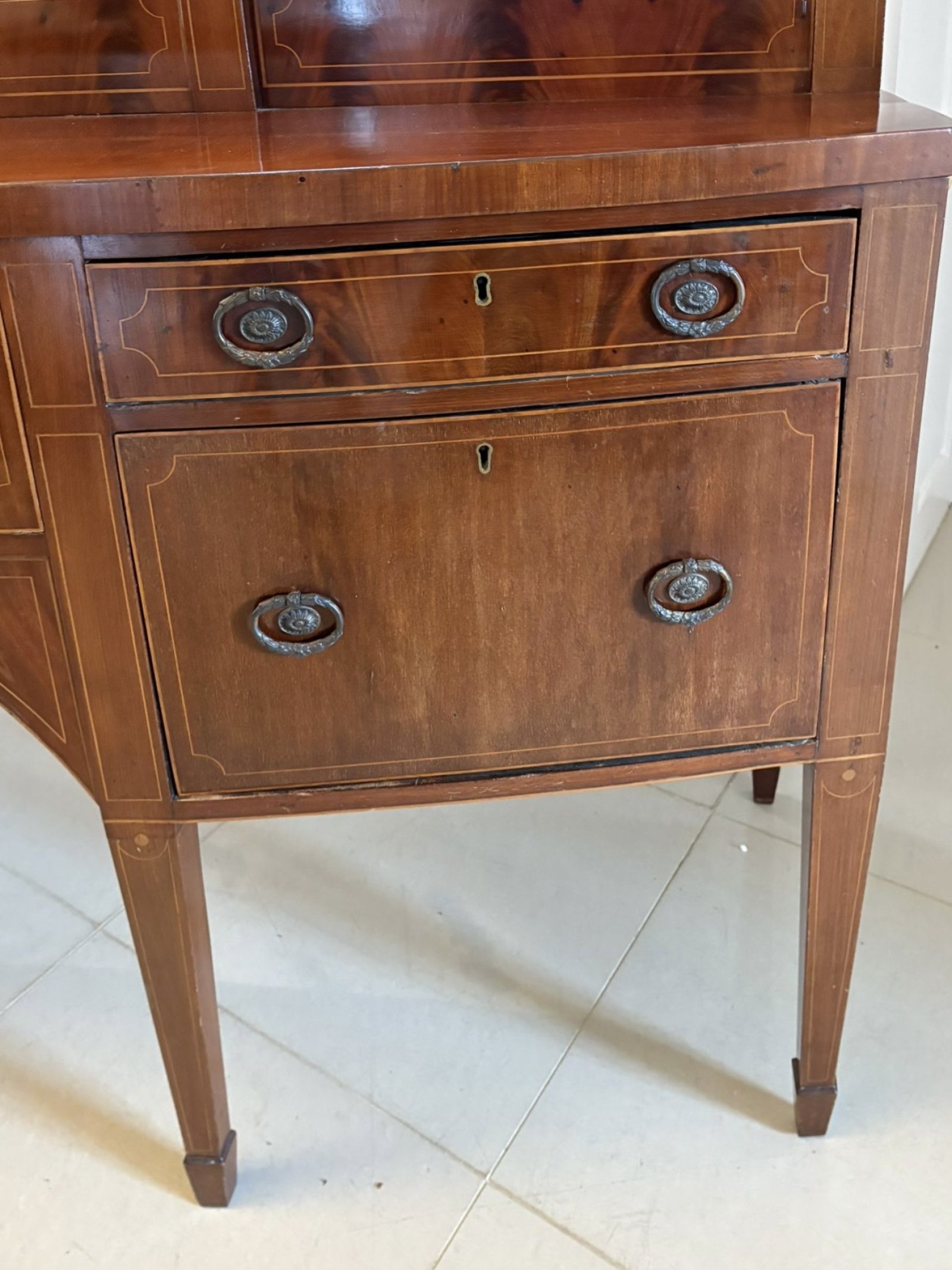 Outstanding quality large antique George III mahogany and boxwood strung bow fronted sideboard having a magnificent quality mahogany inlaid raised superstructure with two sliding doors opening to reveal storage compartments above a figured mahogany bow fronted top above four mahogany inlaid oak lined drawers with original ornate brass handles and a bow fronted door opening to reveal five cutlery drawers. It stands on six square tapering inlaid mahogany square legs with spade feet.
