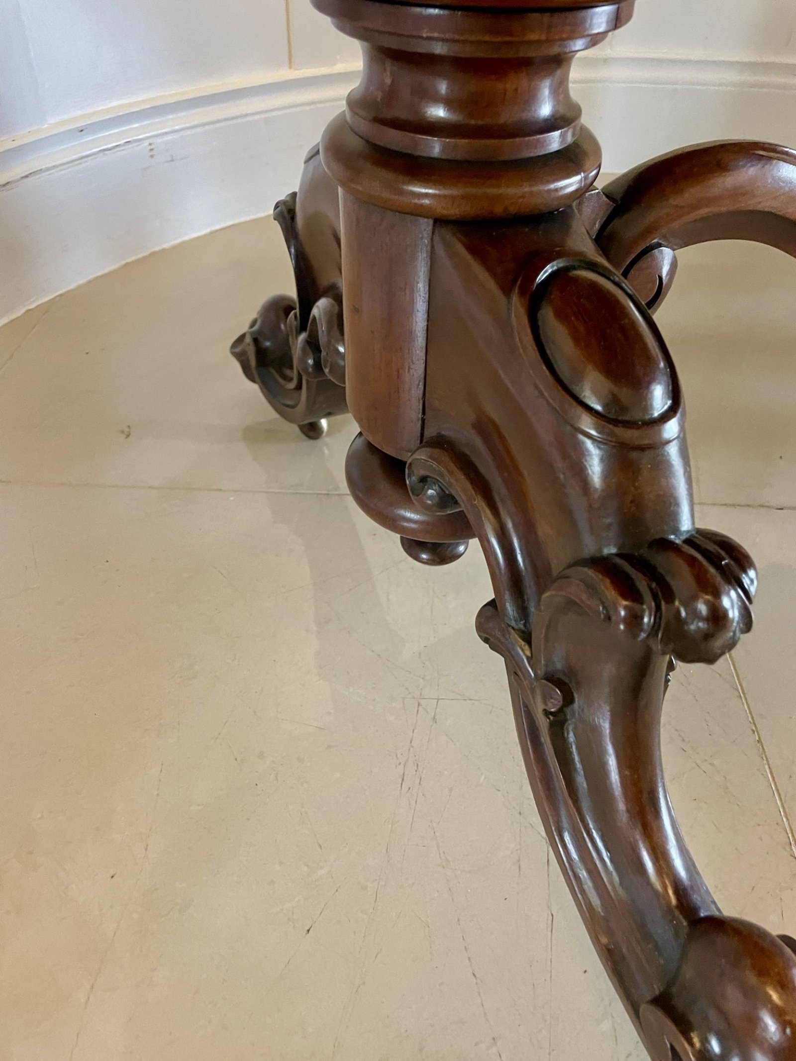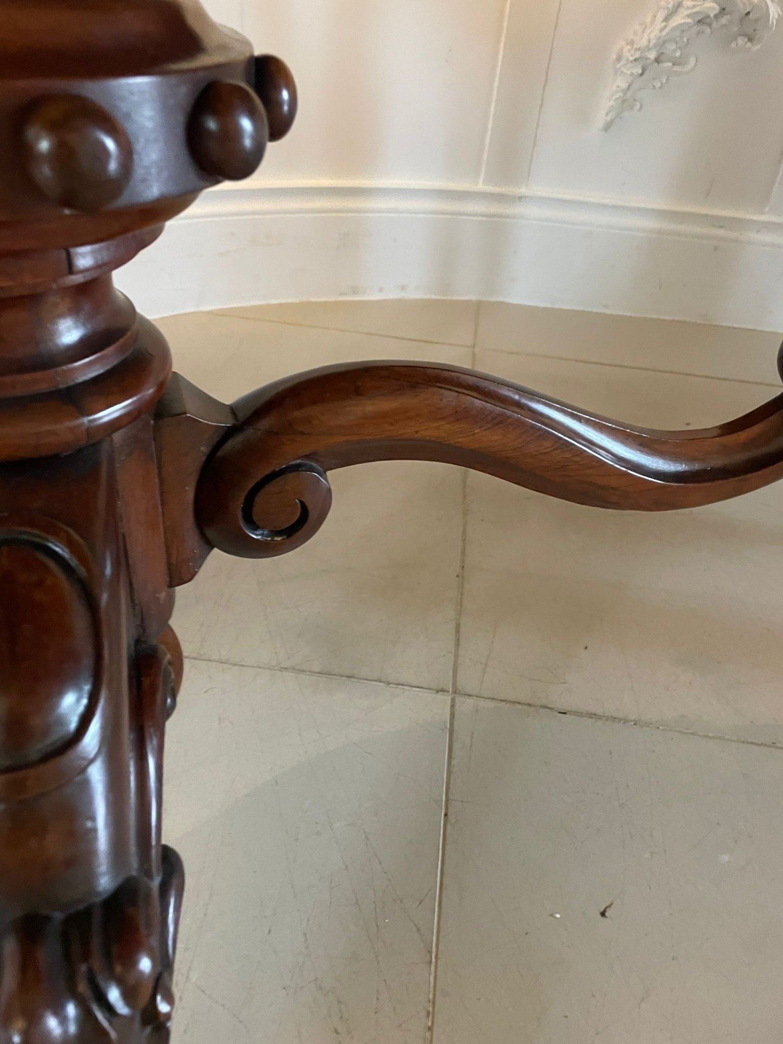Outstanding quality large antique Victorian rosewood centre/dining table having a magnificent quality serpentine shaped rosewood top with a thumb moulded edge supported on superior turned reeded carved solid rosewood pedestal columns standing on shaped carved cabriole legs with scroll feet original castors united by a shaped carved rosewood stretcher
