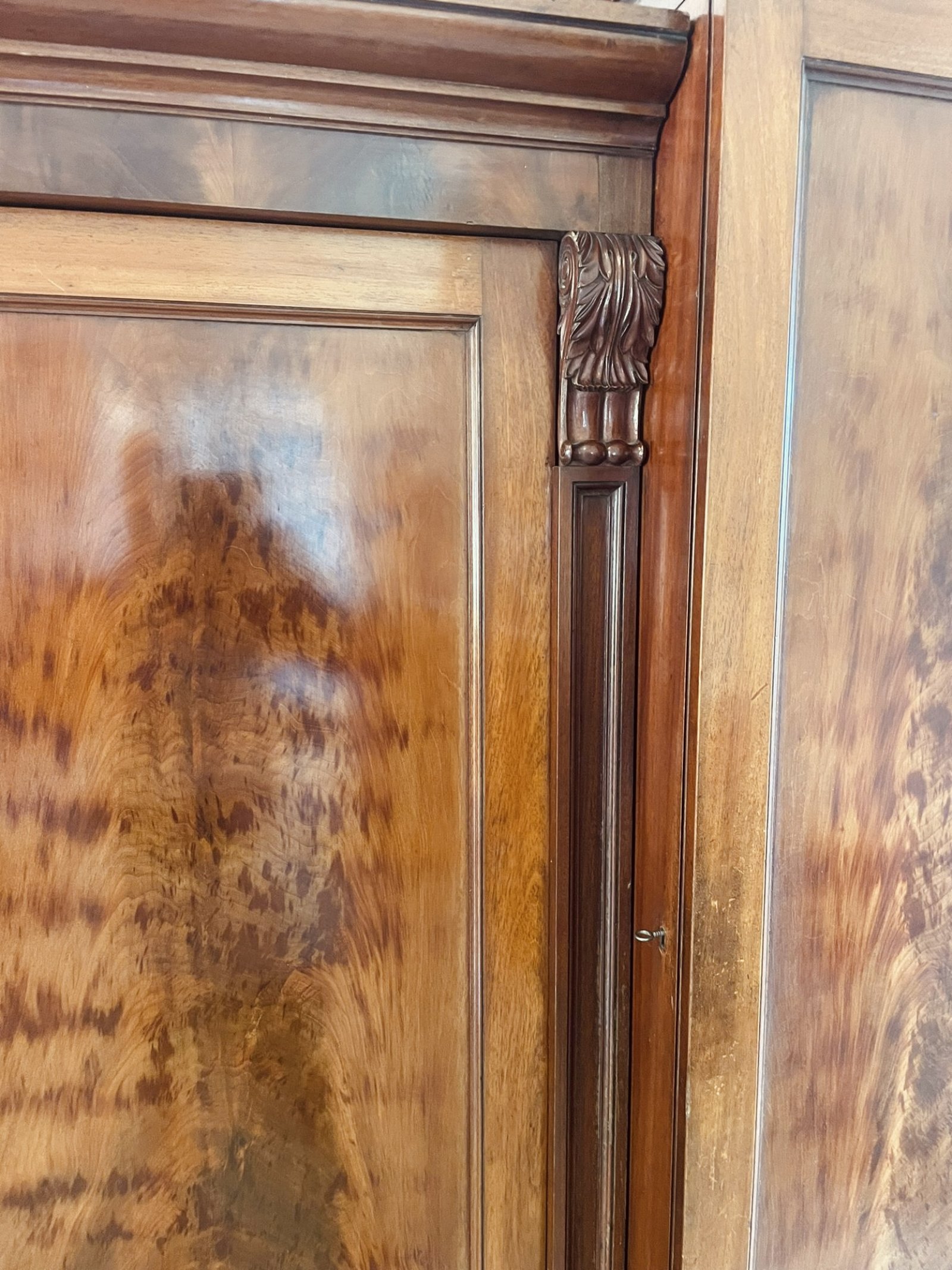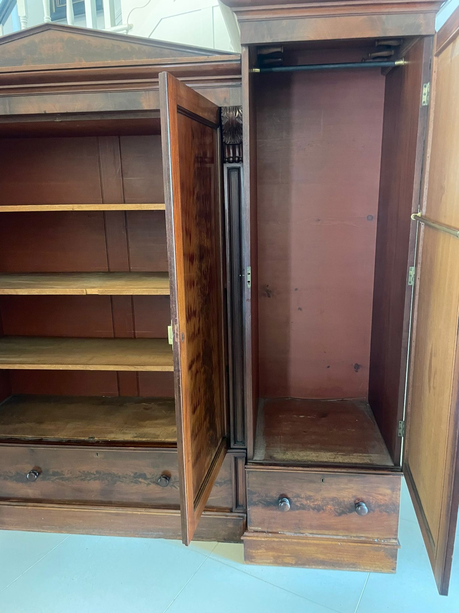 Outstanding quality large Victorian antique figured mahogany four door wardrobe having two moulded cornices and a figured mahogany pediment to the centre, two figured mahogany panelled doors below opening to reveal three storage shelves flanked by a pair of figured mahogany doors. These doors open to reveal hanging compartments above three mahogany drawers with original turned mahogany handles standing on a plinth base