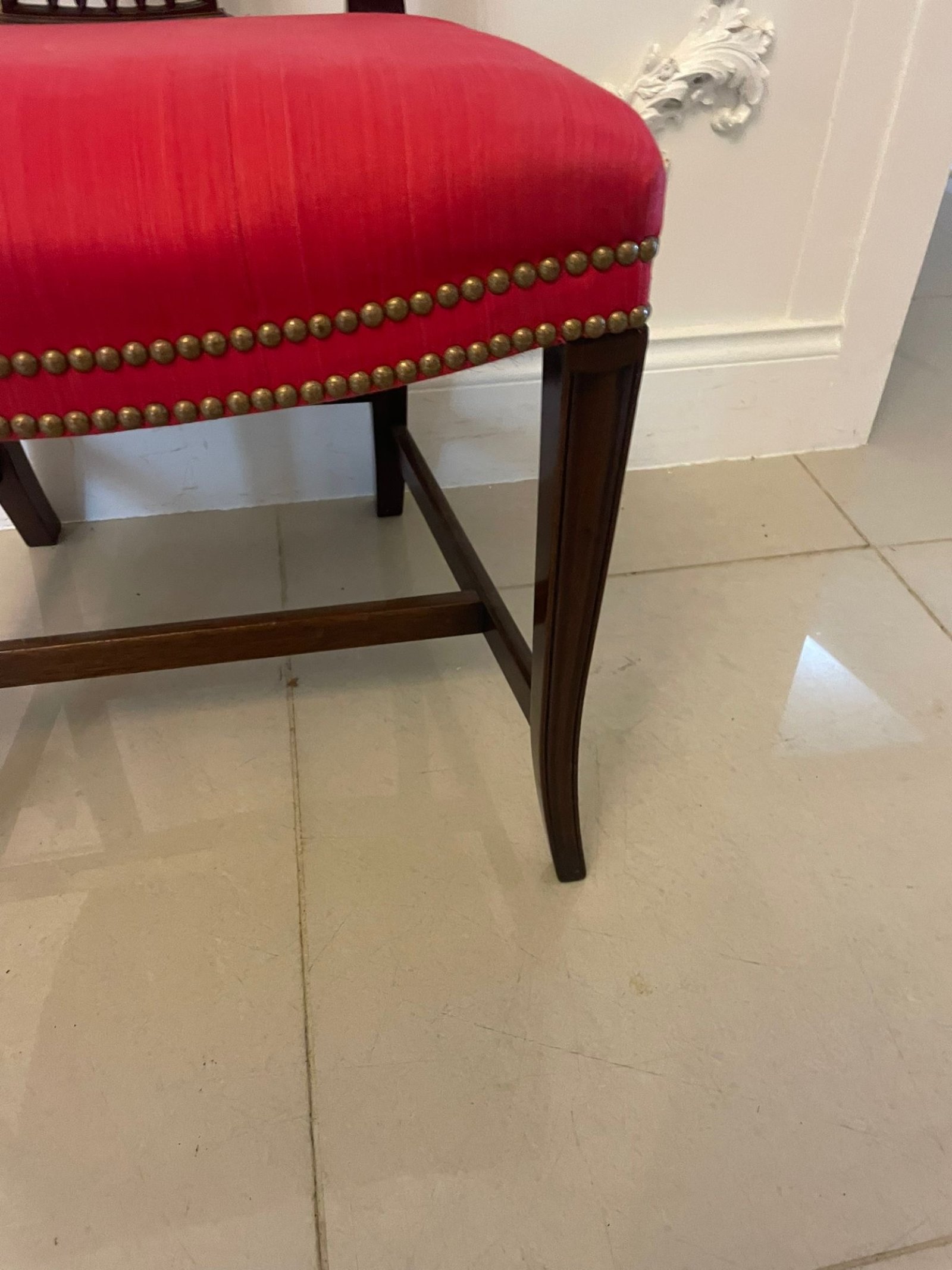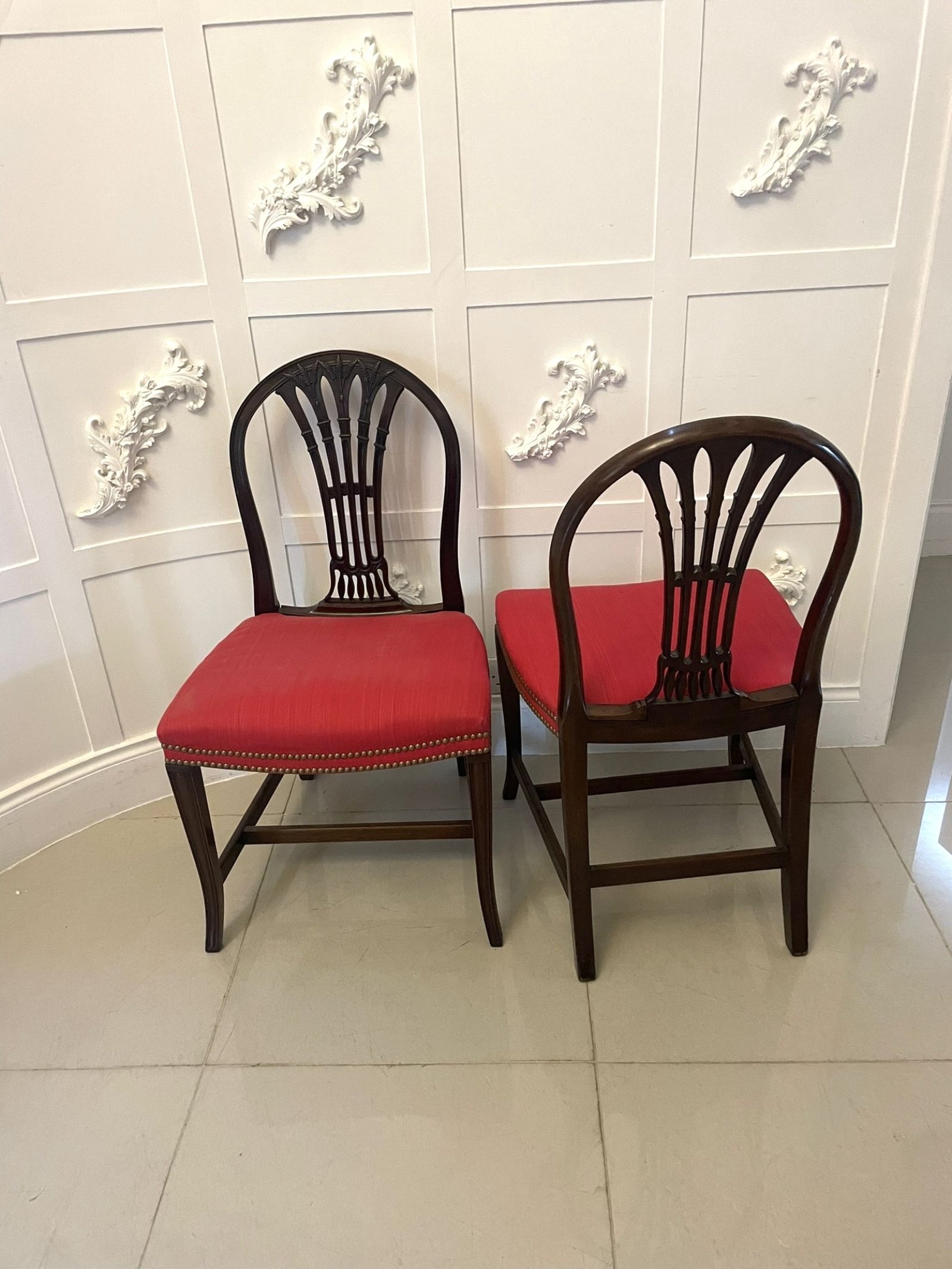 Outstanding quality set of 4 antique Victorian carved mahogany dining chairs having a marvellous quality carved mahogany shaped back, newly reupholstered seats in a quality fabric standing on square tapering moulded legs with splayed feet and out swept back legs united by mahogany stretchers