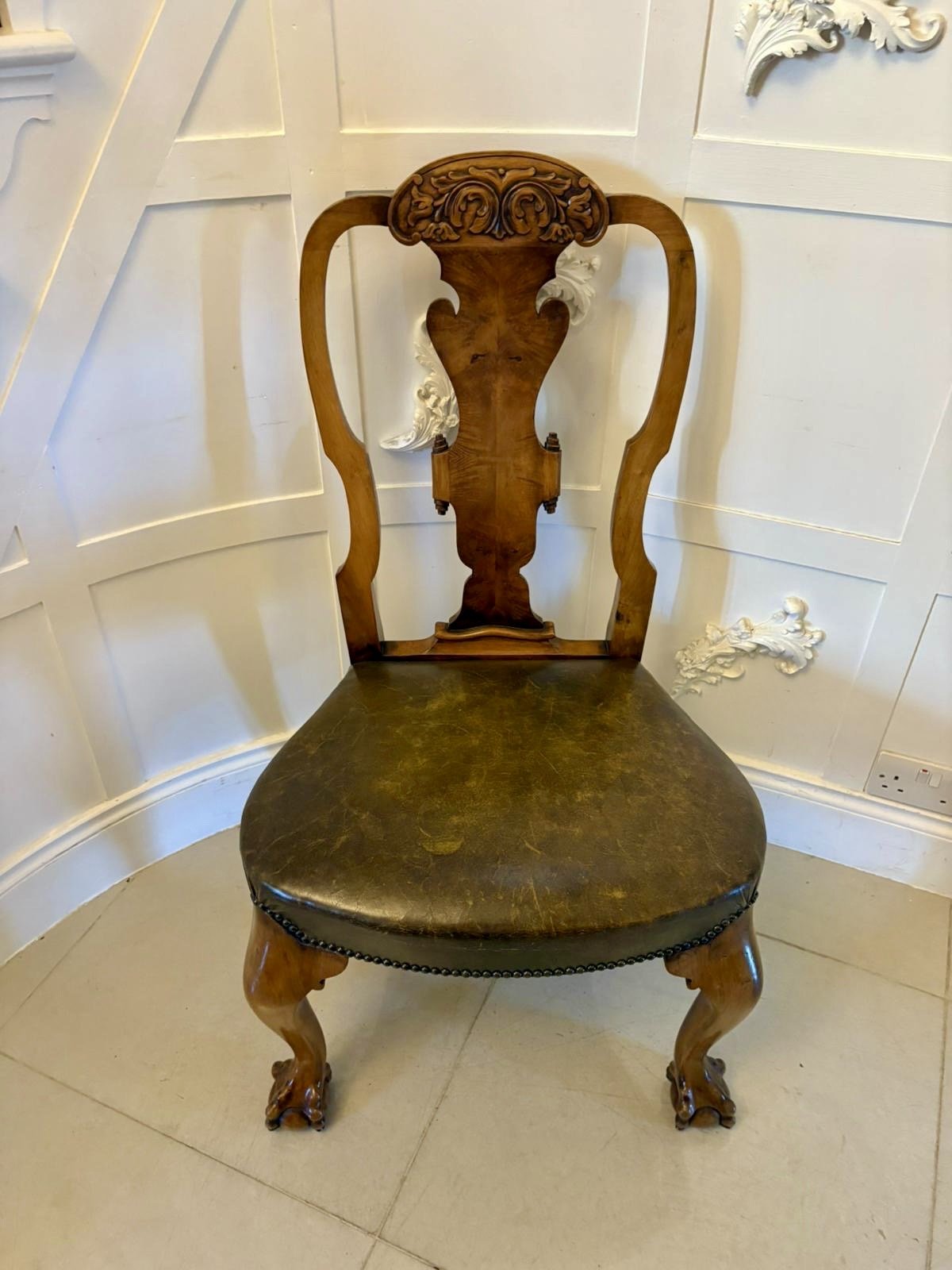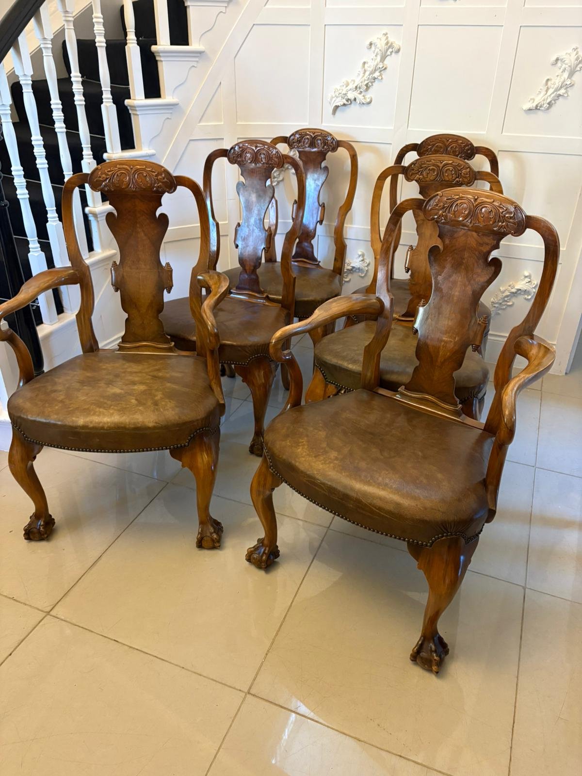 Outstanding quality set of 6 antique Victorian carved walnut dining chairs consisting of a pair of elbow chairs and 4 single chairs having marvellous quality carved walnut shape tops, fantastic shaped burr walnut centre splats, elbow chairs having shaped open arms, original leather seats standing on shaped cabriole legs with claw and ball feet and outswept back legs.