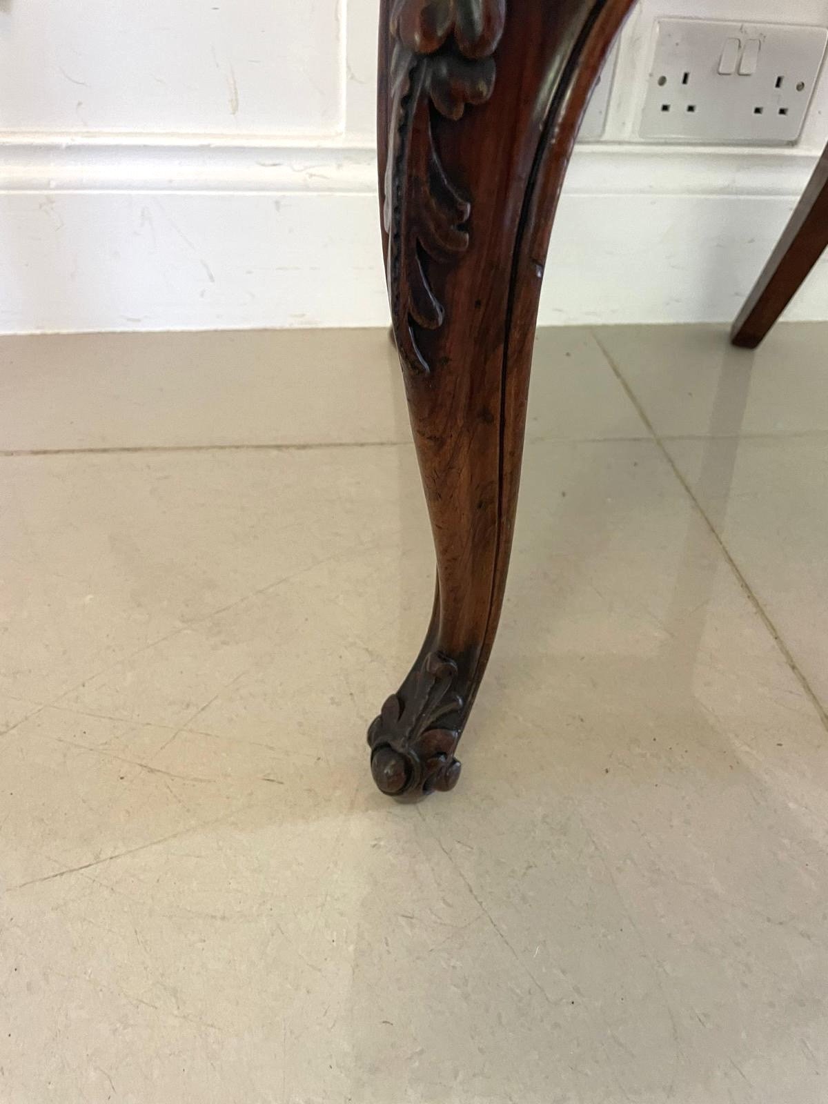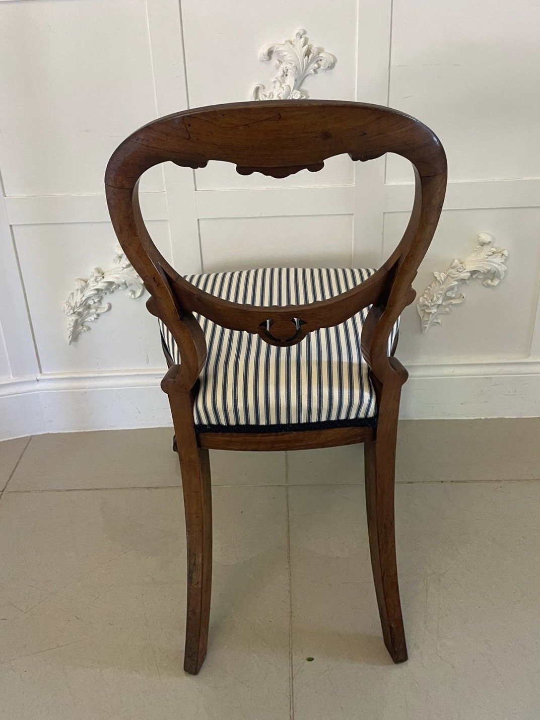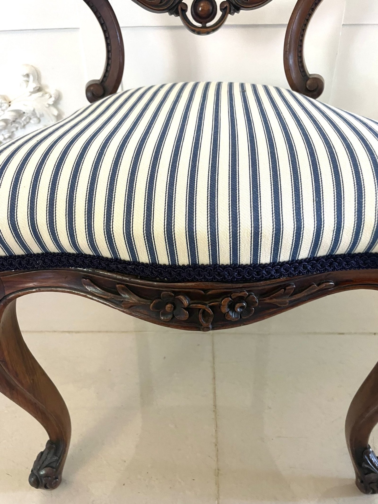 Outstanding quality set of 6 antique Victorian carved walnut dining chairs having a magnificent quality carved walnut balloon back with carved walnut scroll shaped supports, newly reupholstered seats in a quality fabric, serpentine shaped carved walnut frieze standing on shaped carved walnut cabriole legs with carved feet and out swept back legs