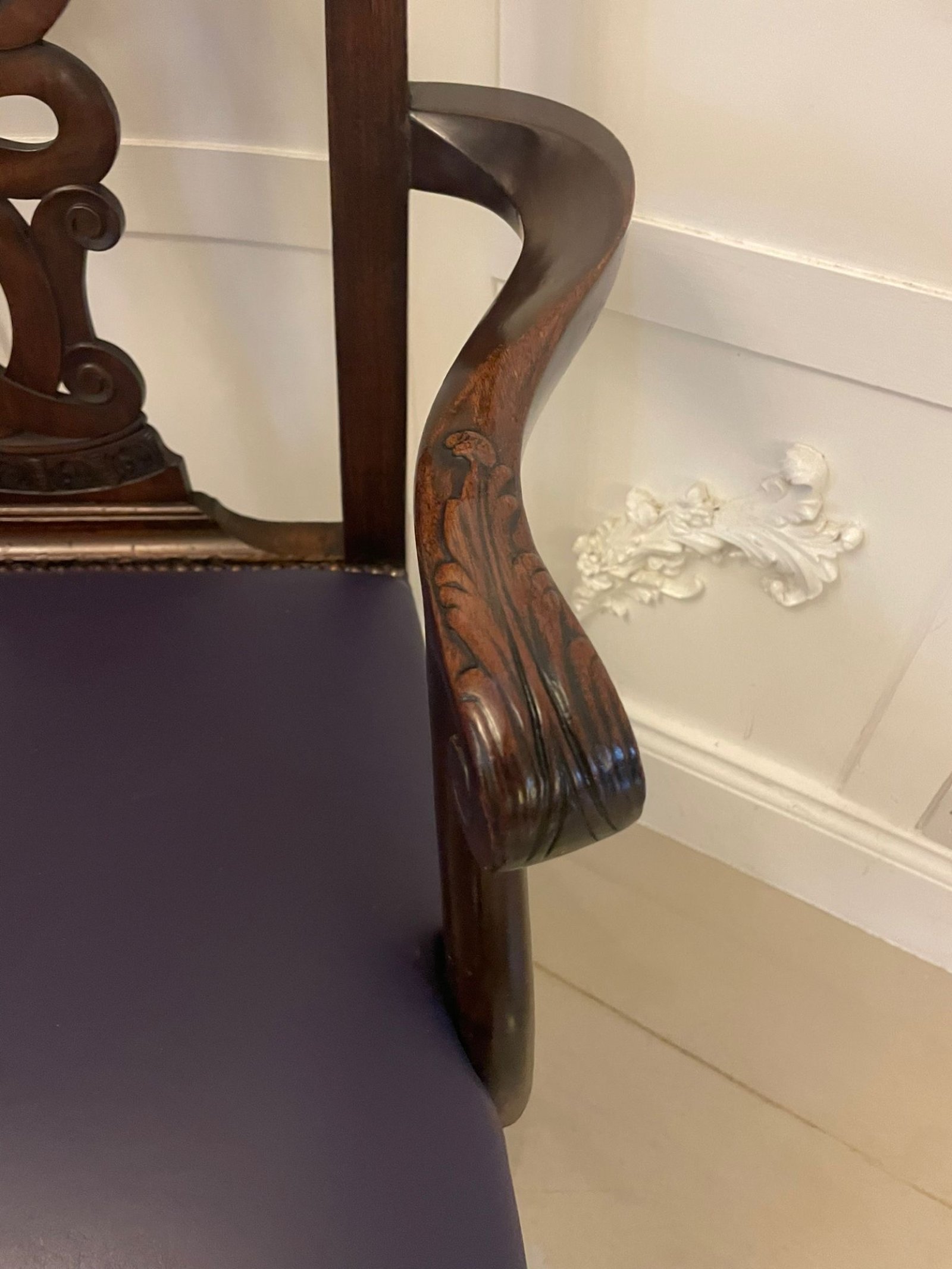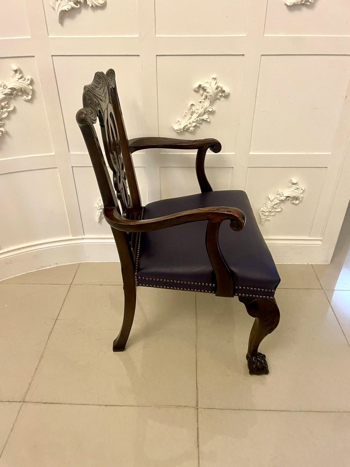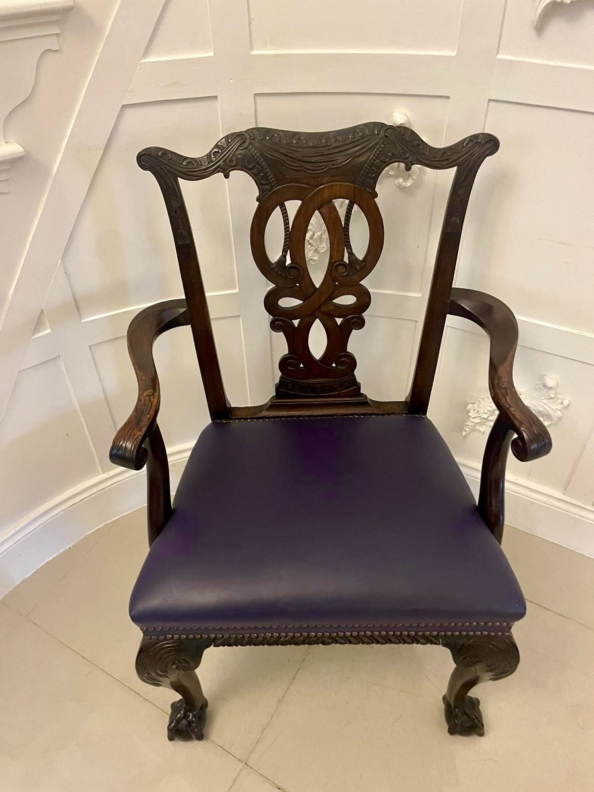 Outstanding quality set of 8 antique Victorian carved mahogany dining chairs consisting of 6 single and 2 elbow chairs having a magnificent carved mahogany back with scrolls, ribbons and bells, newly reupholstered seats in a quality leather standing on carved mahogany shaped cabriole legs with claw and ball feet, out swept back legs with block feet