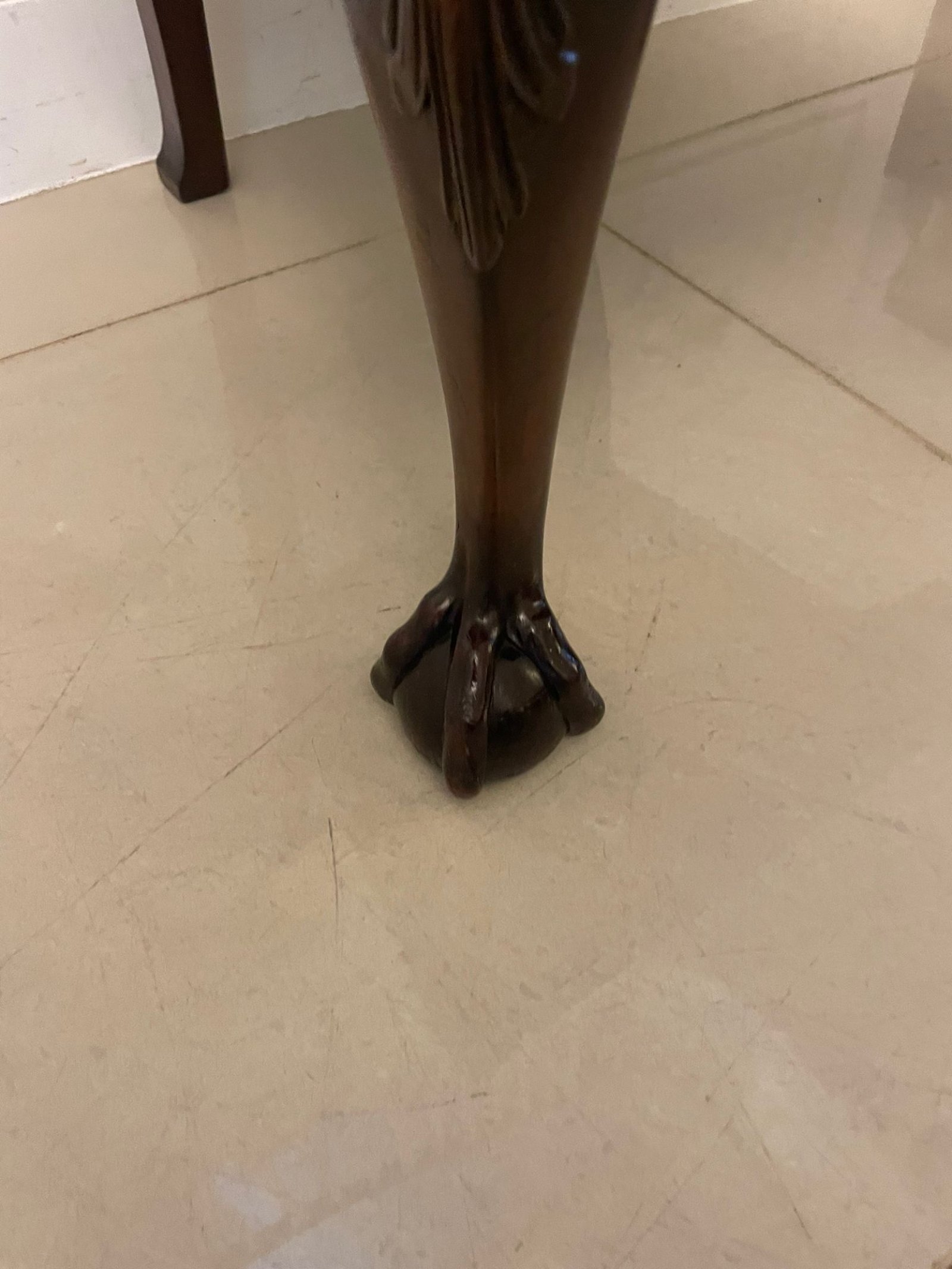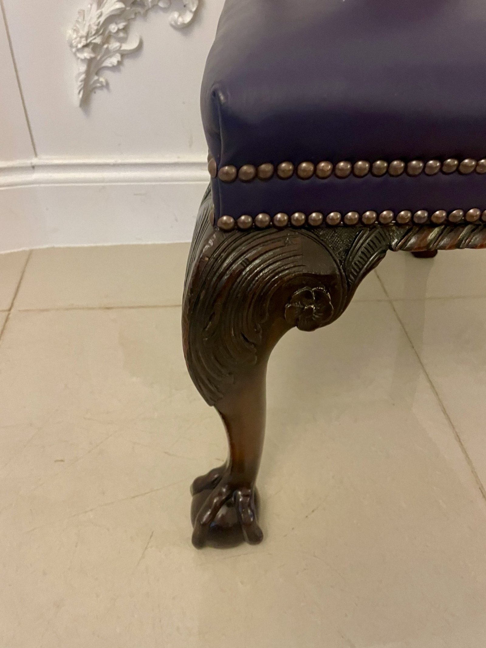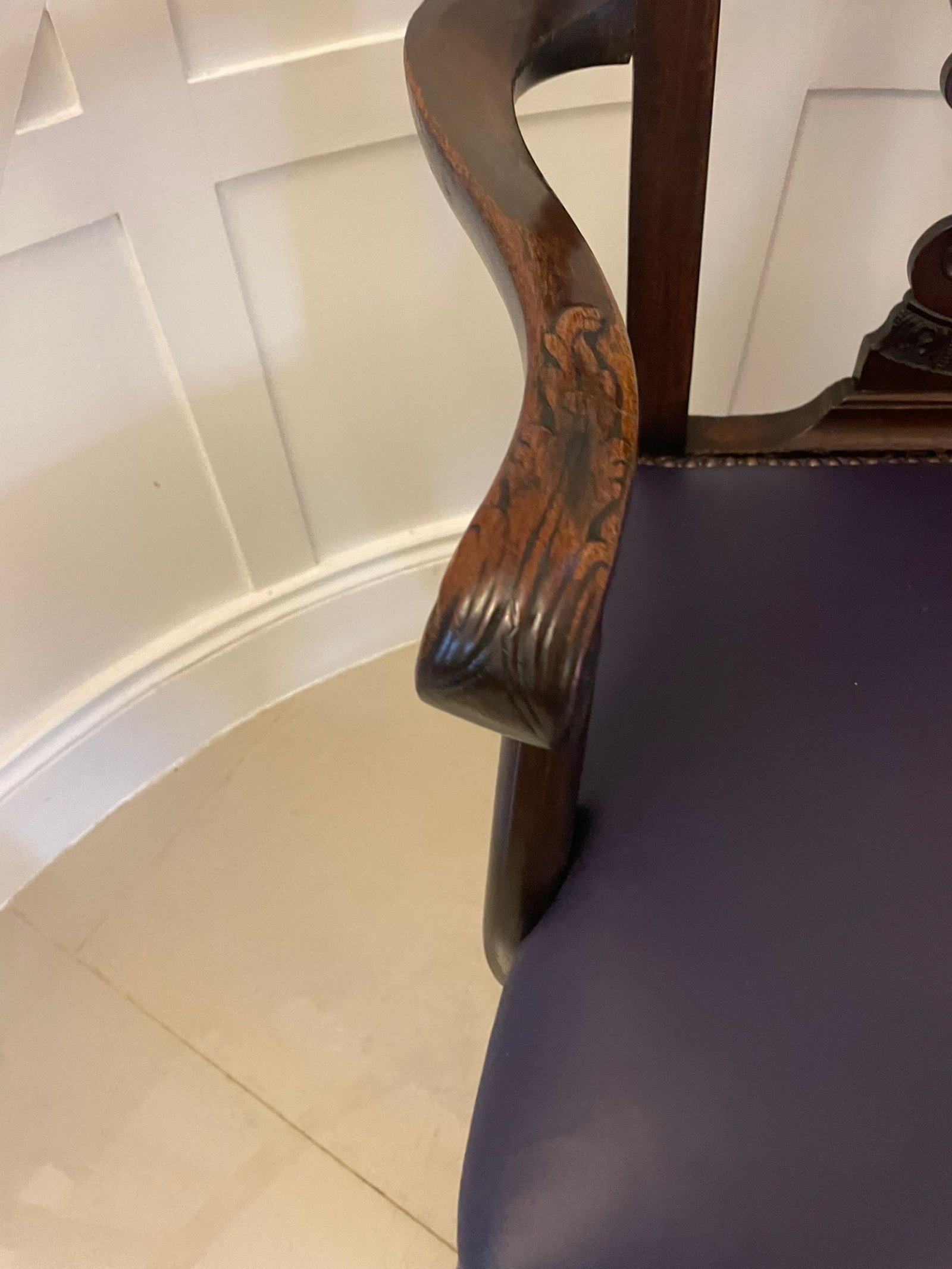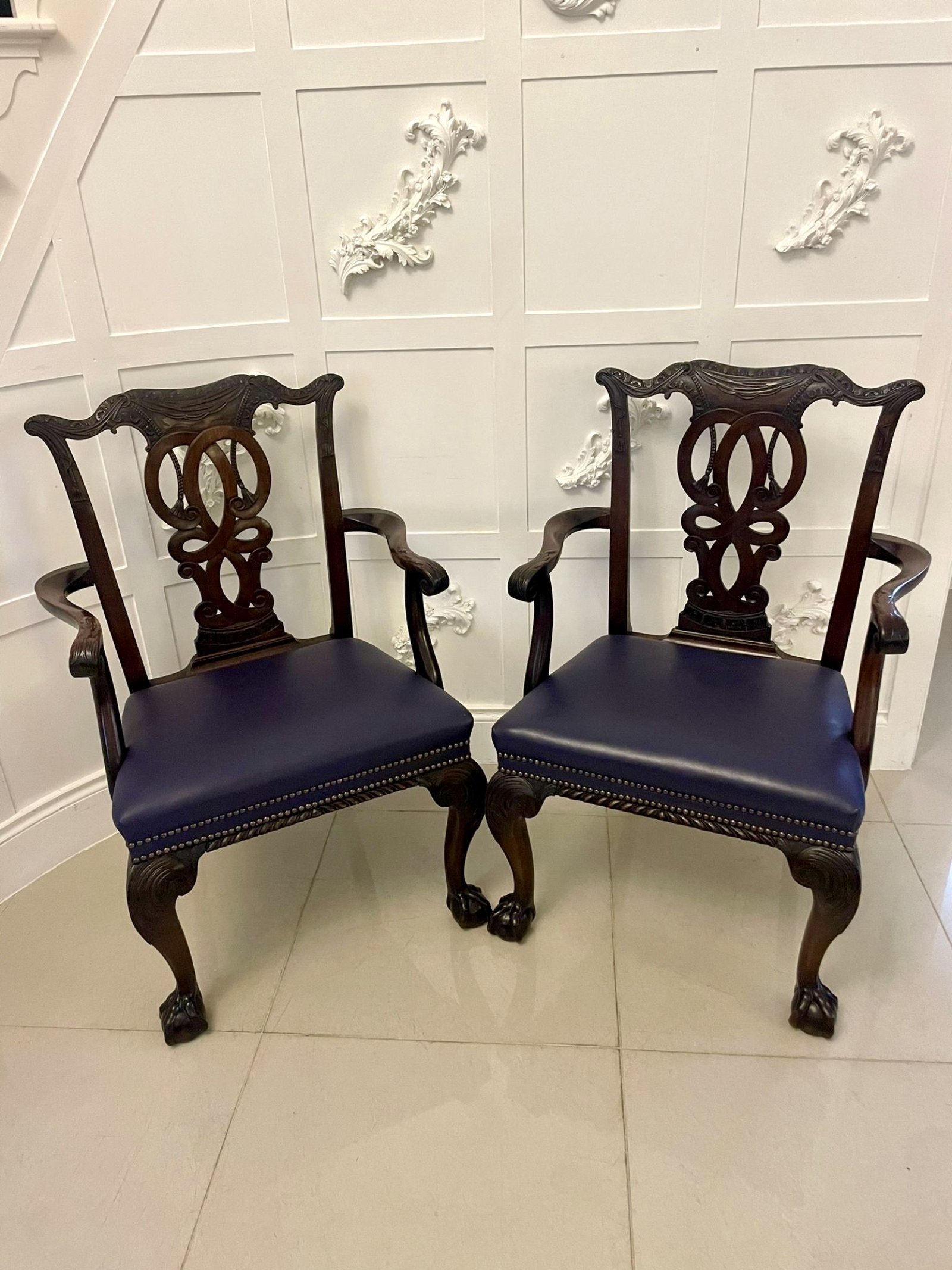 Outstanding quality set of 8 antique Victorian carved mahogany dining chairs consisting of 6 single and 2 elbow chairs having a magnificent carved mahogany back with scrolls, ribbons and bells, newly reupholstered seats in a quality leather standing on carved mahogany shaped cabriole legs with claw and ball feet, out swept back legs with block feet
