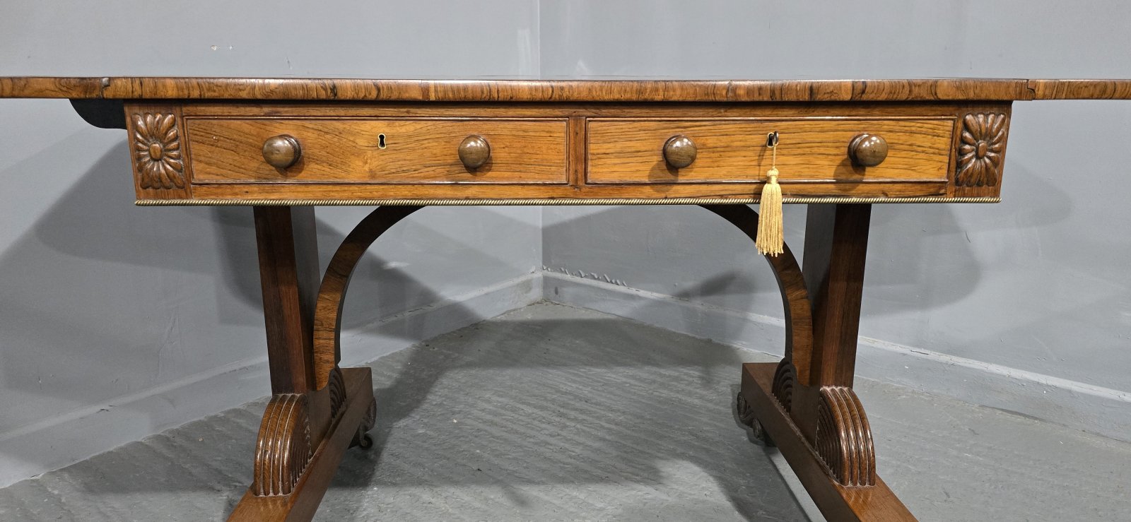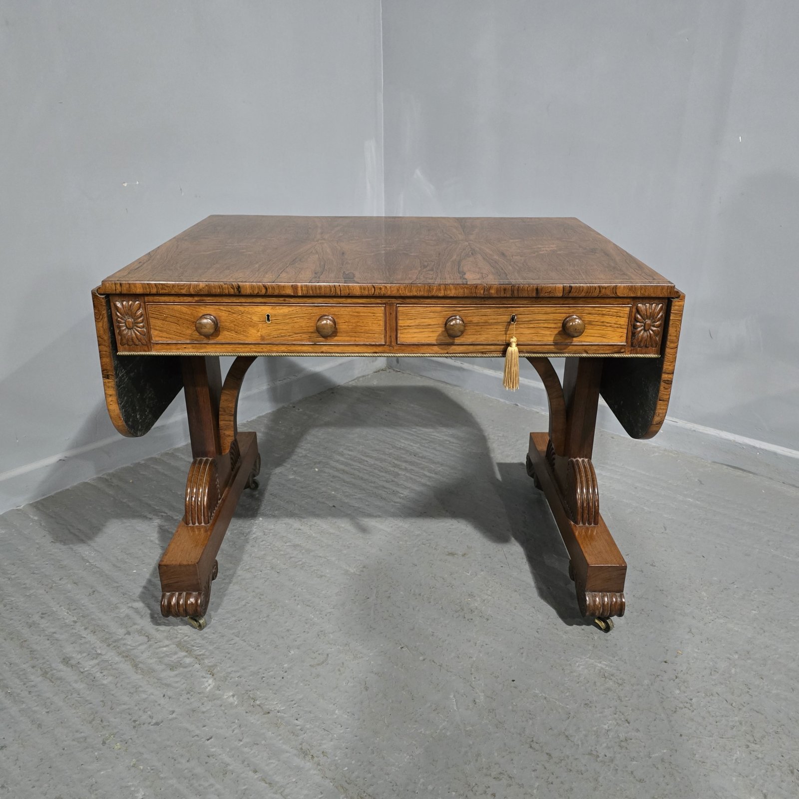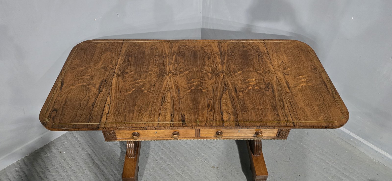 Exceptional brass inlaid, Regency sofa table in rosewood, having stunning figured and brass inlaid drop leaf top above 2 cockbeaded drawers and 2 dummy drawers to opposite side fitted with turned knobs, all raised on elegant supports with reeded decoration united by arched stretcher and terminating in scrolled feet and original castors. This rosewood sofa table has been sympathetically restored and it is ready to place at home.