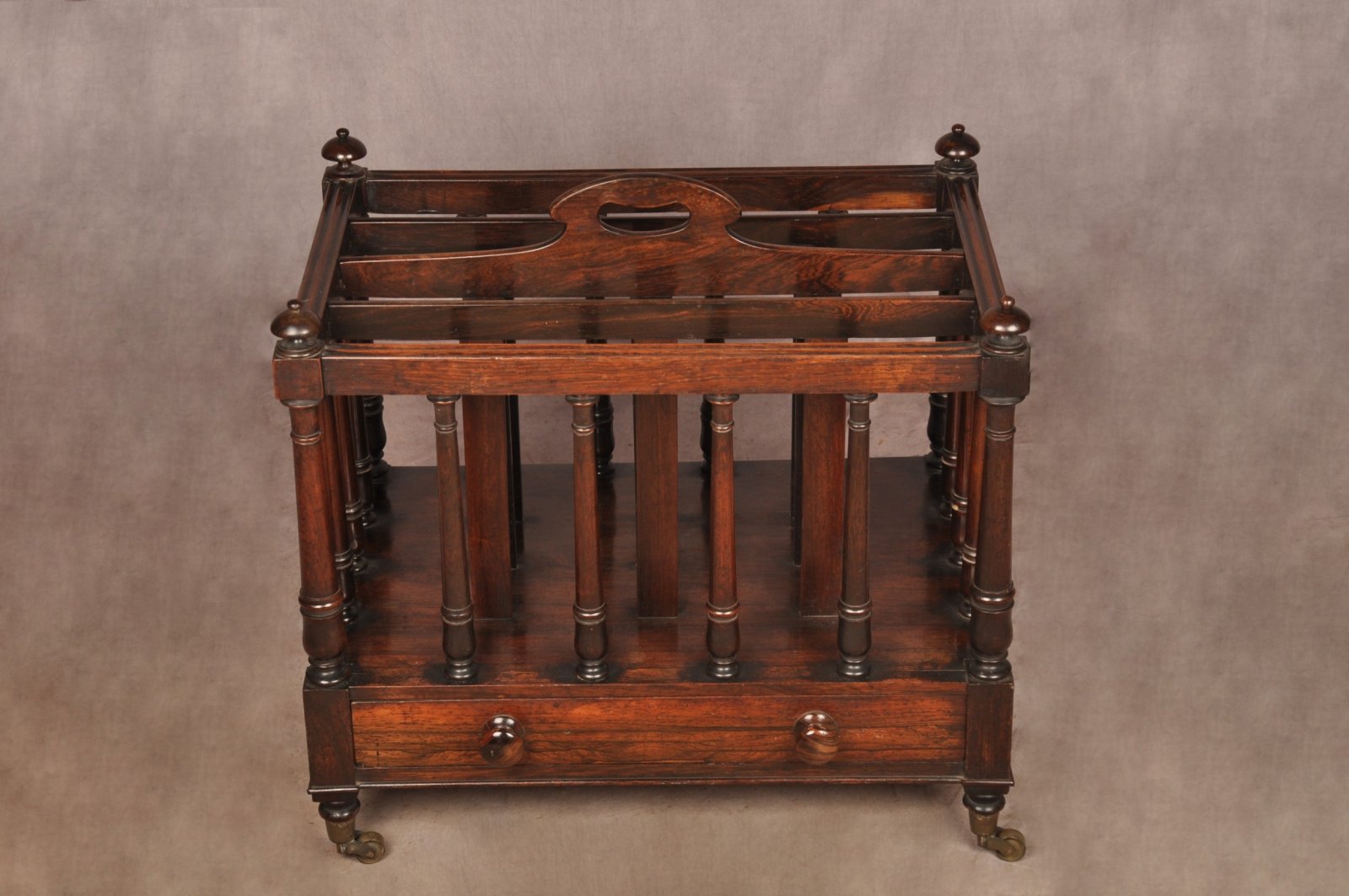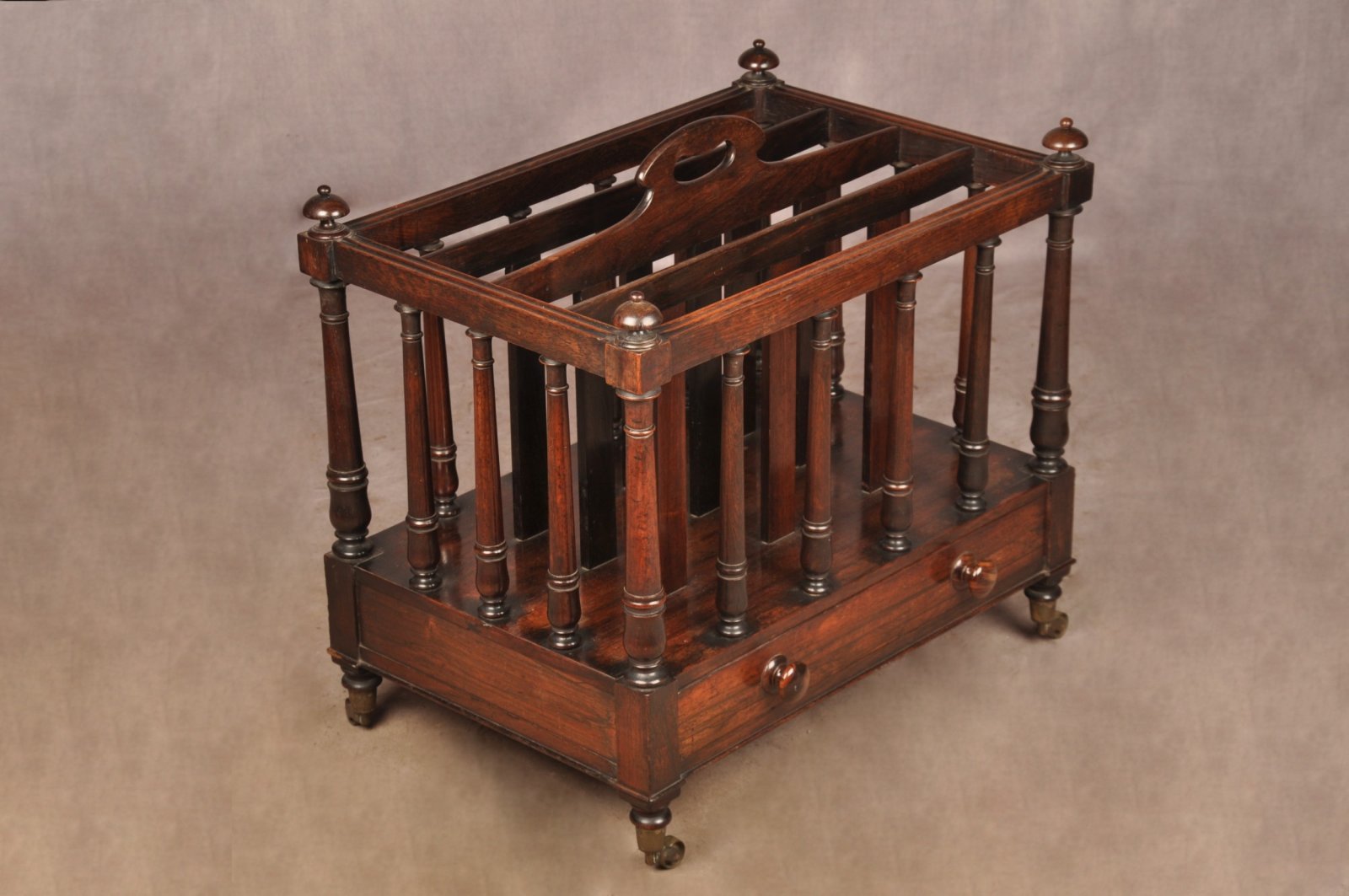A wonderful quality figured Rosewood Canterbury, having superb colour and patina. It is of extremely strong and solid construction. In mint condition, having eighteen beautifully turned uprights fitted to all sides. With carrying handle to the centre and turned finials to the corners. There is a fitted drawer to the base and the piece sits perfectly on the original brass casters.