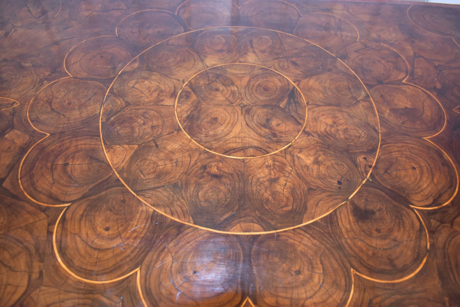 William and Mary chest of drawers in oyster cut laburnum, with holly edging and cross grain mouldings. The top with line scrolling. Also the drawers are all oak lined, a sign of quality, as is the fact that the ends are oyster cut veneers. These chests were made between 1680 and 1710 and are rare survivals. This one has had the feet replaced a long time ago and later handles which are in period with the chest. The second drawer down has a working lock. This is a glorious piece and would look great in any home